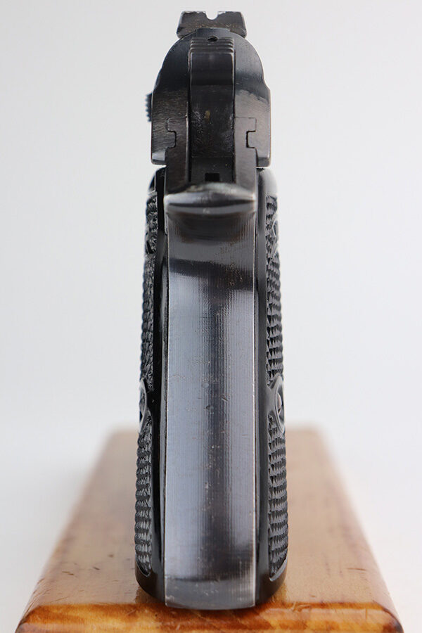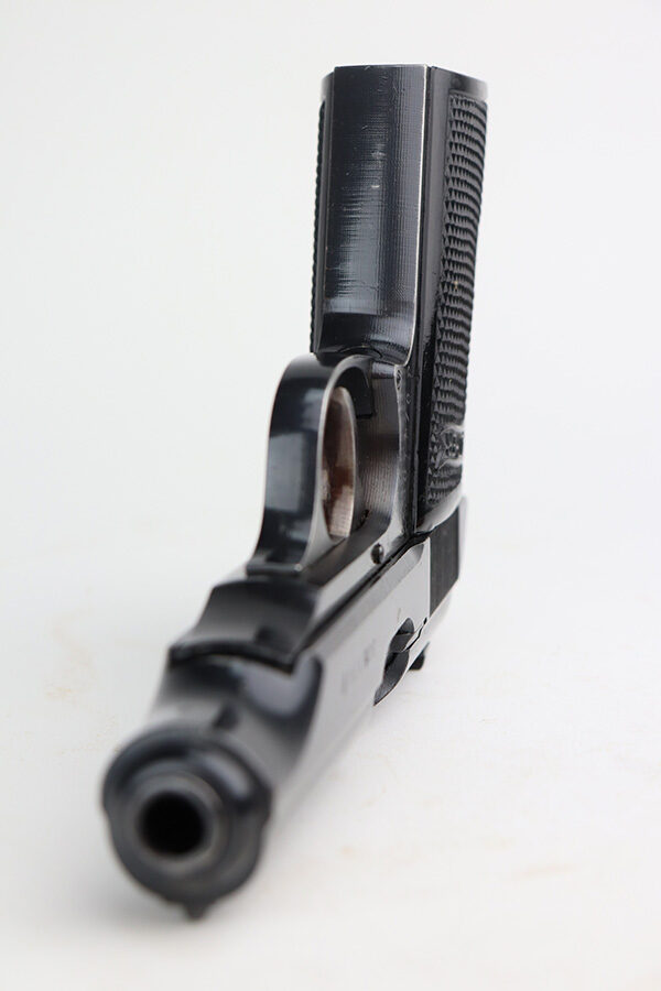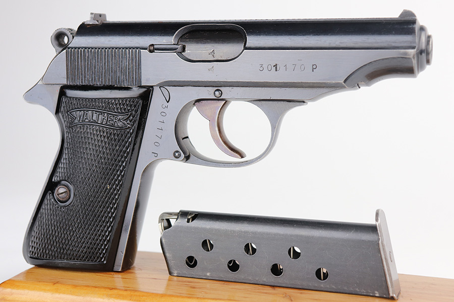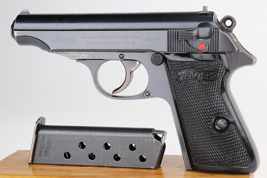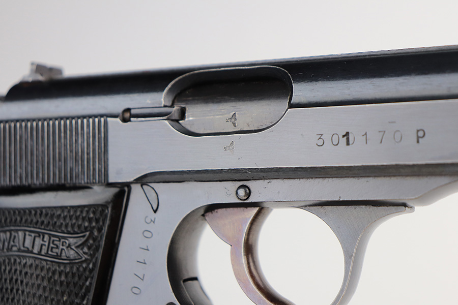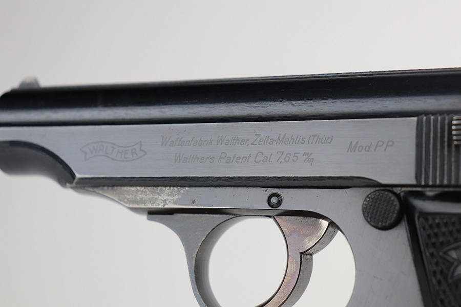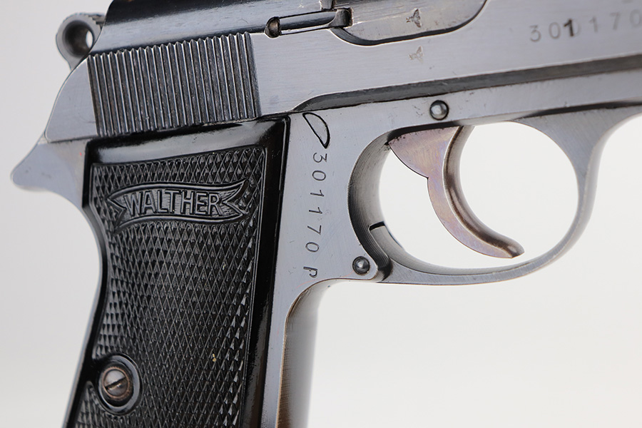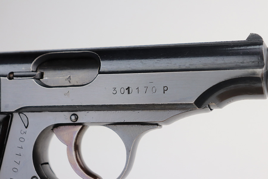 6/10/21 – This is an excellent example of a Walther PP sold in the commercial market in 1943. The gun is matching and has the proper “Eagle N” proofs. It has retained about 97% of its original bluing. There is an area of discoloration and pin-pricking toward the front of the left side of the frame. Just a hint of wear on the high edges of the slide and around the muzzle. A few tiny handling marks on the straps. Comes with excellent grips. The gun is photographed with a post-war magazine. We’ve replaced that with a proper wartime magazine. Mint bore.