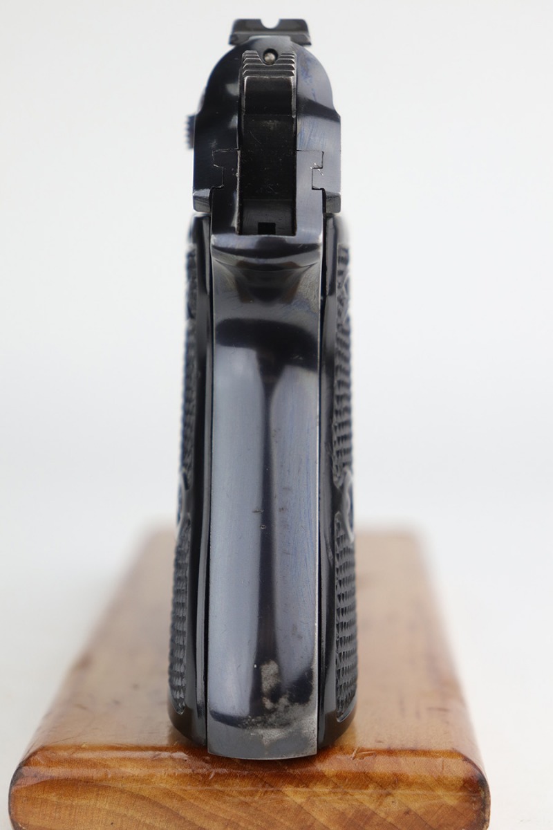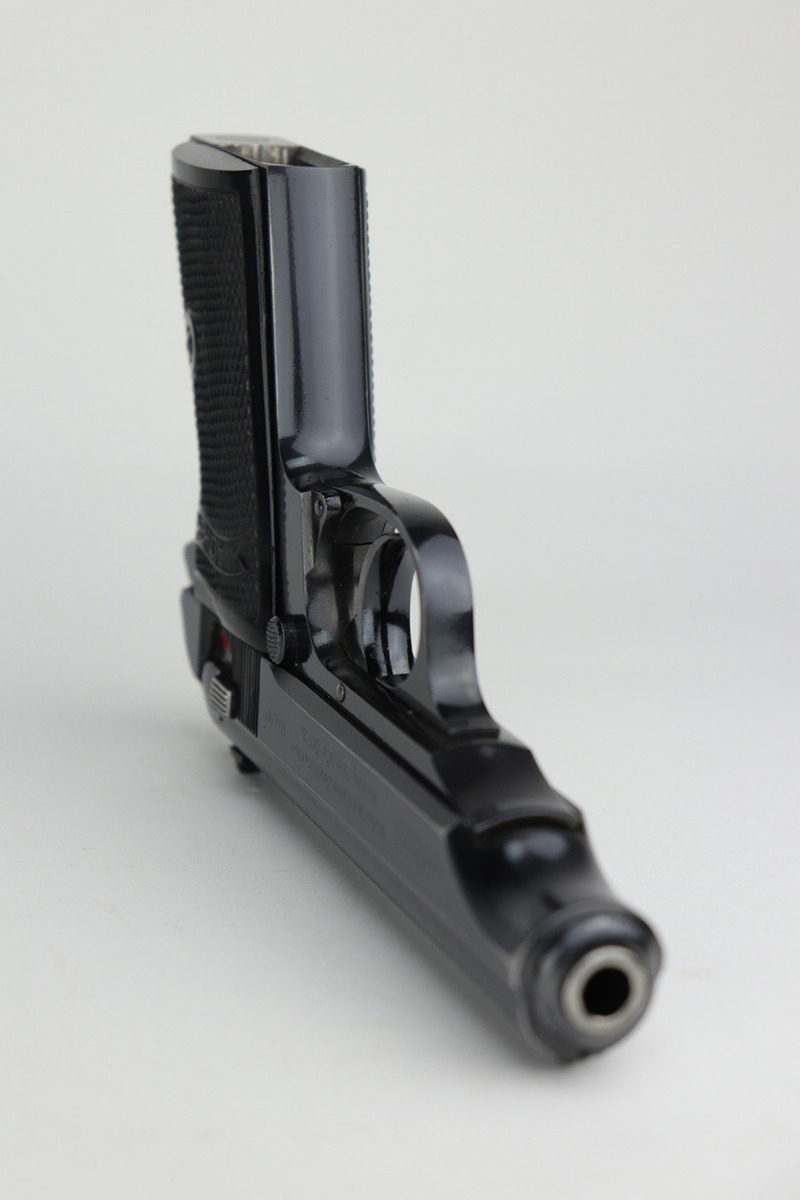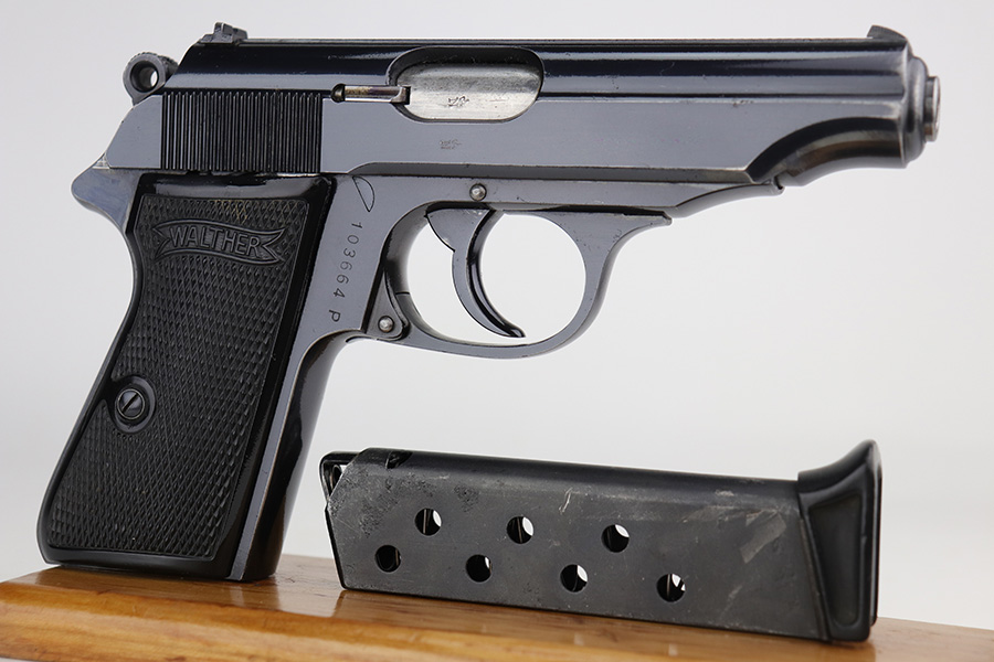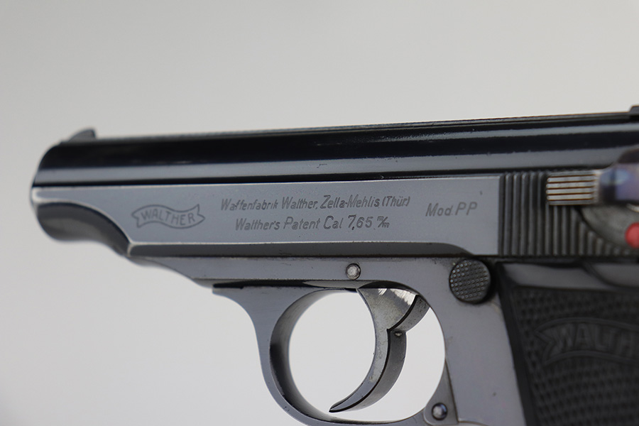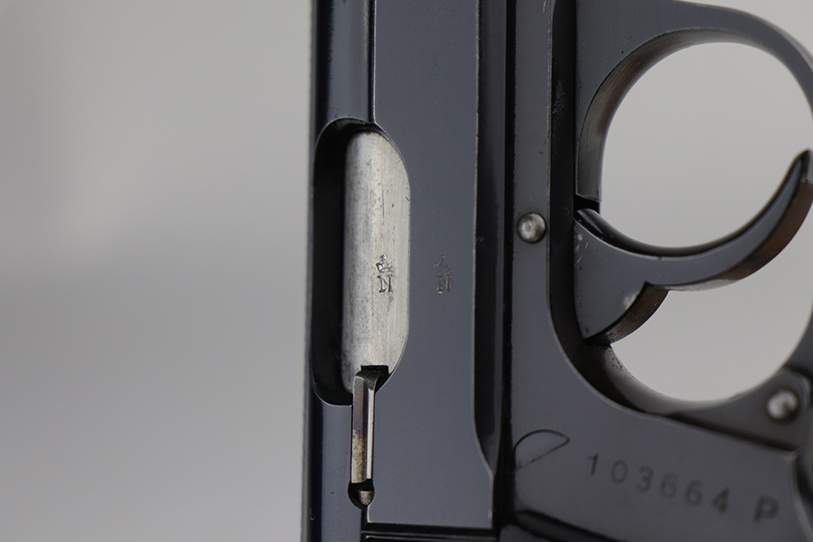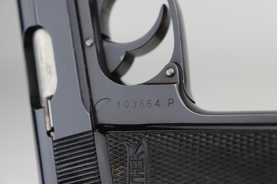 9/27/21 – This is an excellent example of a Walther PP sold in the commercial market in 1938. It is all matching and has the proper “Crown N” commercial proofs. It has retained about 95% of its original high polish finish. There is very minor wear on the high edges of the slide and around the muzzle. A few tiny handling marks on the back strap and an area of wear at the base of the back strap. Comes with excellent black bakelite grips and a period-correct finger extension magazine. There is a factory over-stamp on the magazine. You can see that they initially stamped it “9mm” and stamped over it to read “7.65mm”. The bore is mint.