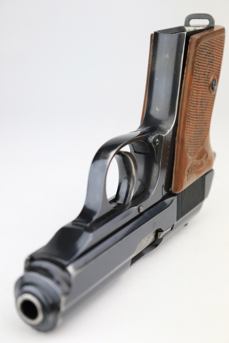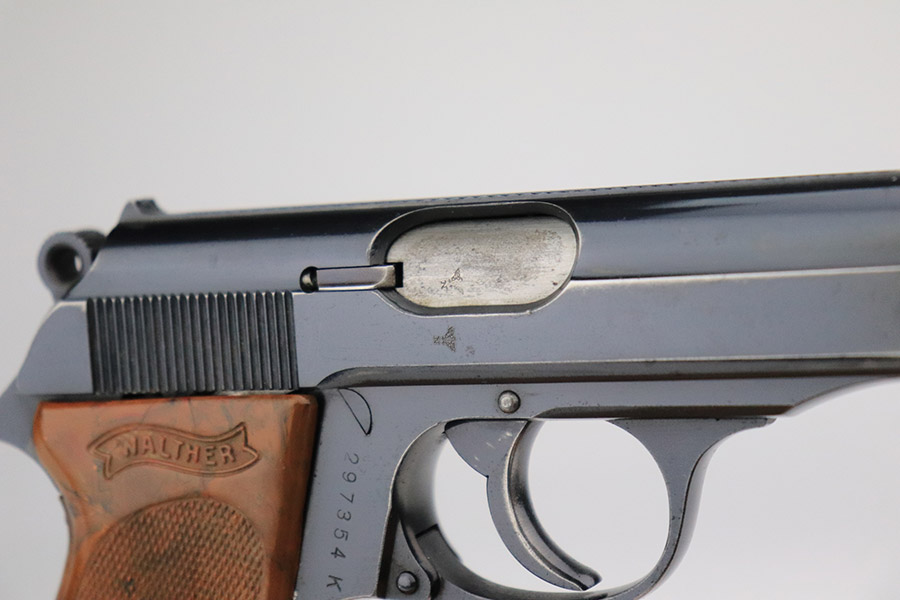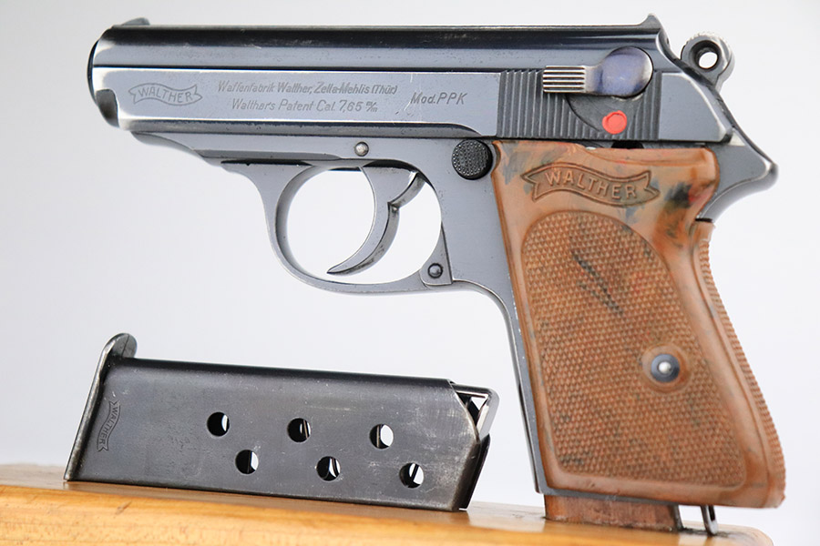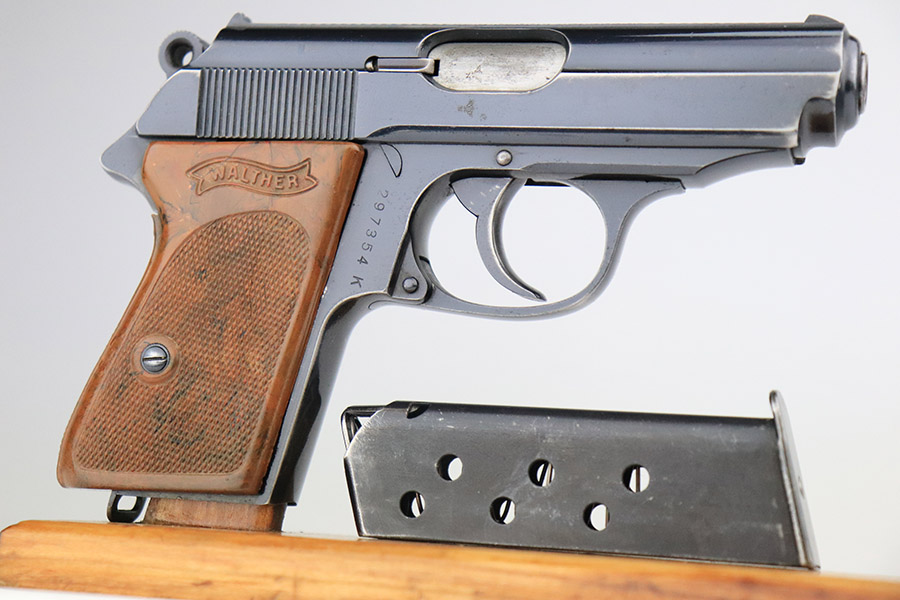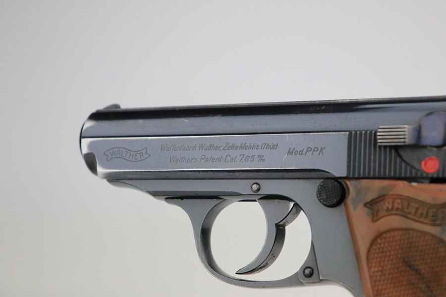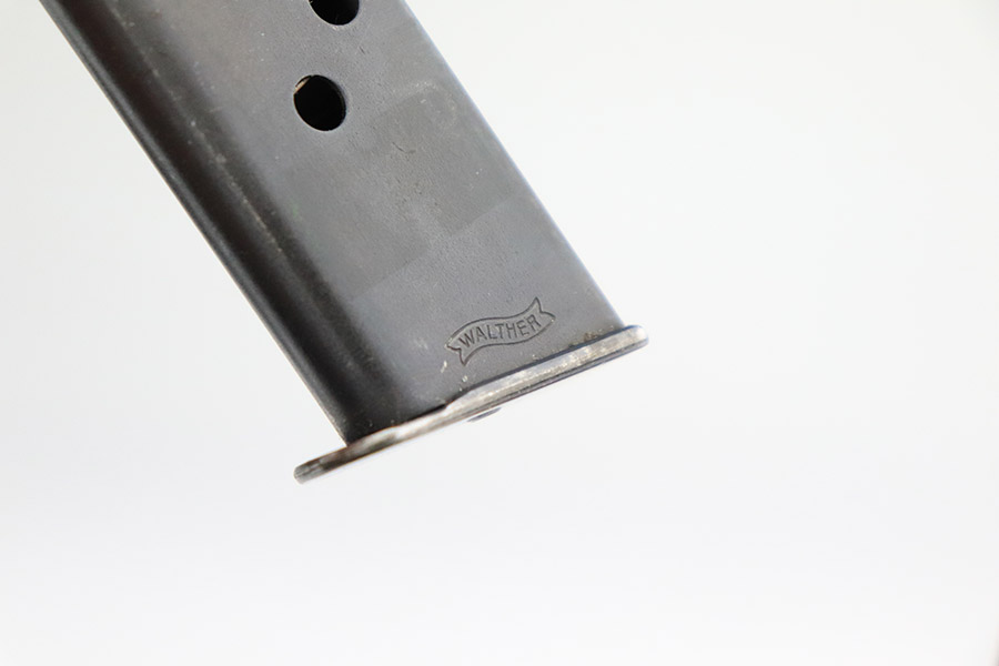11/2/22 – This is an excellent example of a Walther PPK sold in the commercial market in 1940. The gun is all matching and has the proper “Eagle N” commercial proofs. It has retained about 96% of its original finish with minor muzzle wear and very minor wear on the high edges of the slide. Also some very minor thinning on the front strap. Comes with a very nice Brown Walther grip (tiny crack in the spine) and a Walther banner-only magazine. The bore has strong rifling, but there is some very minor freckling throughout.