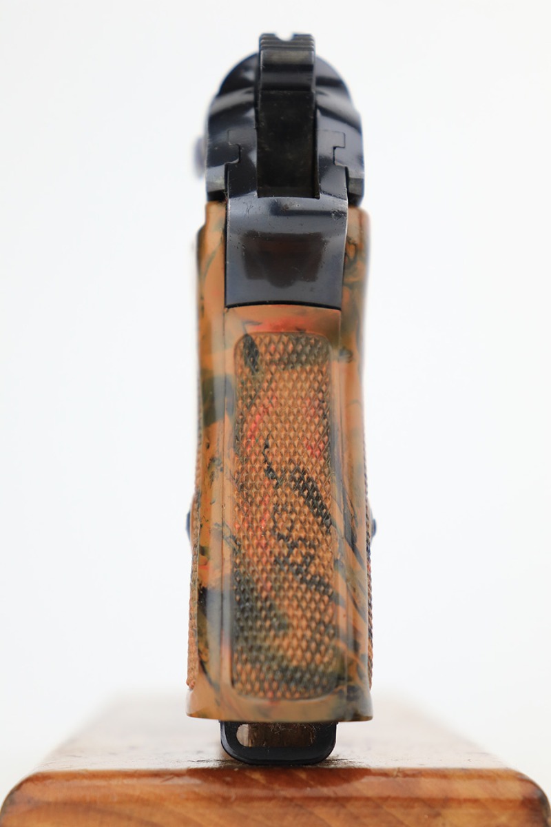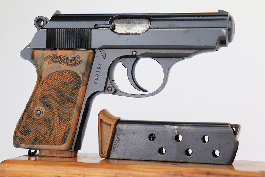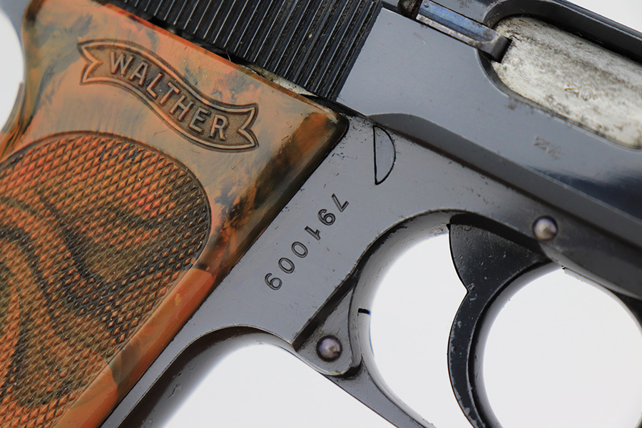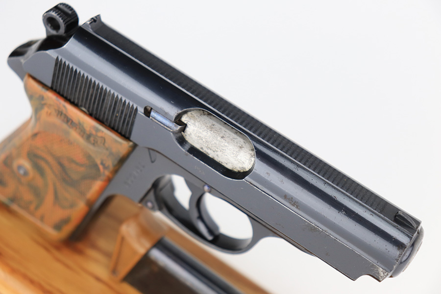 4/18/23 – This is an excellent example of a Walther PPK sold in the commercial market in 1934. All matching with the proper “Crown N” proofs. It has retained nearly all of its original high polish finish with very minor muzzle wear. While there is very little actual finish loss, there are a few small spots of minor oxidation and tiny pitting on the right side of the slide. Excellent brown grip – no cracks or chips. Comes with a period-correct early finger extension magazine. Near-mint bore.