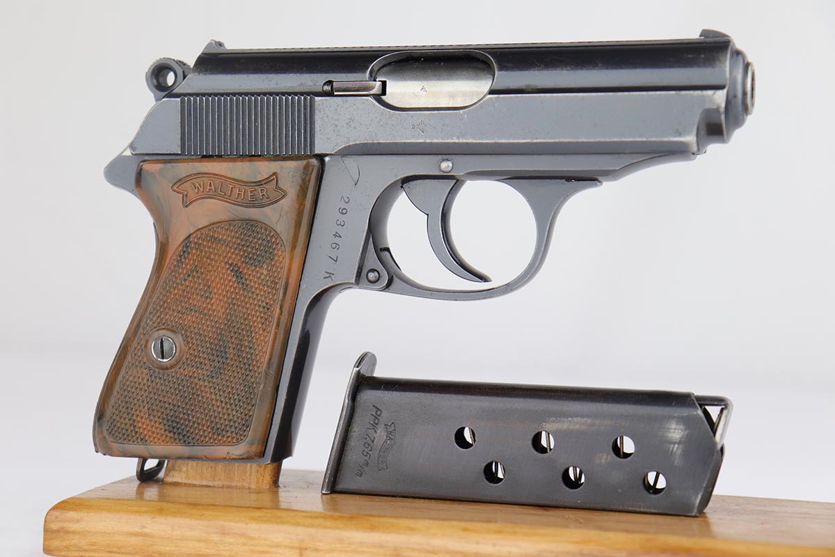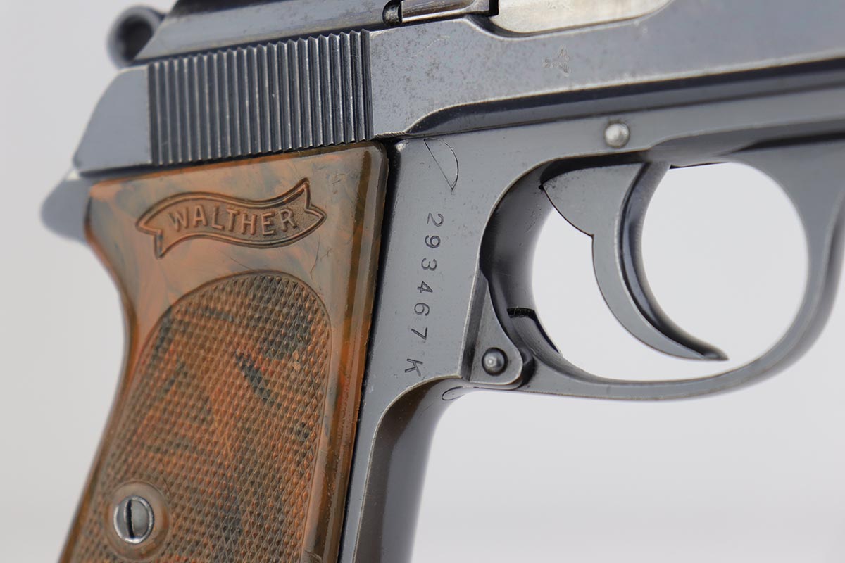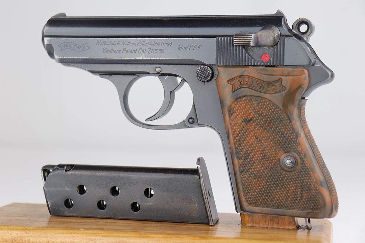 4/22/19 – This is an excellent example of a WWII-era Walther PPK with a beautiful high-polish finish. This particular gun is a commercial pistol and was manufactured in 1940. It is properly “Eagle N” marked. Overall, the gun is in excellent condition – we’d rate the finish about 96-97%. There are only a few very small surface level scratches in a few areas and very minor high-edge wear, especially around the muzzle. The bore is gorgeous – shiny with very strong rifling, 9.5/10. The brown grip is in excellent shape with just a few very minor scuffs here and there. It has a blued, period-correct Walther magazine. The gun functions properly. No import marks. C&R eligible.