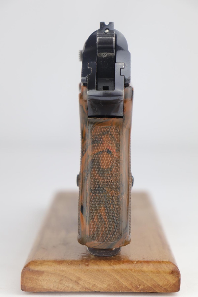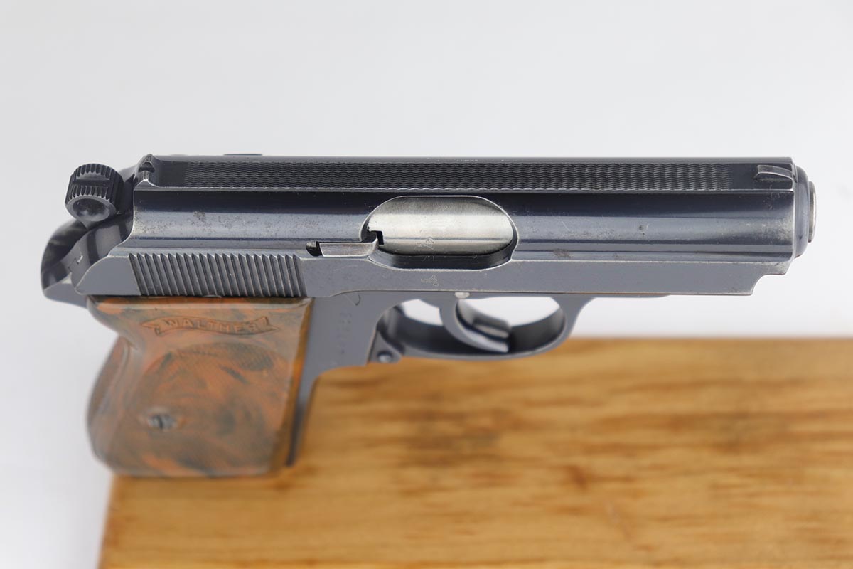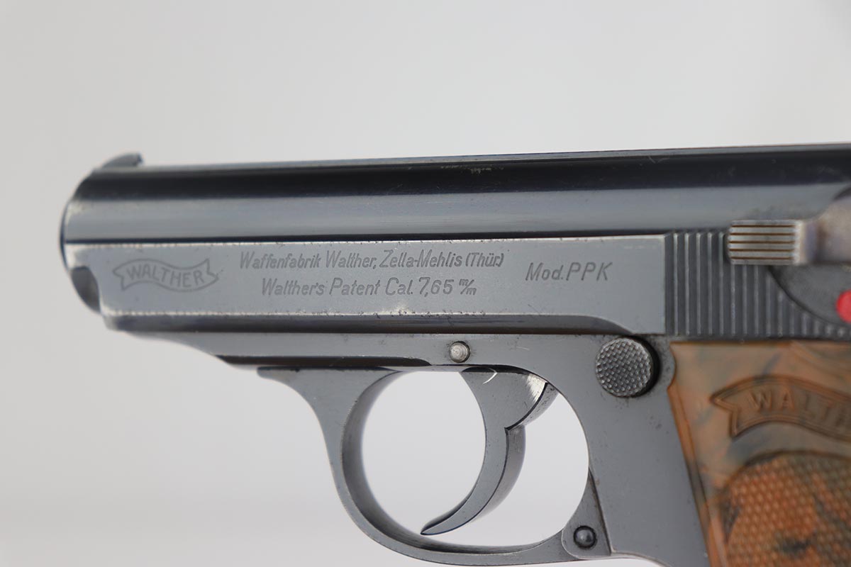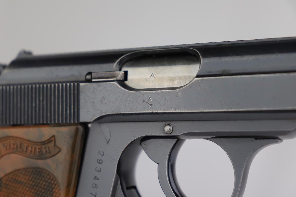 4/22/19 – This is an excellent example of a WWII-era Walther PPK with a beautiful high-polish finish. This particular gun is a commercial pistol and was manufactured in 1940. It is properly “Eagle N” marked. Overall, the gun is in excellent condition – we’d rate the finish about 96-97%. There are only a few very small surface level scratches in a few areas and very minor high-edge wear, especially around the muzzle. The bore is gorgeous – shiny with very strong rifling, 9.5/10. The brown grip is in excellent shape with just a few very minor scuffs here and there. It has a blued, period-correct Walther magazine. The gun functions properly. No import marks. C&R eligible.