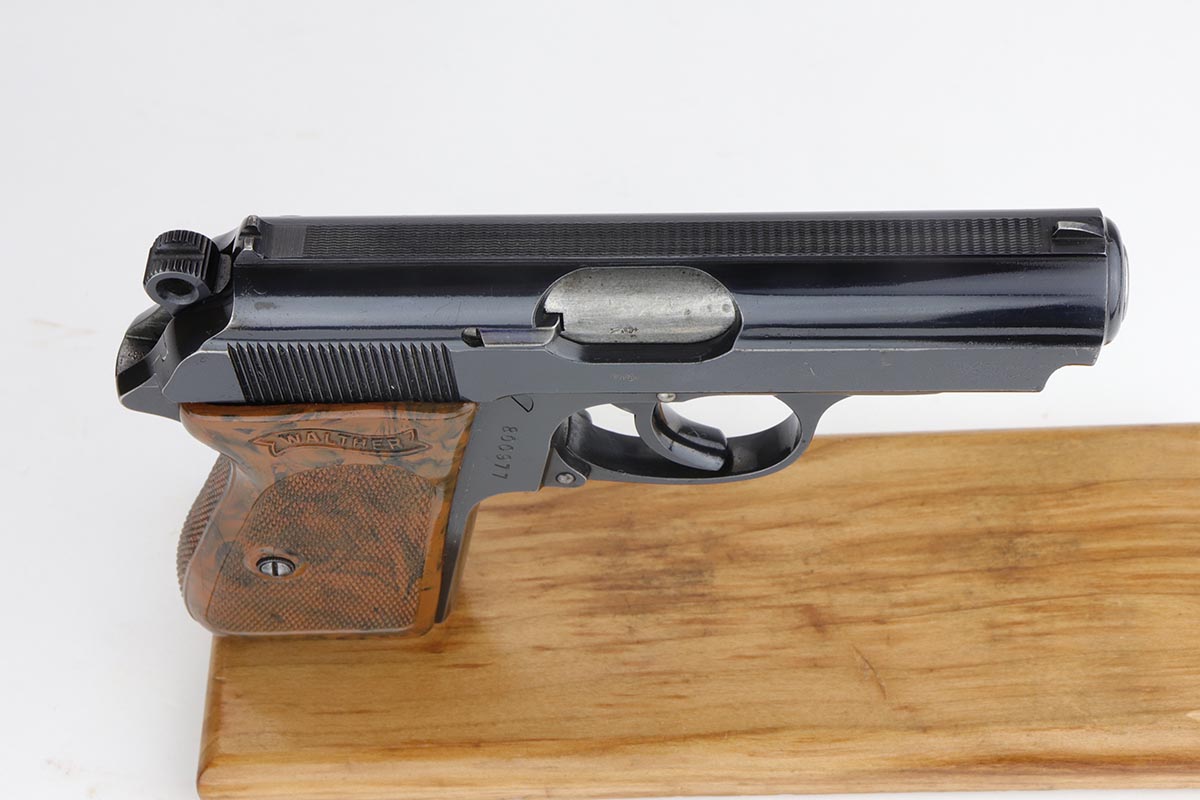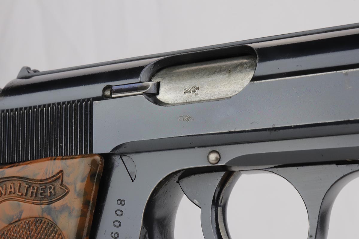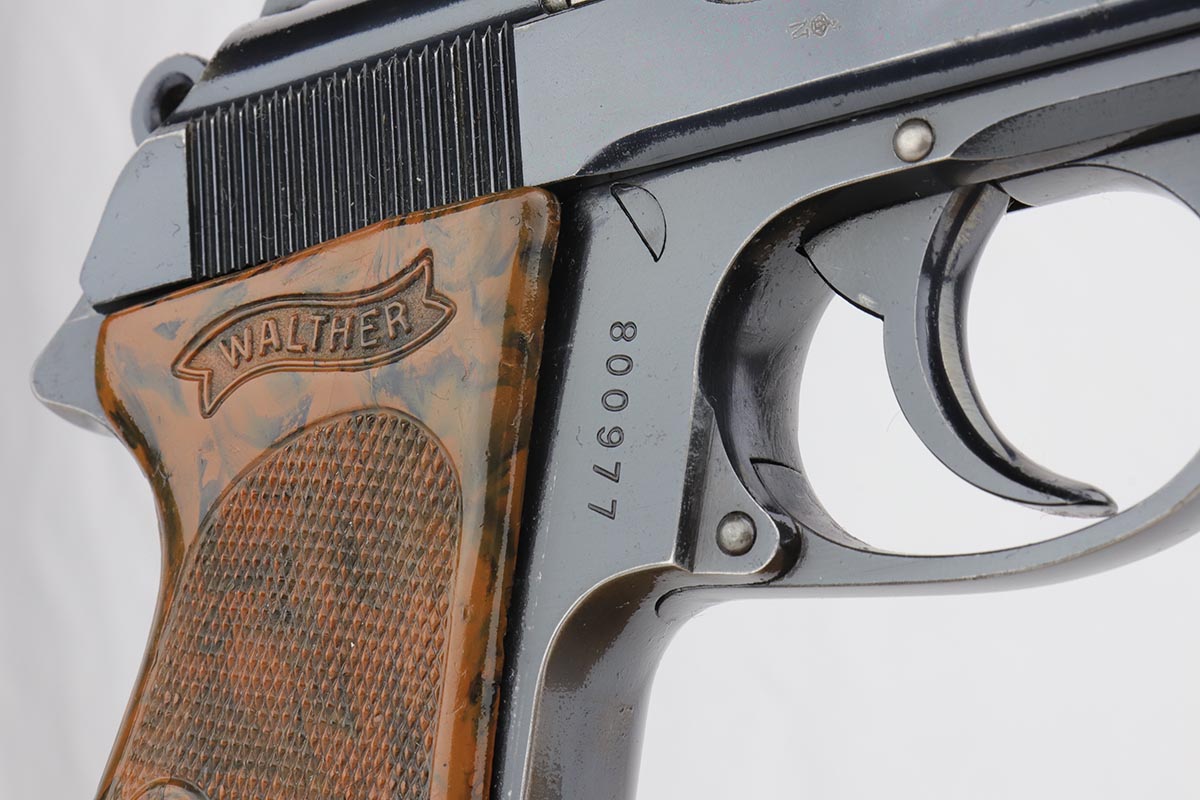 9/24/19 – This is a terrific example of an early commercial Walther PPK from the early 1930s. The original high-polish blue rates at 97-98% with minor muzzle wear on either side of the slide, and some patina on the front strap. There are also a few scratches on the underside of the frame, toward the forward end. Early 90 degree safety. Nice, original grip though it does have the common stress crack in the spine. Excellent finger extension magazine. Minty bore.