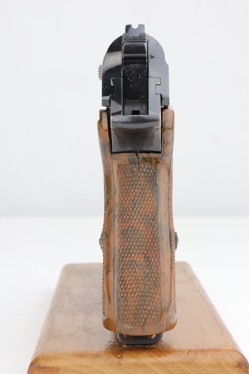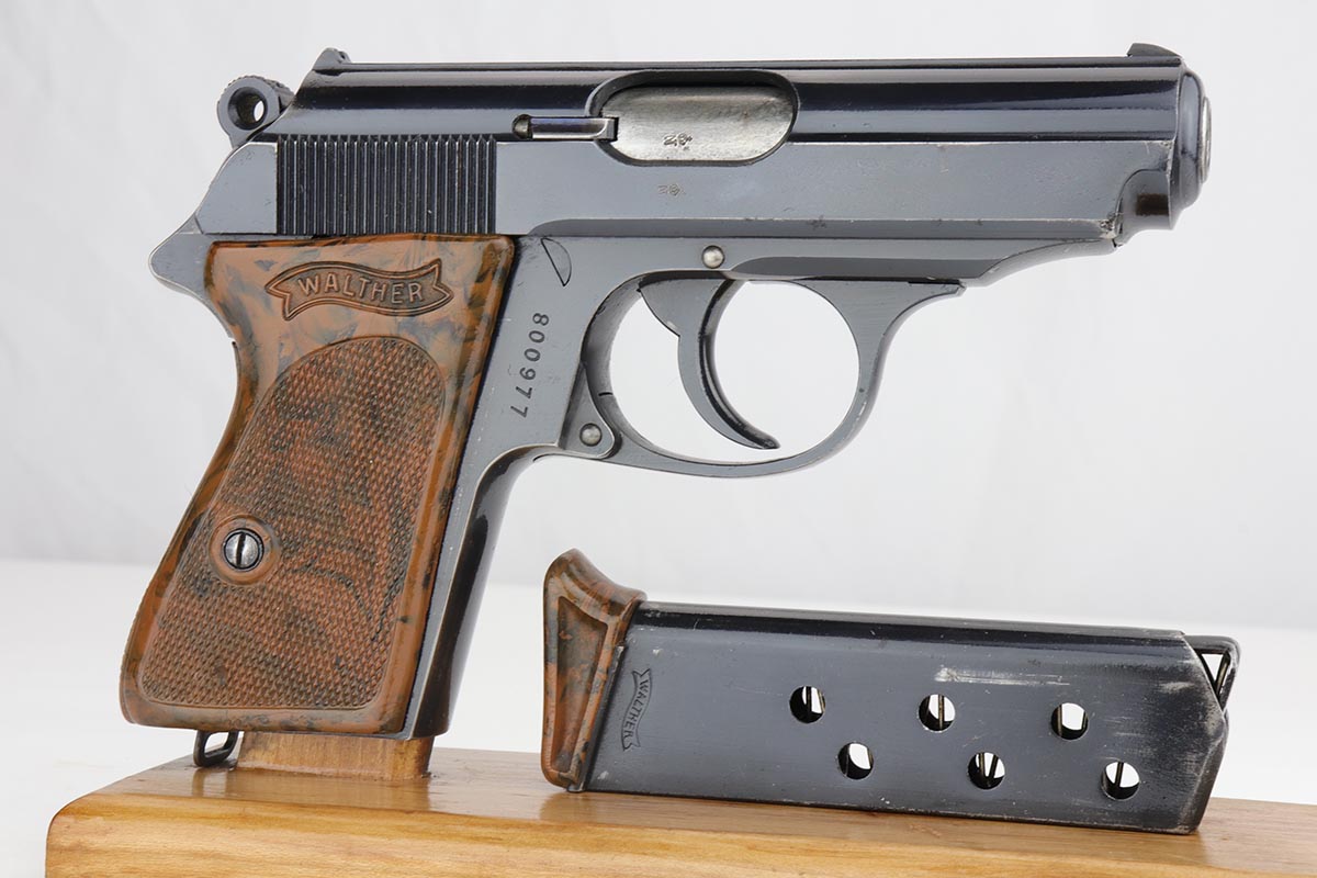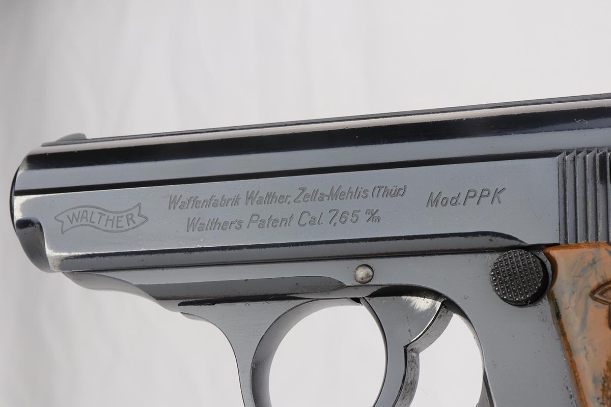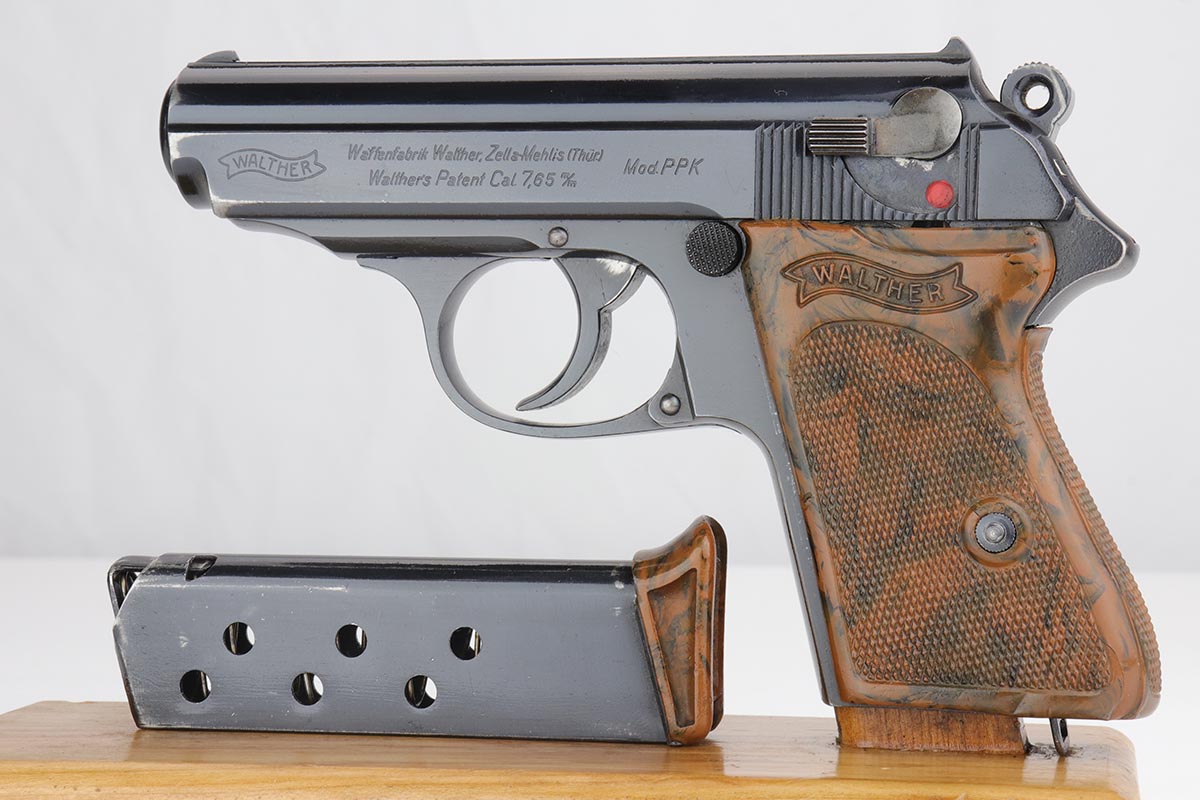 9/24/19 – This is a terrific example of an early commercial Walther PPK from the early 1930s. The original high-polish blue rates at 97-98% with minor muzzle wear on either side of the slide, and some patina on the front strap. There are also a few scratches on the underside of the frame, toward the forward end. Early 90 degree safety. Nice, original grip though it does have the common stress crack in the spine. Excellent finger extension magazine. Minty bore.