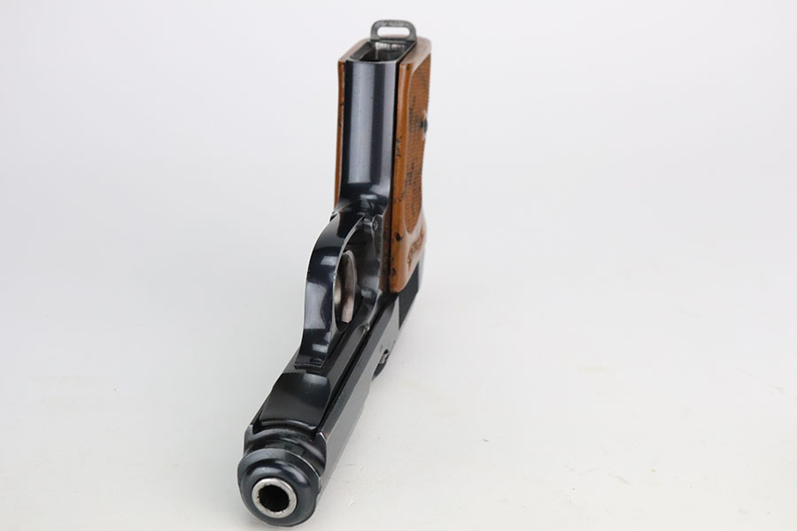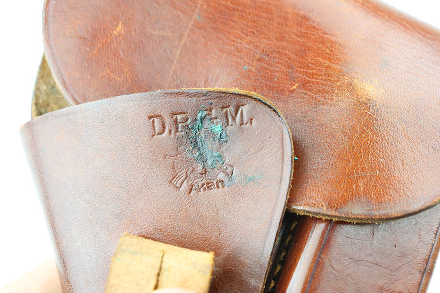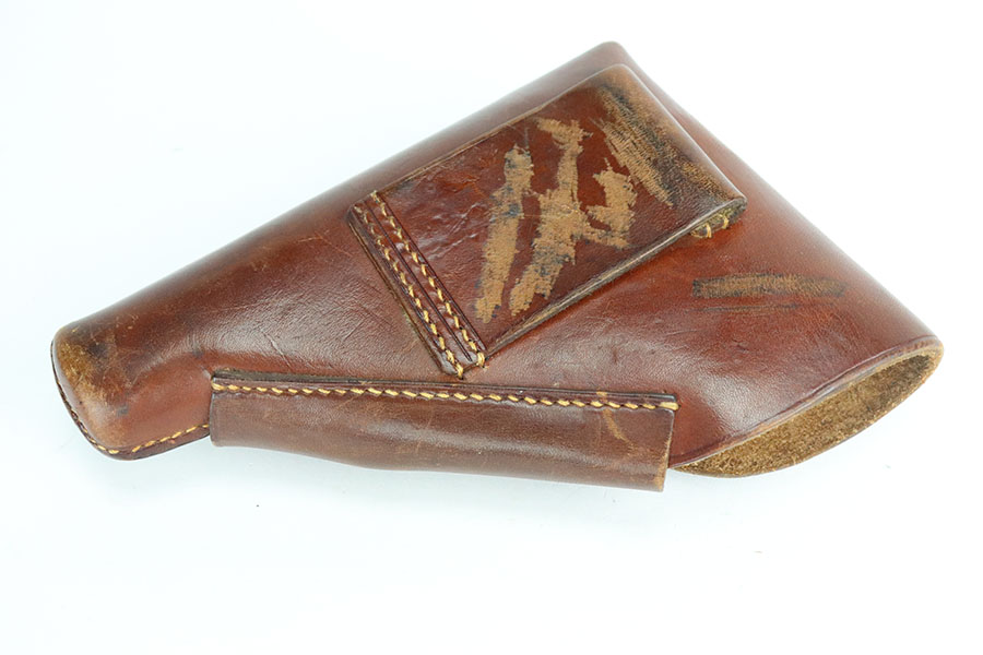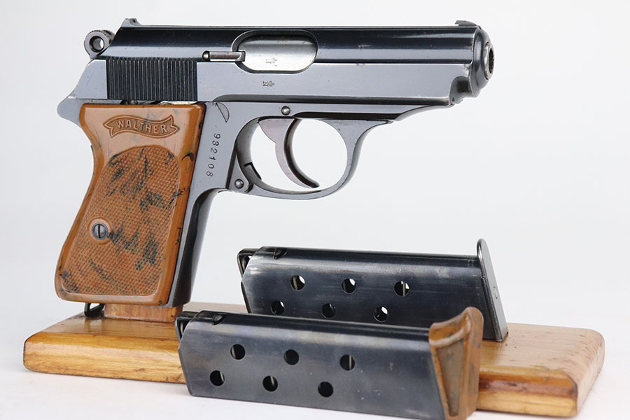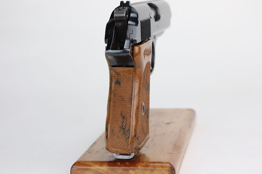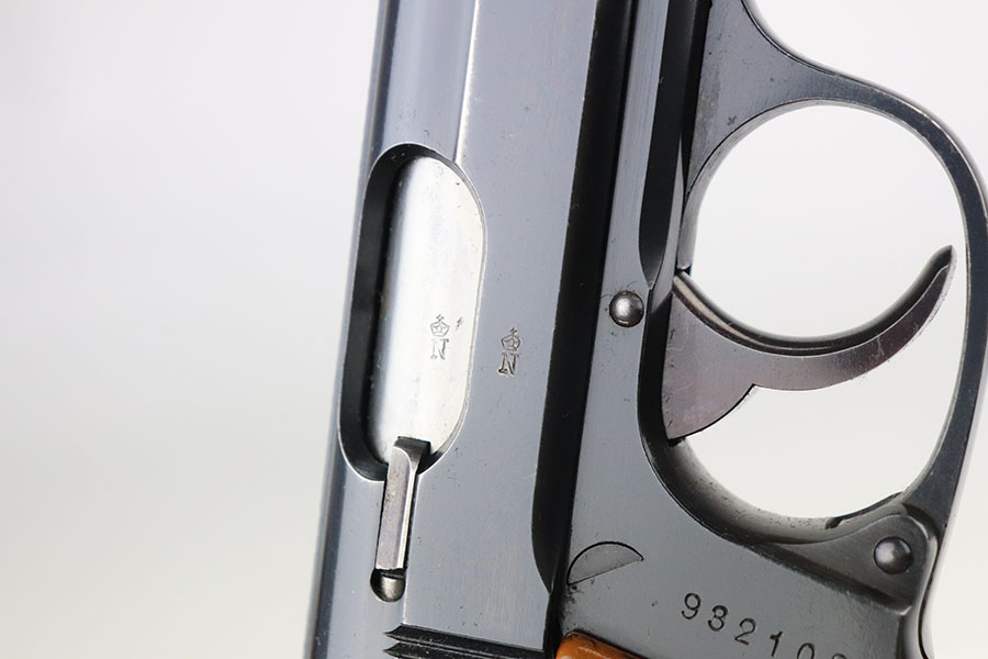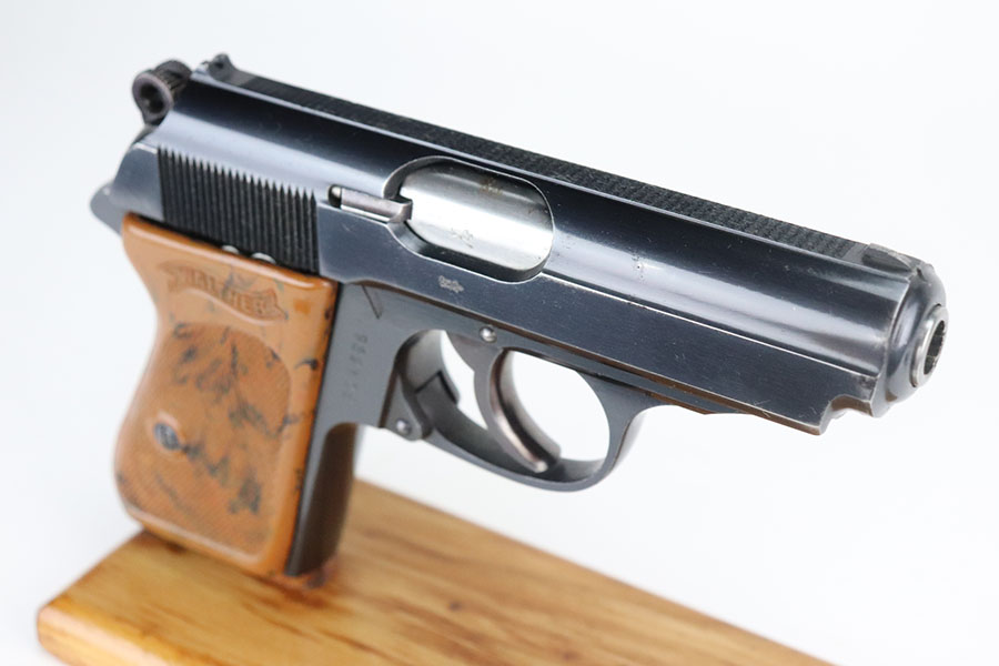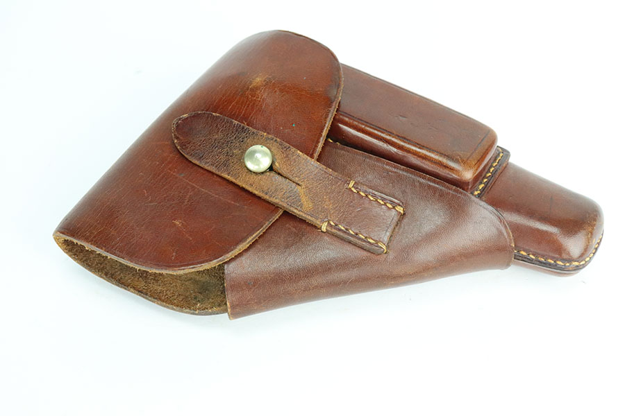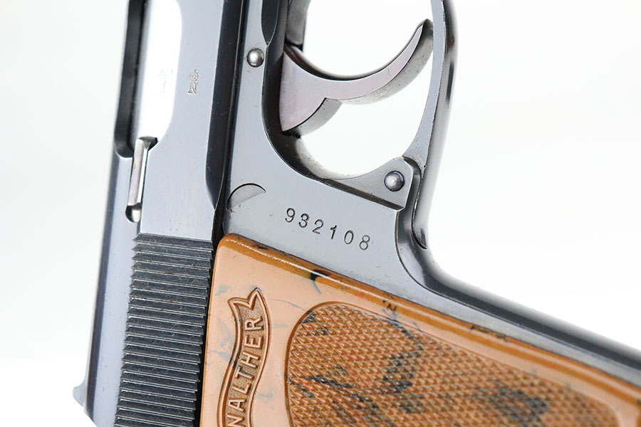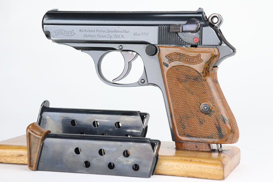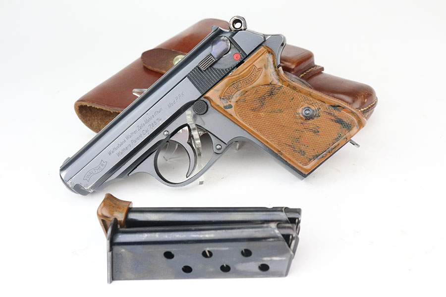 7/28/21 – This is an excellent and complete commercial Walther PPK rig from 1936. The pistol has about 97% of the original, high-polish blue remaining. Nearly all of the wear is on either side of the muzzle but there is also some freckling in those areas. Crown/N proofs with early 90 degree safety. Mint bore, hardly looks used. Beautiful grip with no cracks. Excellent finger extension magazine, as well. Rig includes a flat-bottom spare magazine and a very nice Akah holster with internal inkstamp.
