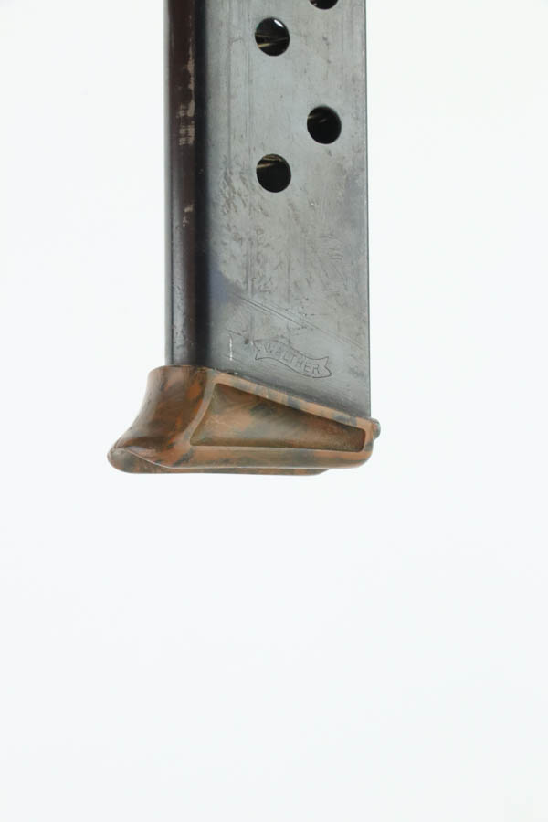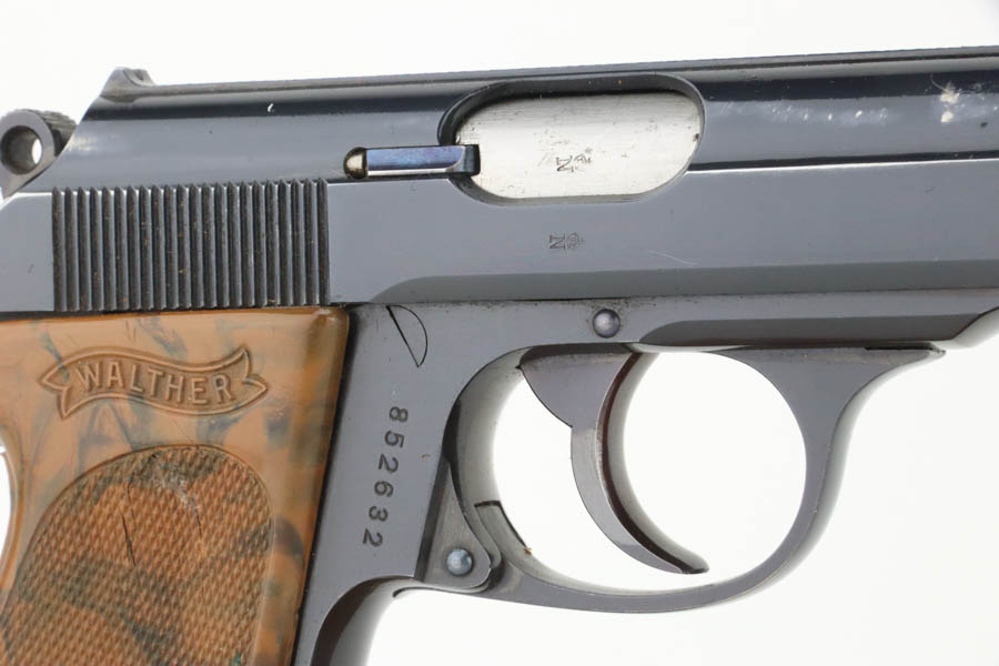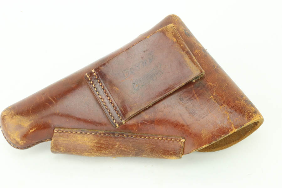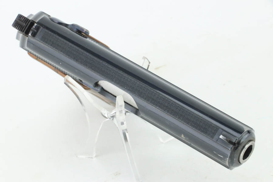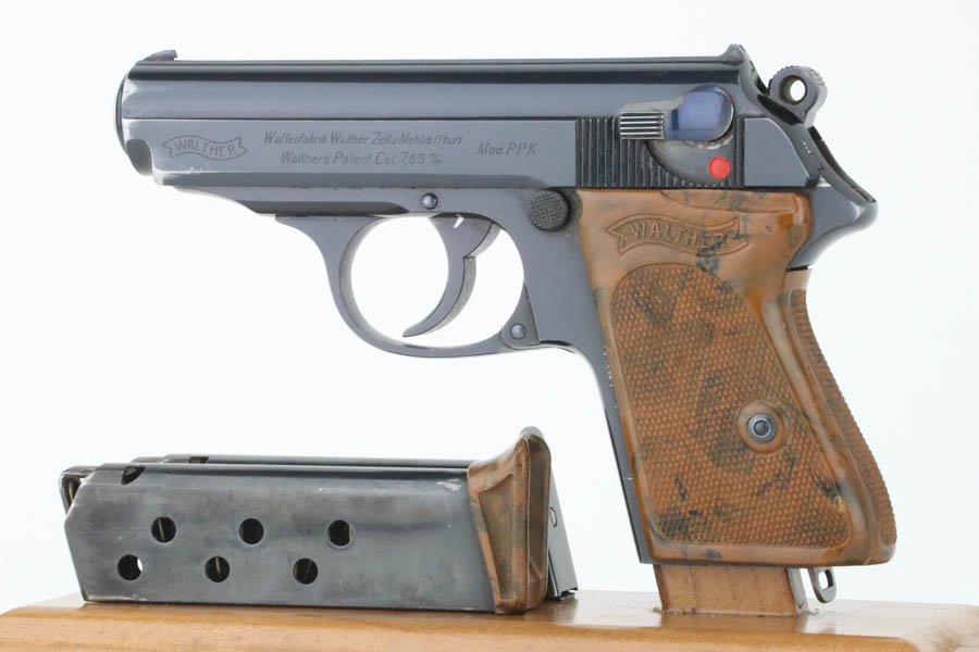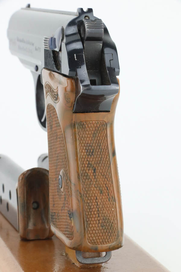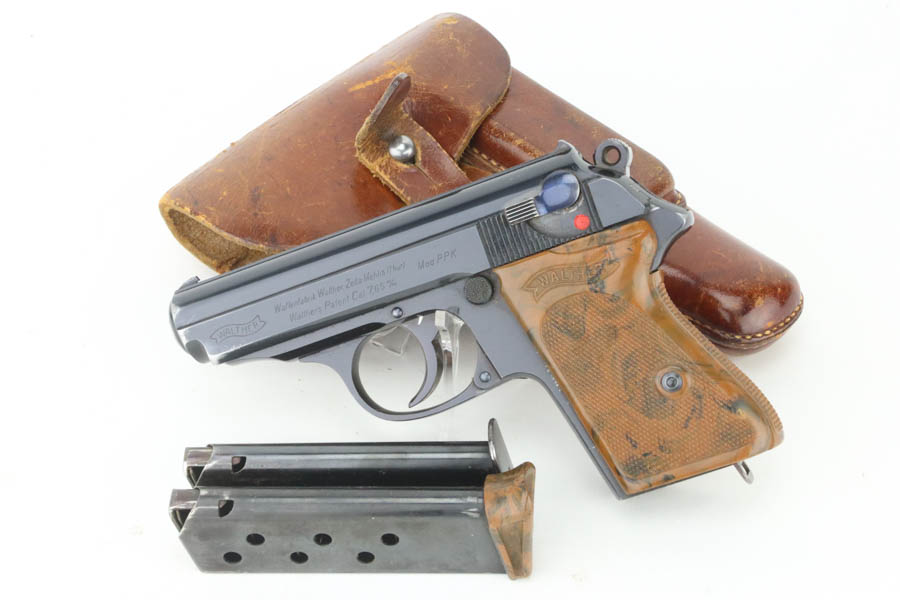 8/7/24 – This is an excellent example of Walther PPK sold in the commercial market in 1935. All matching and “Crown N” proofed. It comes as a rig with a tan leather Akah holster, one finger extension magazine, and one flat bottom magazine. The gun’s original high polish bluing rates about 96% with just minor muzzle wear and a few a few small dots of wear on the right side of the slide. Fitted with a brown Walther grip – a couple of small cracks on the right side. Minty bore.