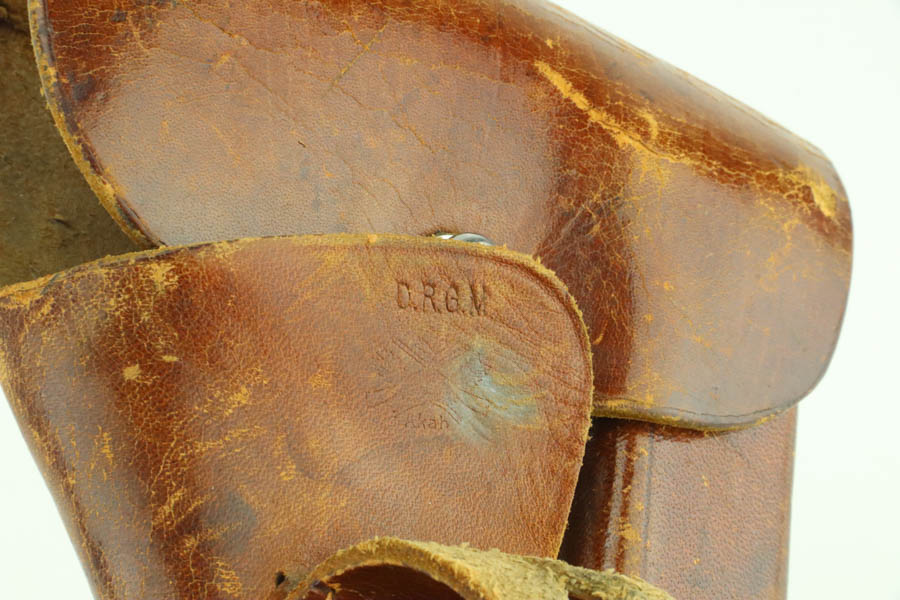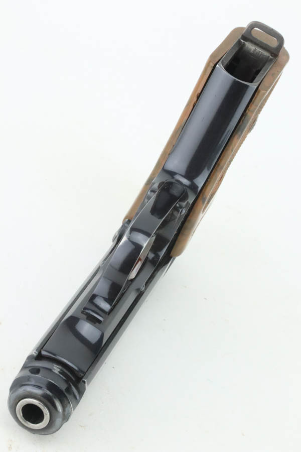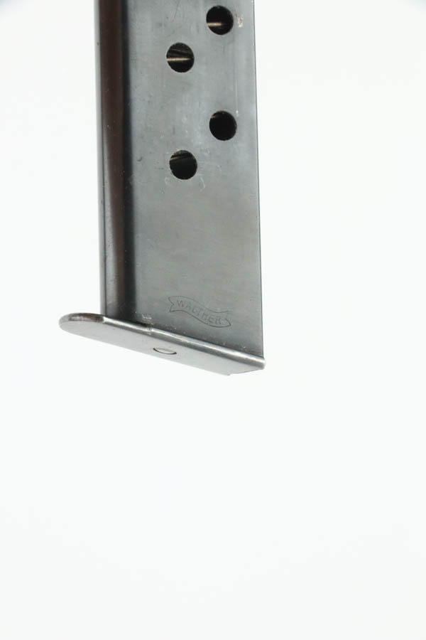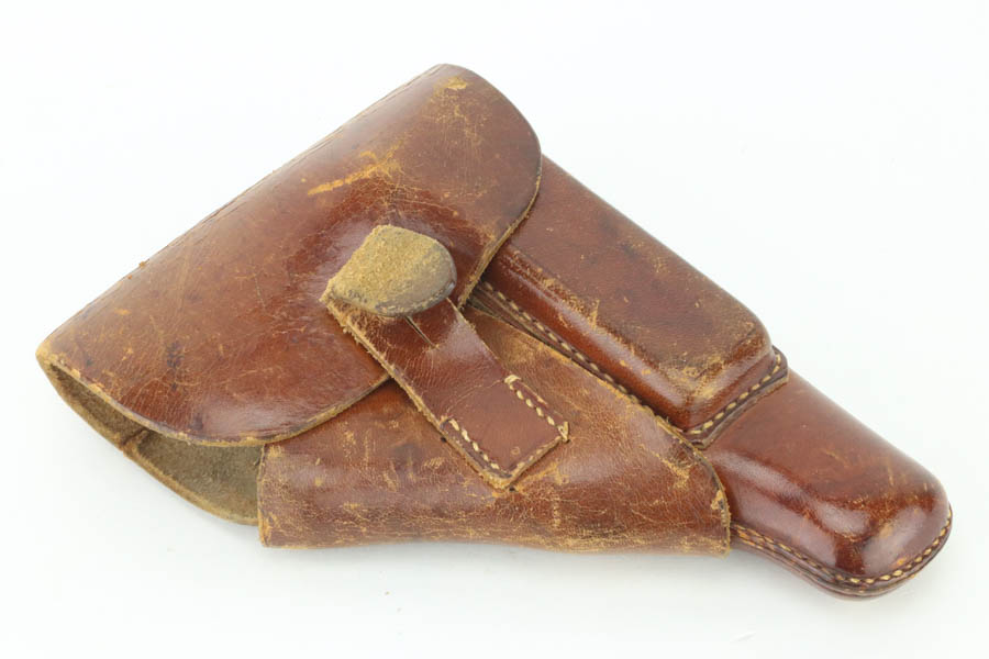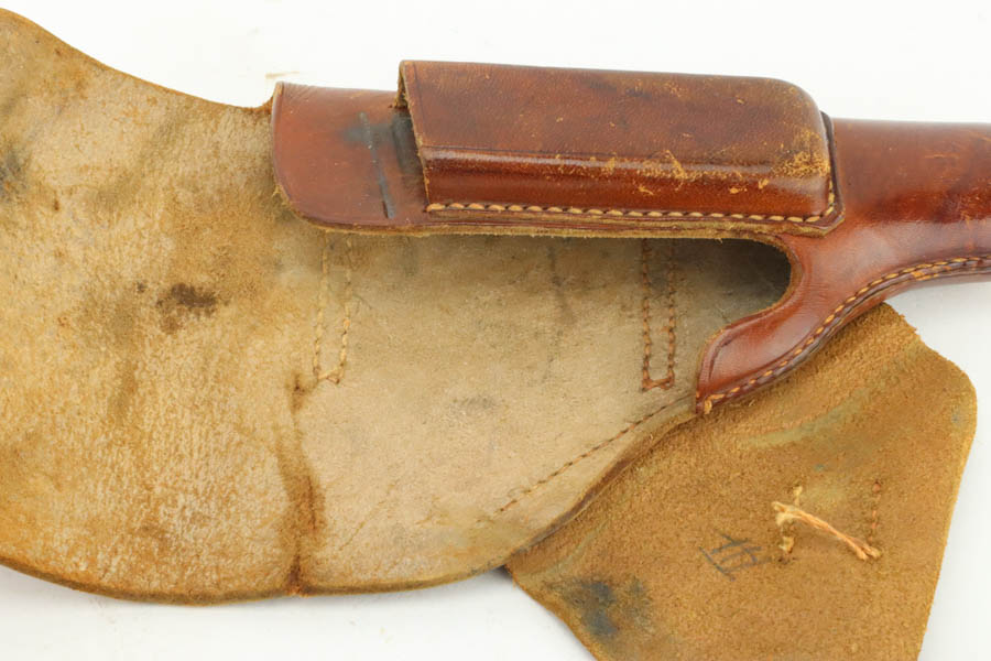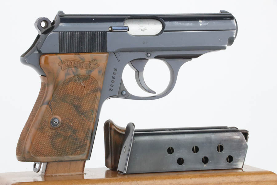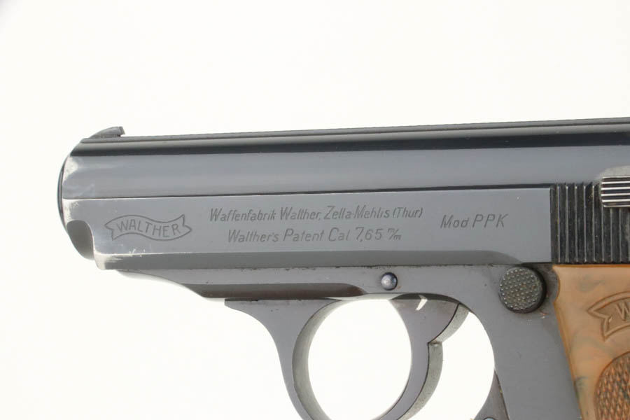 8/7/24 – This is an excellent example of Walther PPK sold in the commercial market in 1935. All matching and “Crown N” proofed. It comes as a rig with a tan leather Akah holster, one finger extension magazine, and one flat bottom magazine. The gun’s original high polish bluing rates about 96% with just minor muzzle wear and a few a few small dots of wear on the right side of the slide. Fitted with a brown Walther grip – a couple of small cracks on the right side. Minty bore.