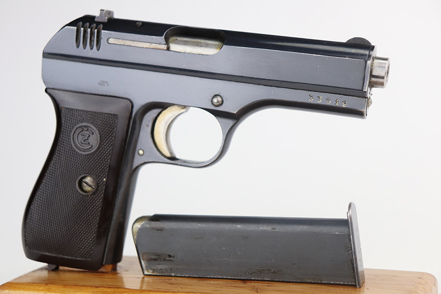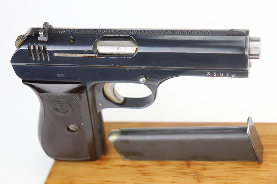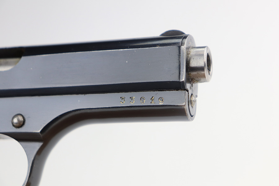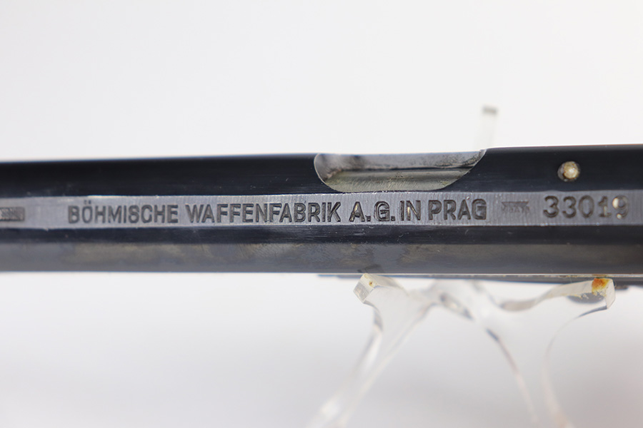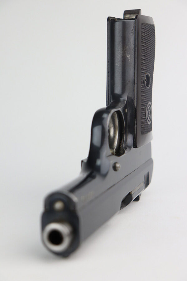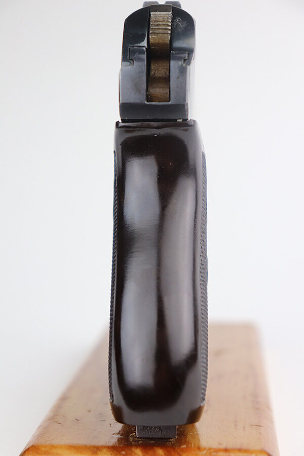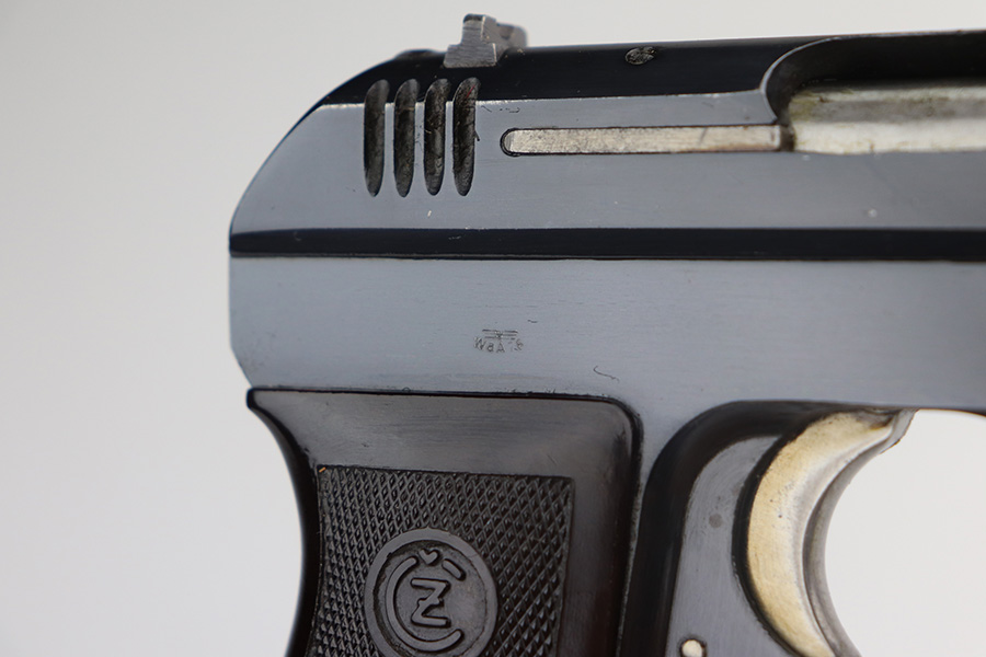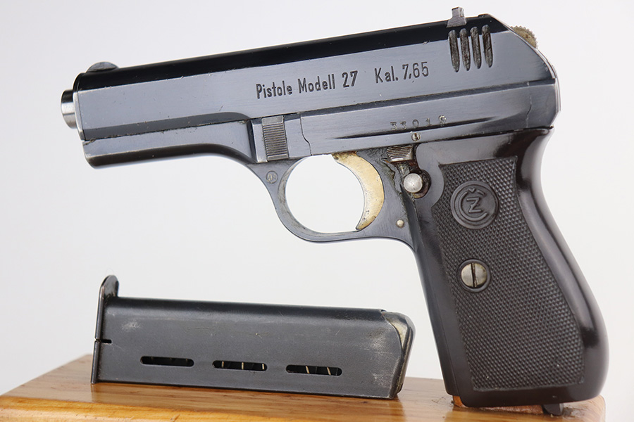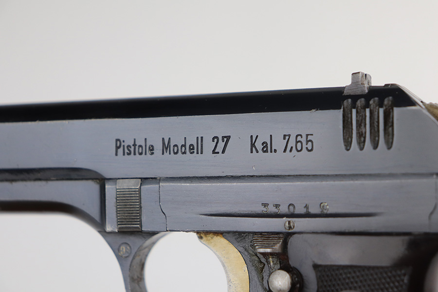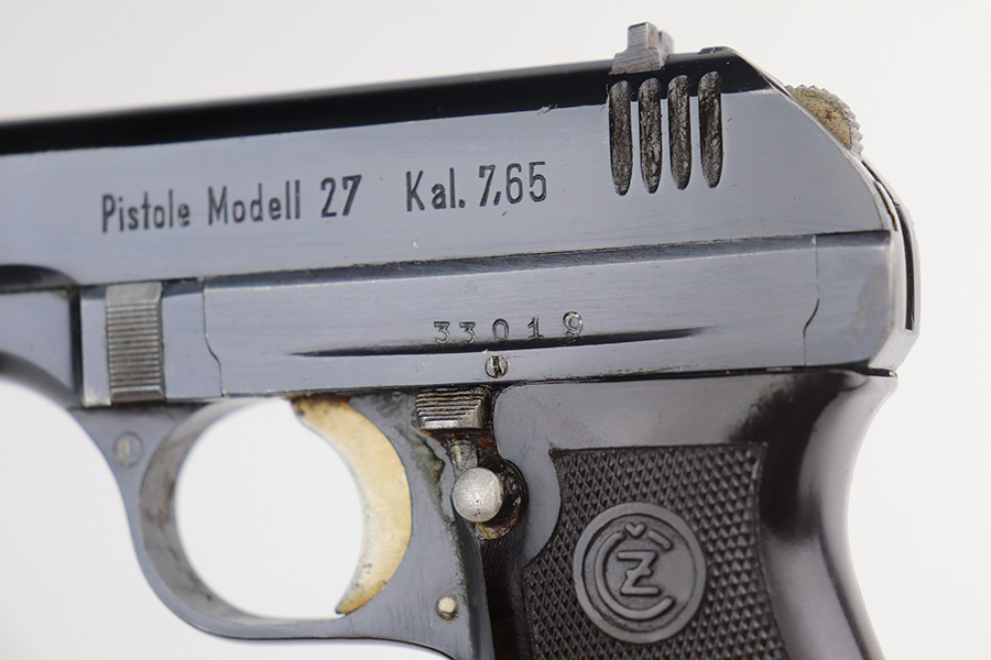 6/1/21 – This is an excellent example of a CZ 27 that was issued to the Nazi military during WW2. It is all matching and has the proper “Waffen 76” military proof. It also has a “DR” marking on the left side of the trigger guard. From research, we believe this means the gun may have been diverted to the Deutsche Reichsbahn, or to the railway police. The gun has retained about 97% of its original high polish finish. Minor wear on the front strap and a hint of wear on the high edges of the slide. Some very small dings on the left side of the slide. Excellent grips – no chips or cracks. Comes with a correct magazine. Excellent bore – shiny with strong rifling.