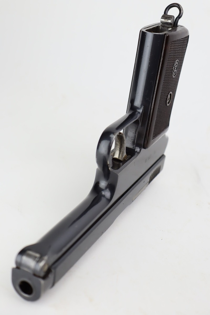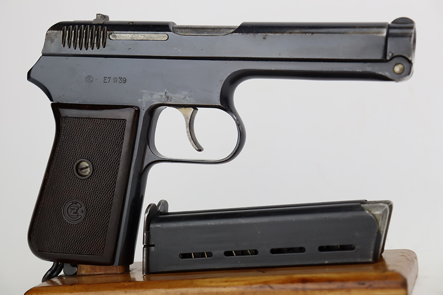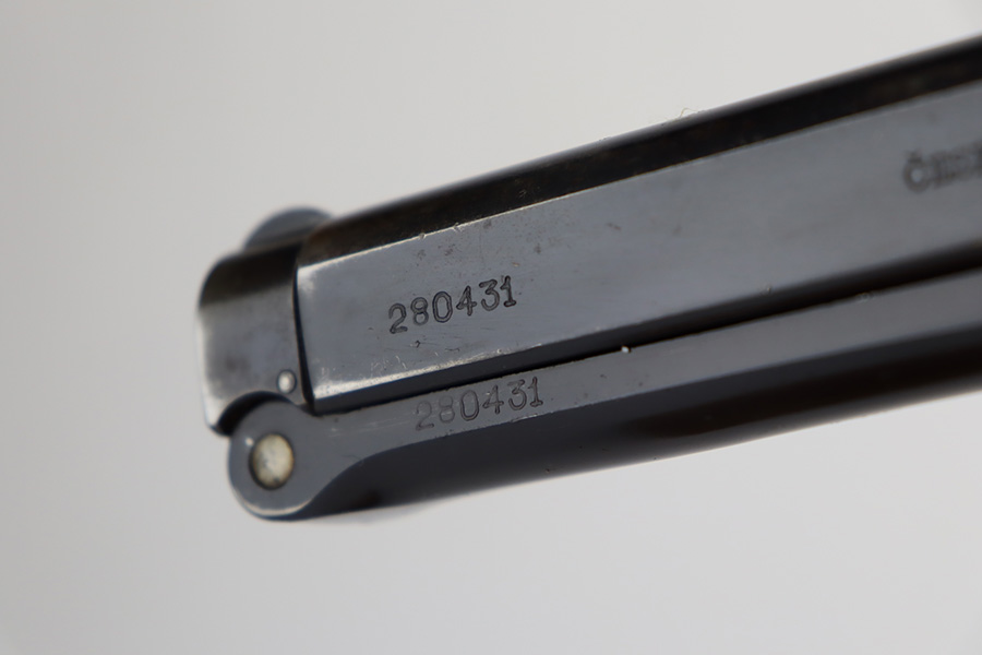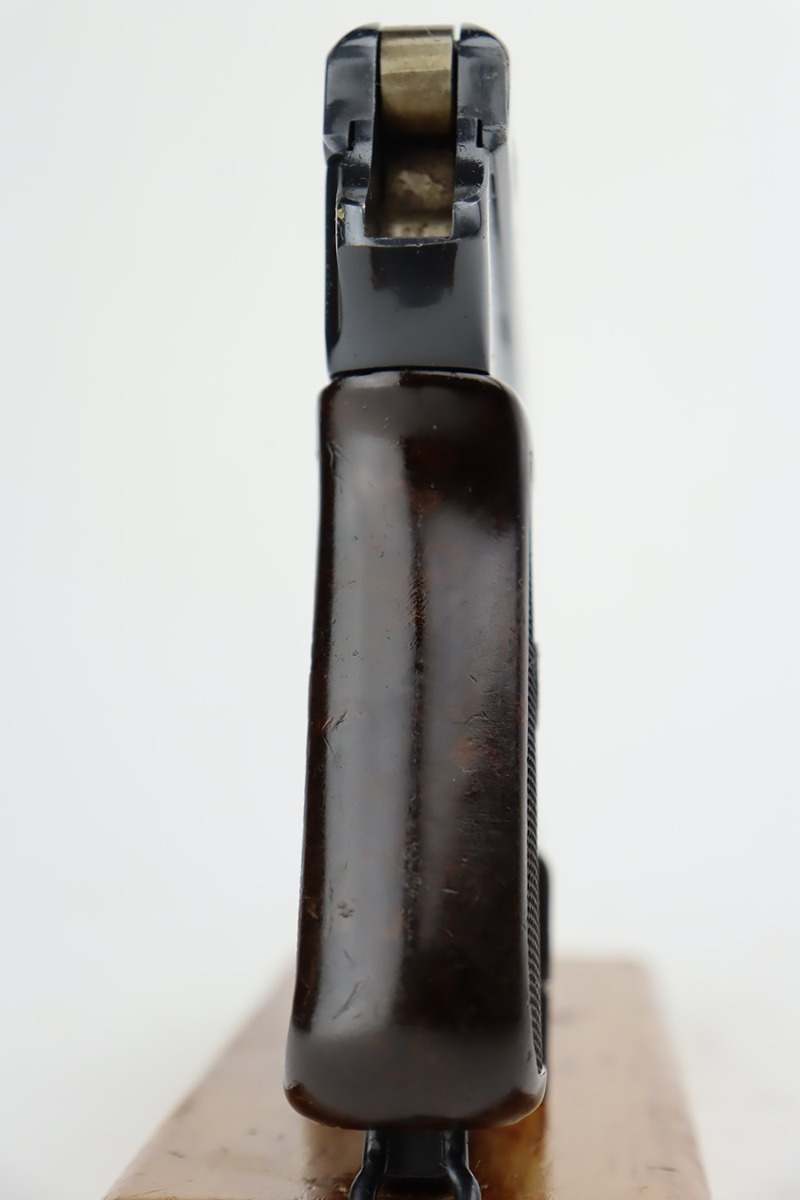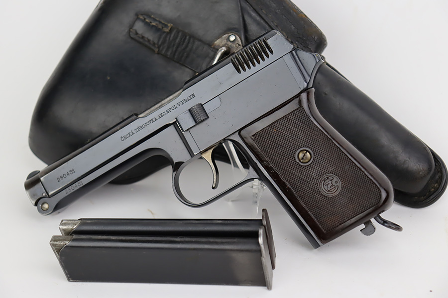 9/18/23 – This is an excellent example of a Czech CZ Model 38 Rig, manufactured in 1939. The gun is all matching and has the proper Czech lion proofs. This gun was initially part of a Czech contract, but may have been issued to the Nazi military after they captured the factory – this gun is in the correct serial range. The rig comes with two period-correct magazines and a waffen-proofed 1943-dated P.38 holster. The gun itself has retained about 95% of its high polish finish. Minor wear around the high edges in general and around the rear sight. Some tiny pits here and there. Excellent grip – no chips or cracks. Minty bore.