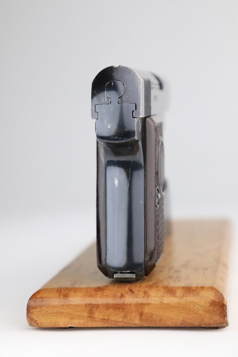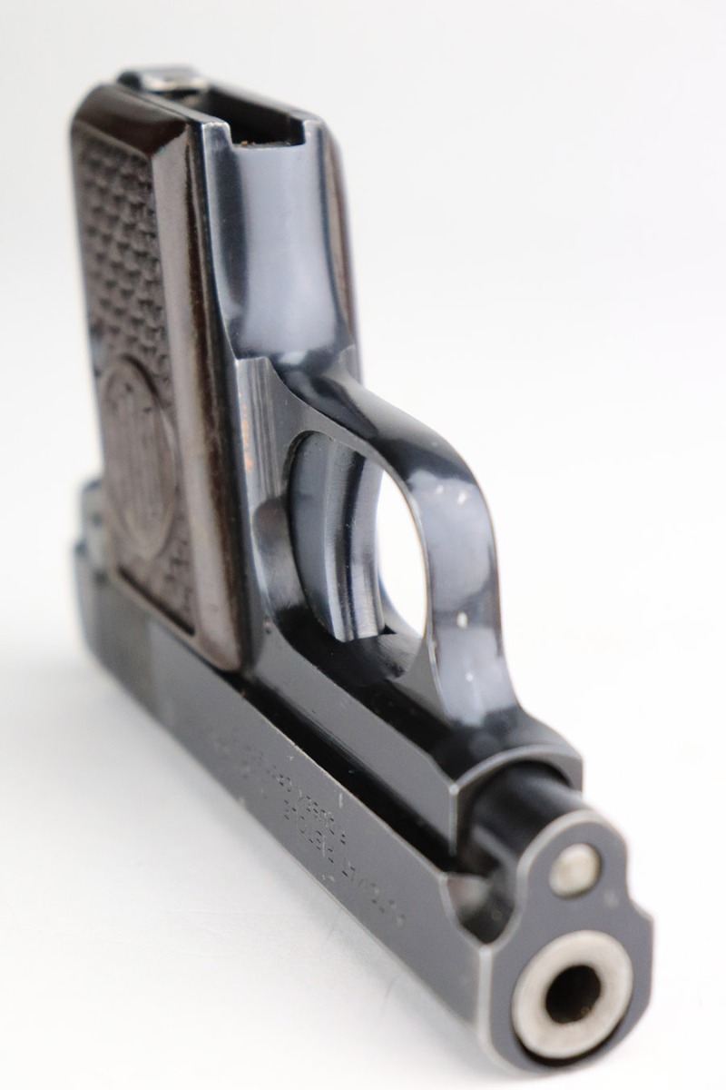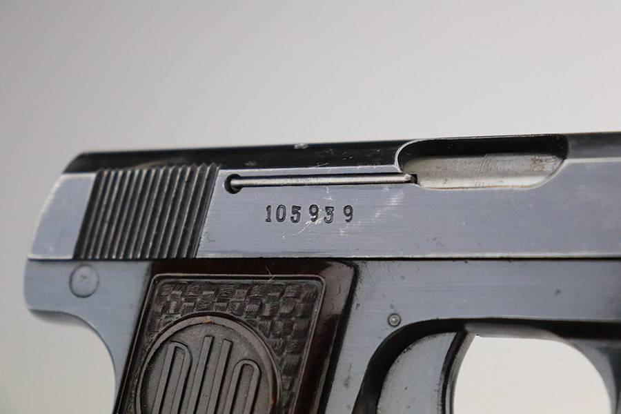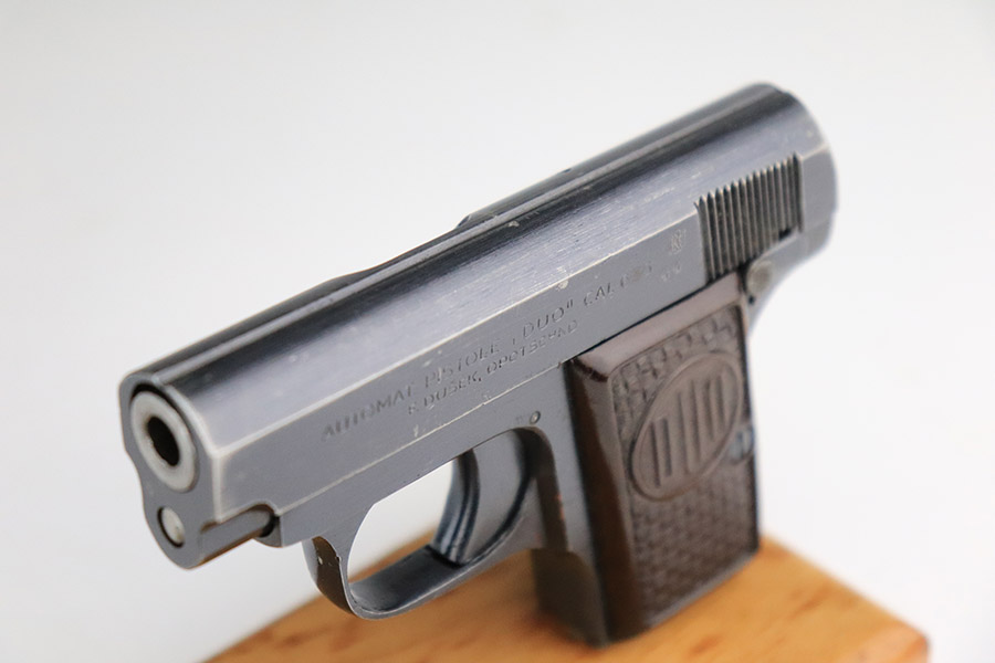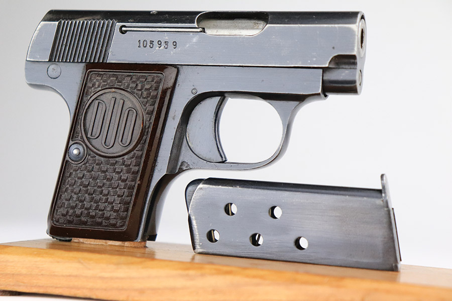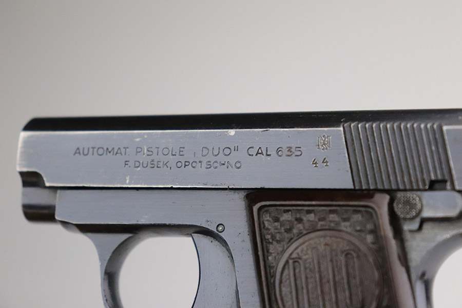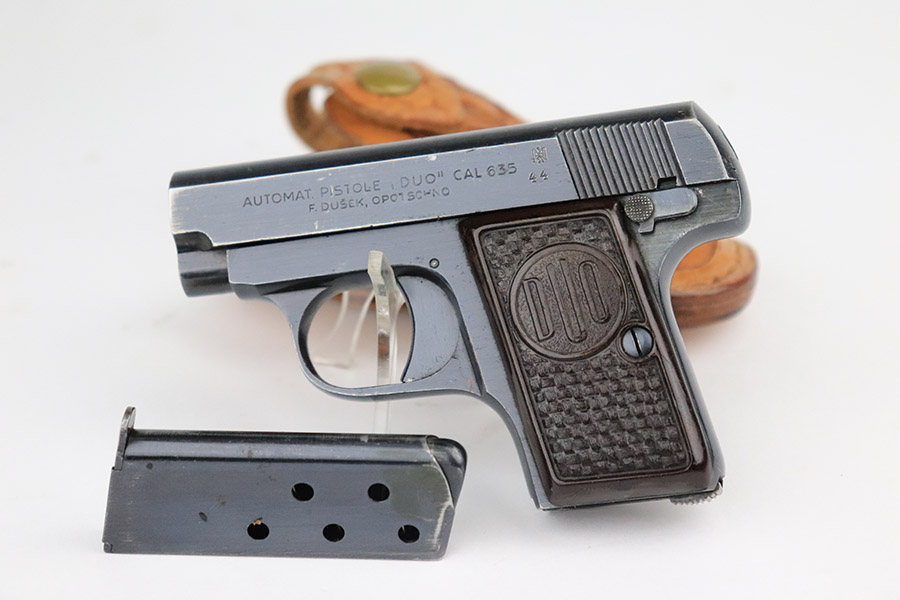 The name ‘DUO’ comes from the combination of Dusek and Opocno, which is the last name of the original manufacturer and the city he gunsmithed in. Dusek’s first pistols bore the name Singer, and later Ydeal. However, by 1938, he was using the name DUO. When Dusek refused to coöperate with the Nazis during World War II, they took over his factory and proceded to produce over 110,000 DUO pistols. The DUO was also very popular with the Germans and was sold to the public at large through various sporting goods stores. From the first, Dusek’s pistols were very well made. His production standards were higher than those of the Spanish manufacturers whose pistols he imported, and his pistols were more expensive as well. The DUO is a single action pistol virtually identical to the original Browning-designed Colt .25 hammerless vest pocket model.