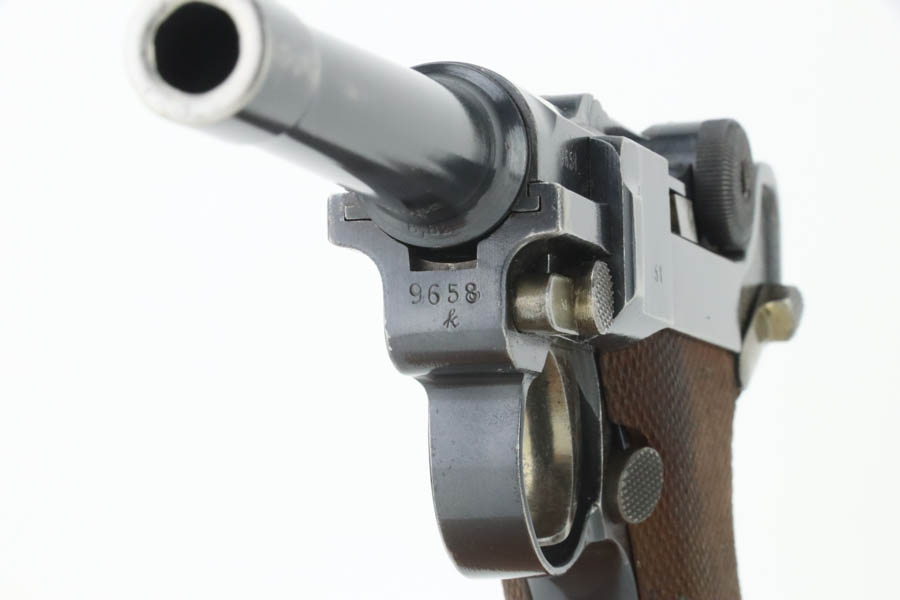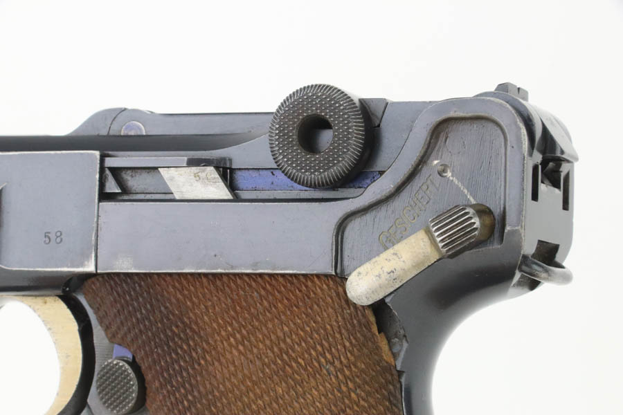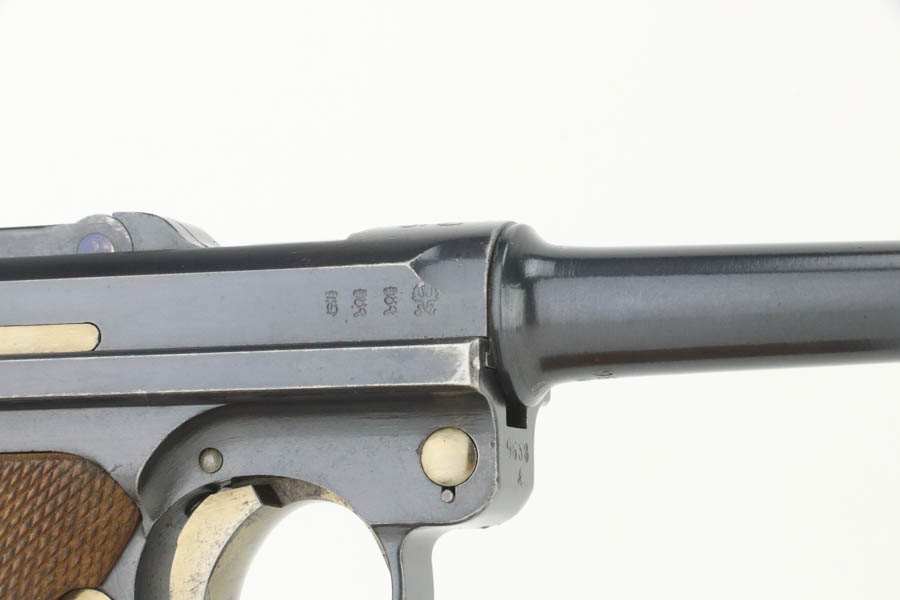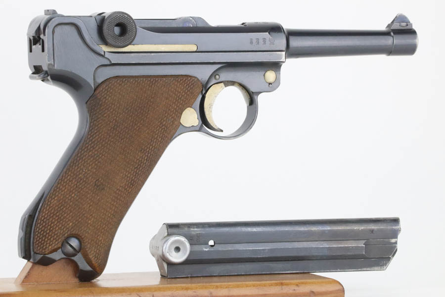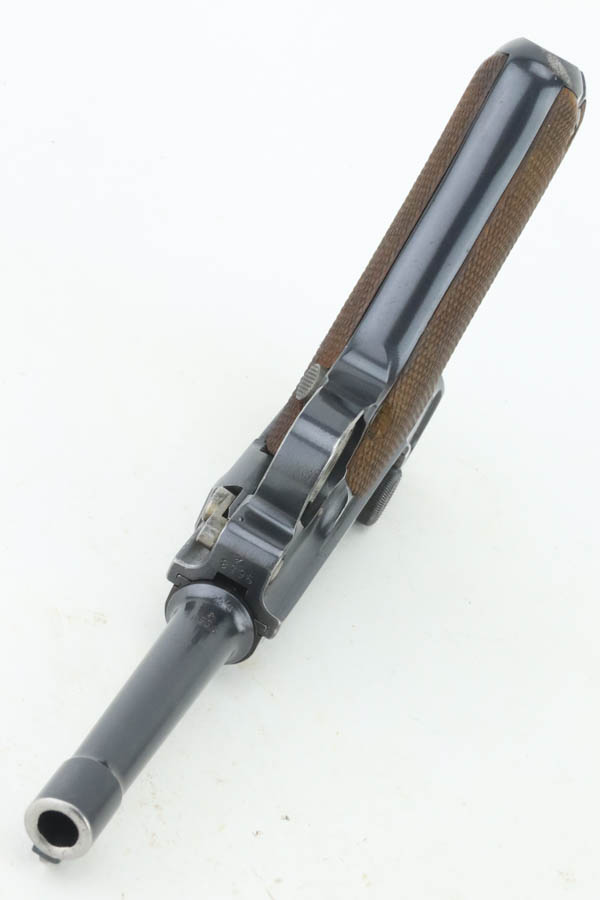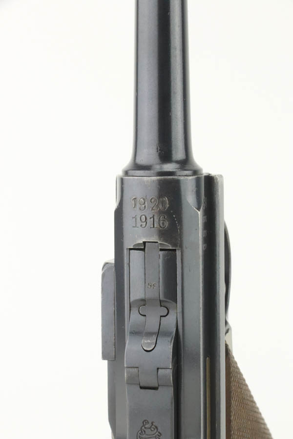 8/14/24 – This is an excellent example of a DWM Luger that was originally issued to the Imperial German military in 1916. All matching with the proper military proofs. This one is “double dated” with a “1920” government property marking on the receiver, indicating it remained in government service after WW1. It was likely issued to the German police force. Its original bluing rates about 96% with just minor high edge and muzzle wear. Fitted with matching-numbered wood grips – small chip on the left side. Comes with a mismatched WW2-era magazine. Very nice bore.