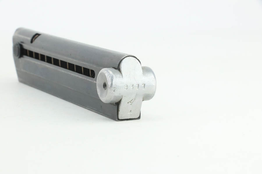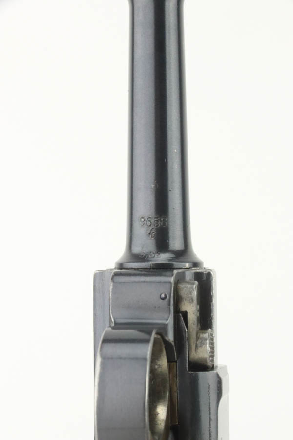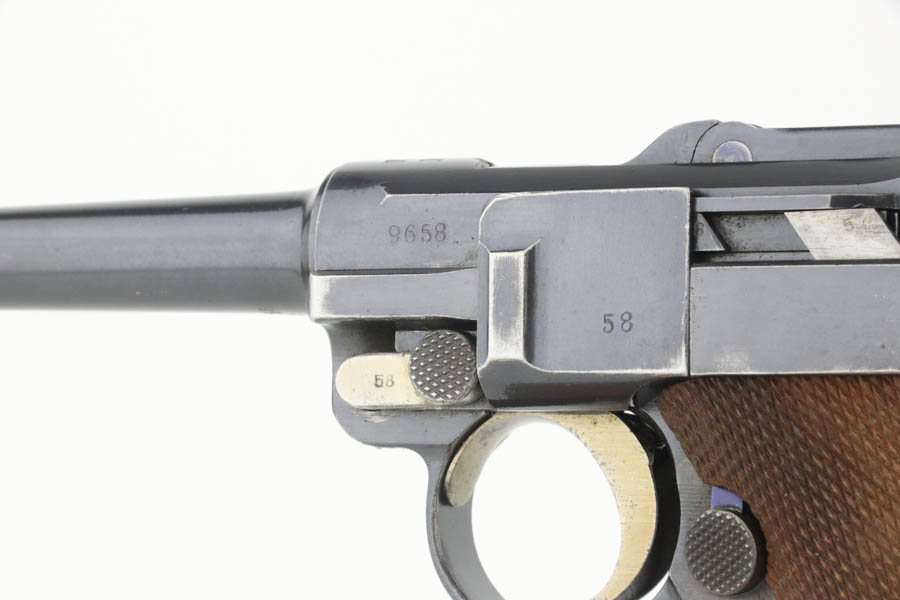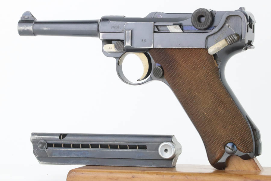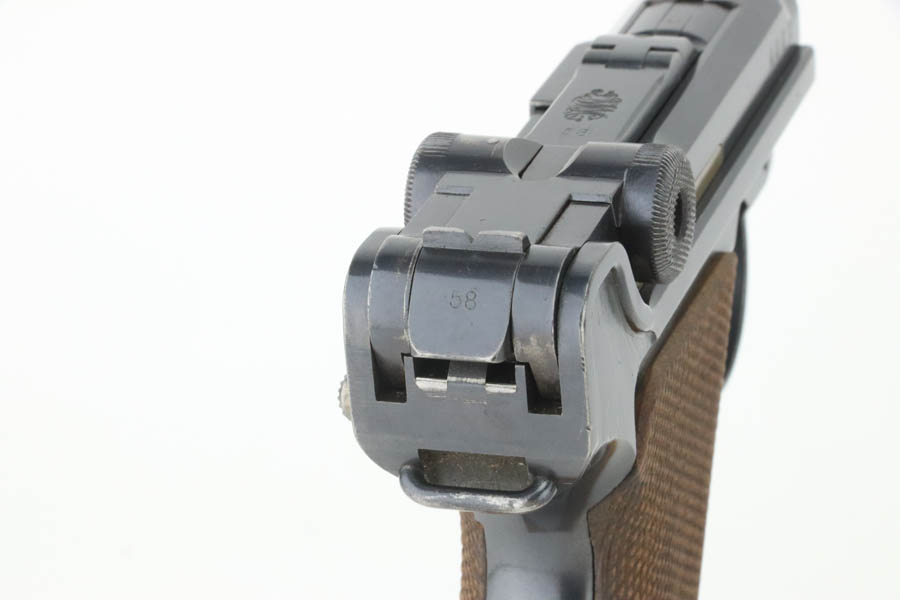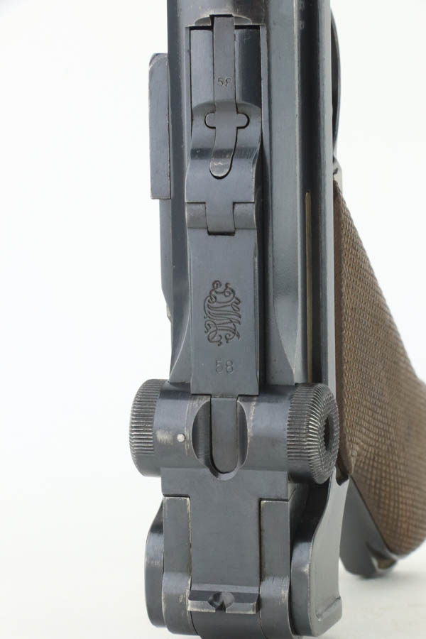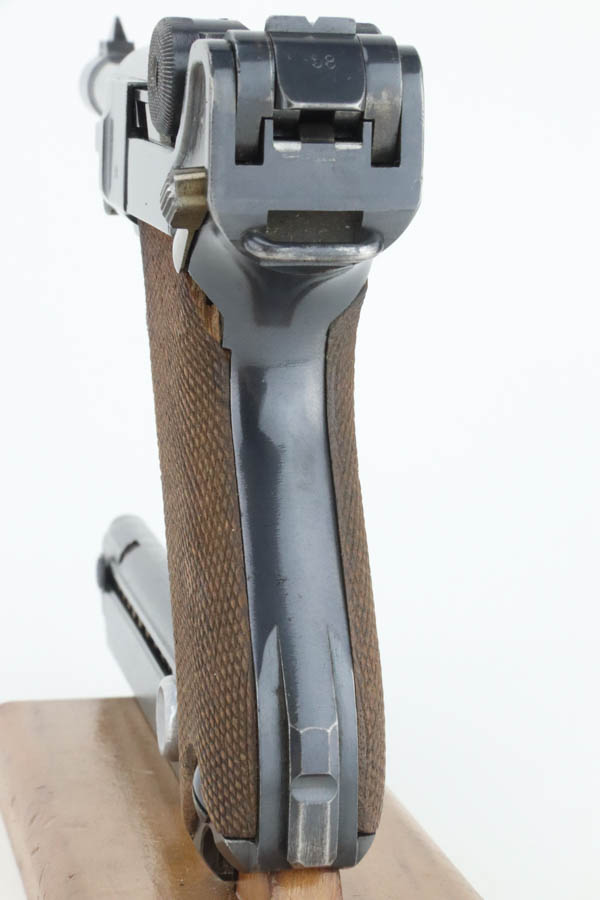8/14/24 – This is an excellent example of a DWM Luger that was originally issued to the Imperial German military in 1916. All matching with the proper military proofs. This one is “double dated” with a “1920” government property marking on the receiver, indicating it remained in government service after WW1. It was likely issued to the German police force. Its original bluing rates about 96% with just minor high edge and muzzle wear. Fitted with matching-numbered wood grips – small chip on the left side. Comes with a mismatched WW2-era magazine. Very nice bore.
