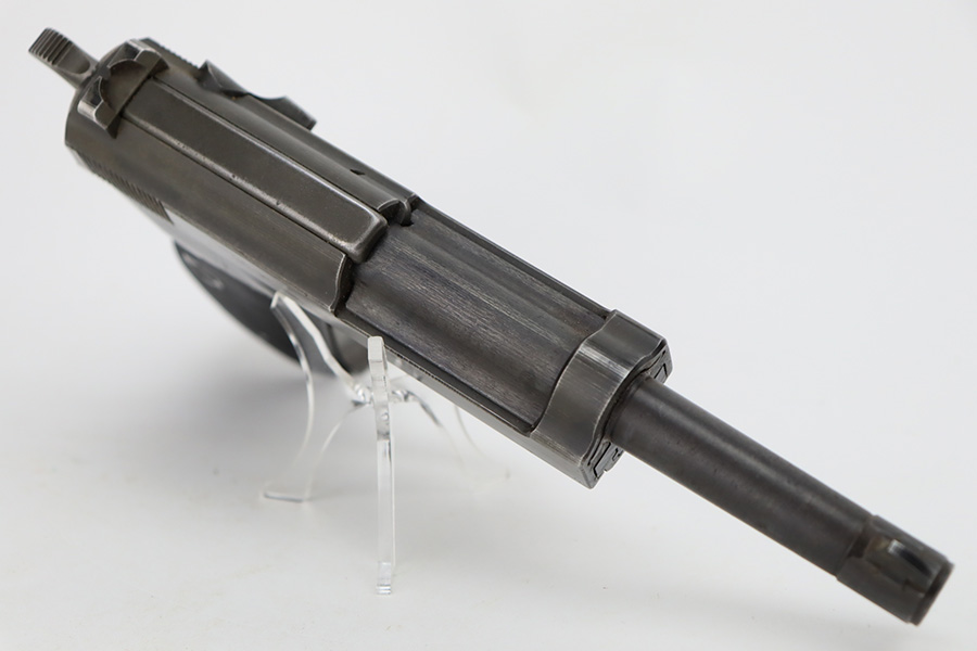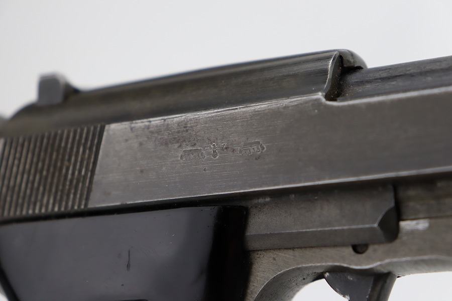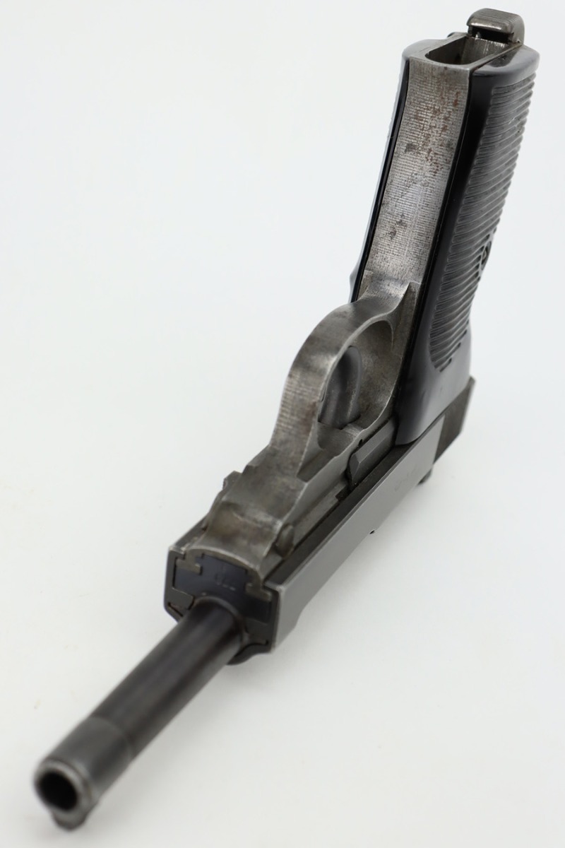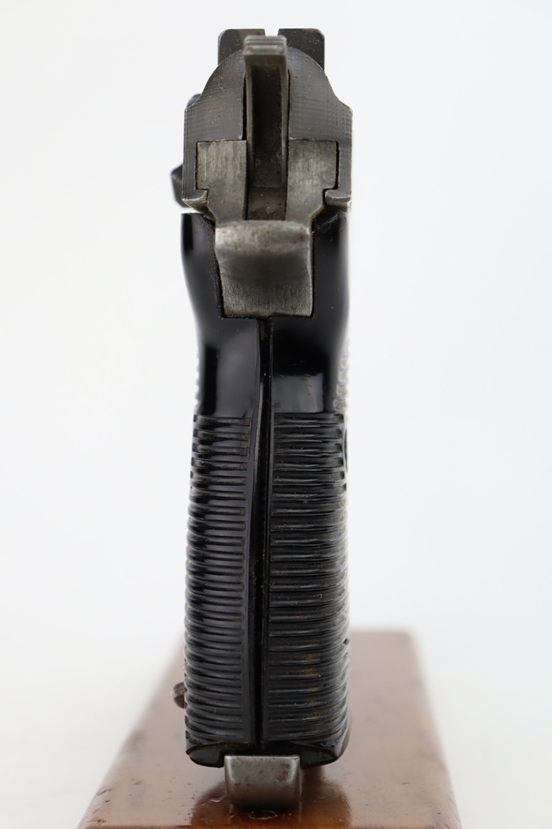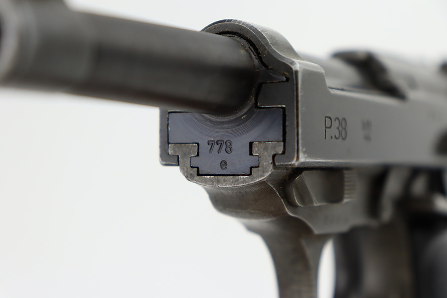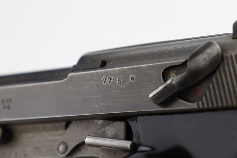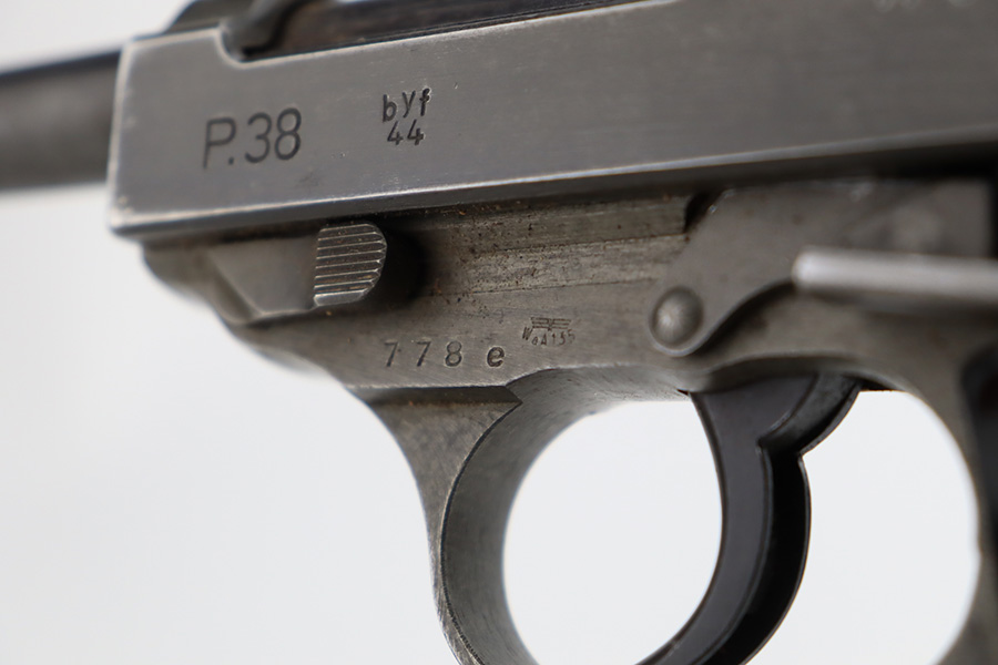 12/20/2023 – This is an excellent example of a Mauser BYF 44 P.38 issued to the Nazi Military in 1944. Chambered in 9mm Luger. This pistol has a dual finish with both phosphate slide, frame, and a blued barrel. Light edge wear on the front and right side of the slide and slight thinning to the front strap. This example has all matching parts with proper “Waffen 135” proofs and an unmarked period correct magazine. Proper black plastic grips. De-cocker functions properly.
