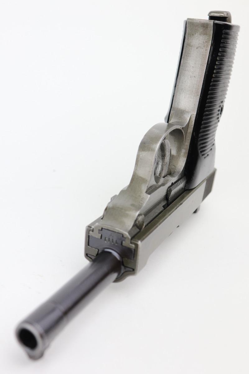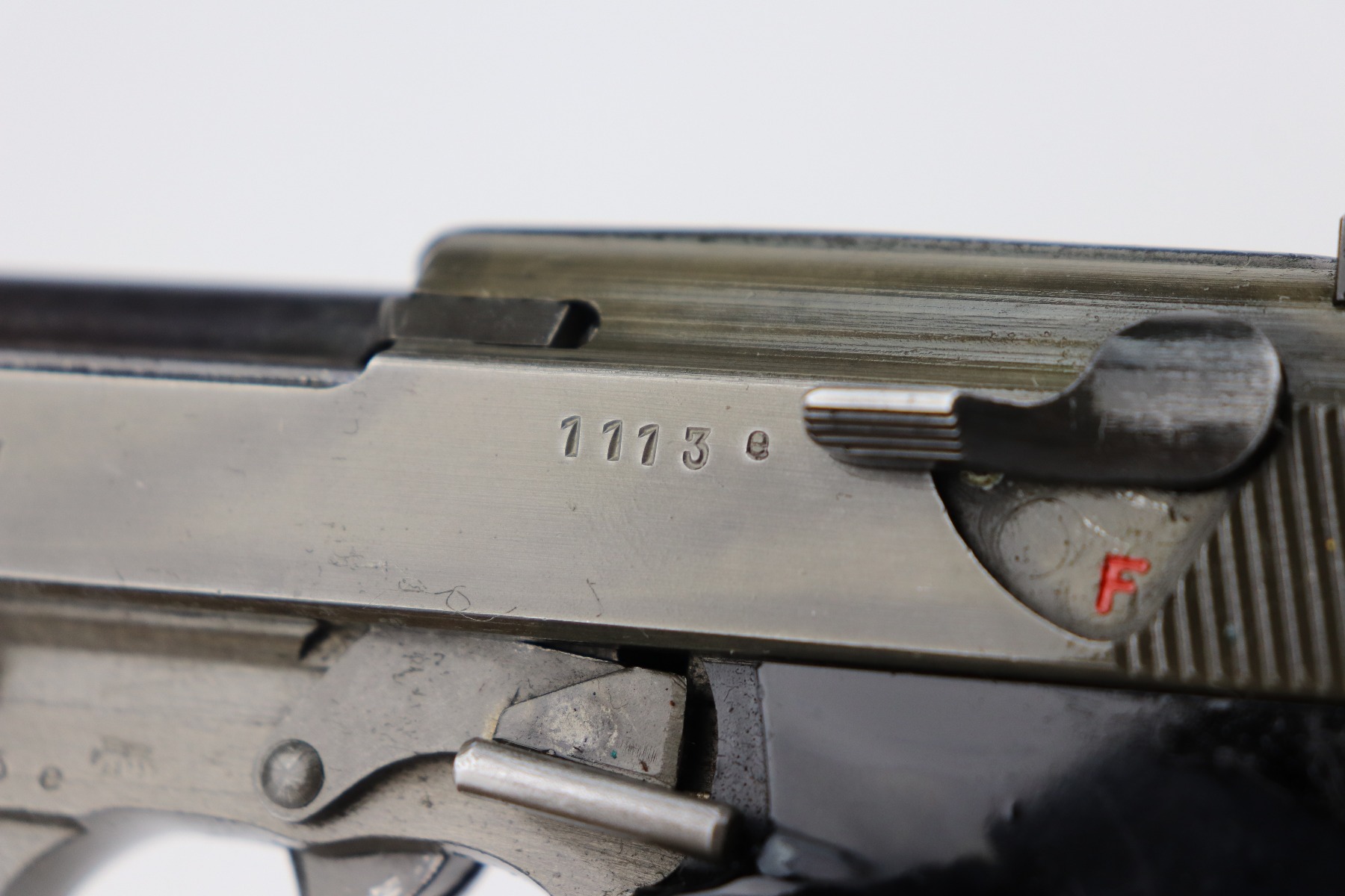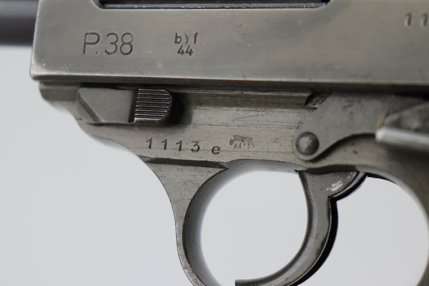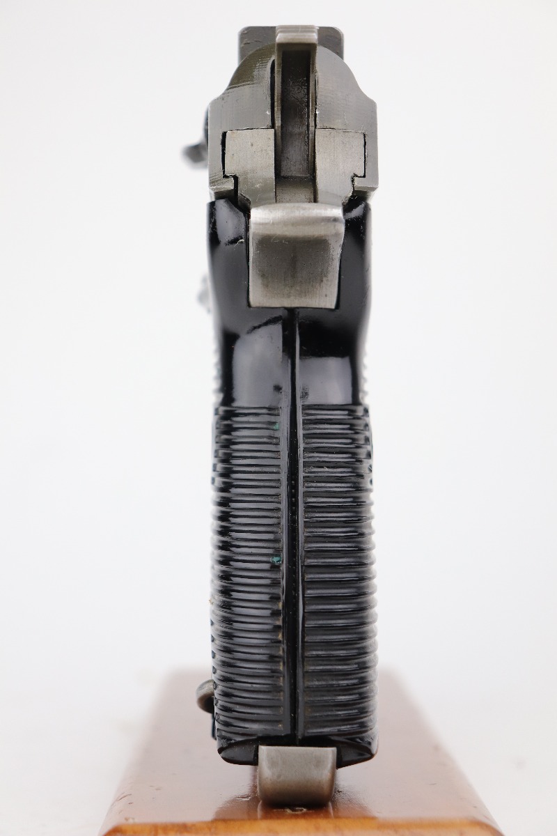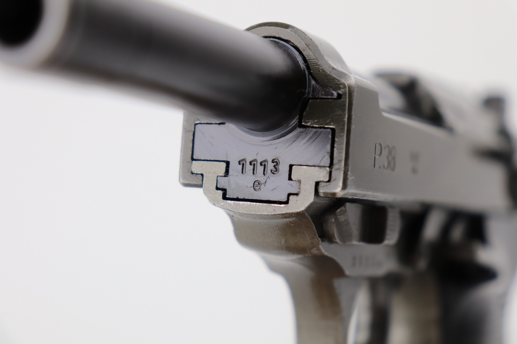 3/30/21 – This is an excellent example of a Mauser P.38 issued to the Nazi military in 1944. The gun is all matching and has the proper “Waffen 135” military proofs. This particular gun has a really cool “tiger pattern” on the slide, a unique and desirable pattern sometimes seen in these guns. The frame and slide are phosphate and the barrel is blued, giving it a dual-tone appearance. The gun is excellent, retaining about 95% of its original finish. There is thinning on the front strap and very minor wear on the high edges of the slide. A few very small scratches at the front of the right side of the slide. There is a number scratched very lightly into the underside of the frame. Comes with excellent grips and a period-correct magazine. Excellent bore – shiny with strong rifling. De-cocker is functional.