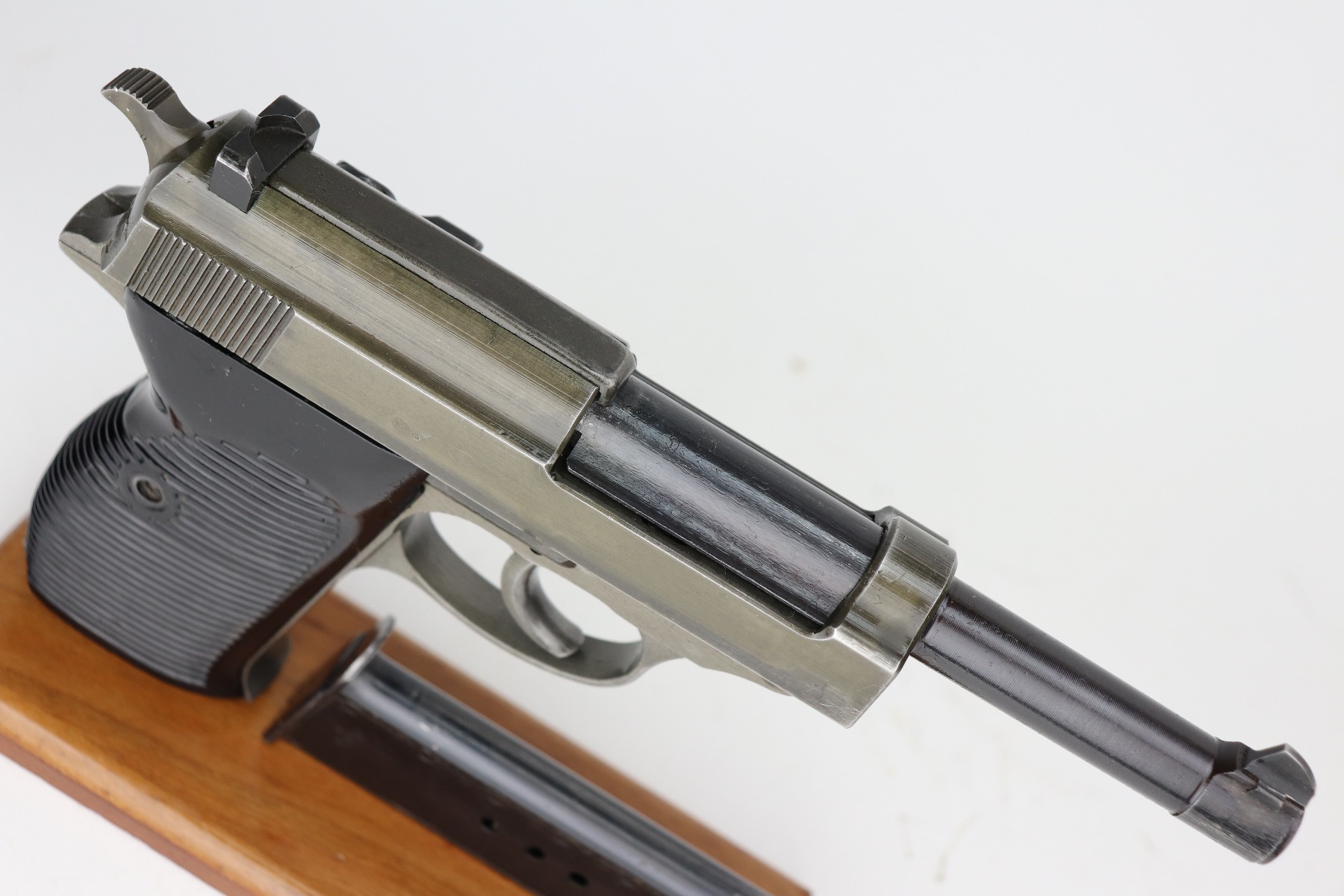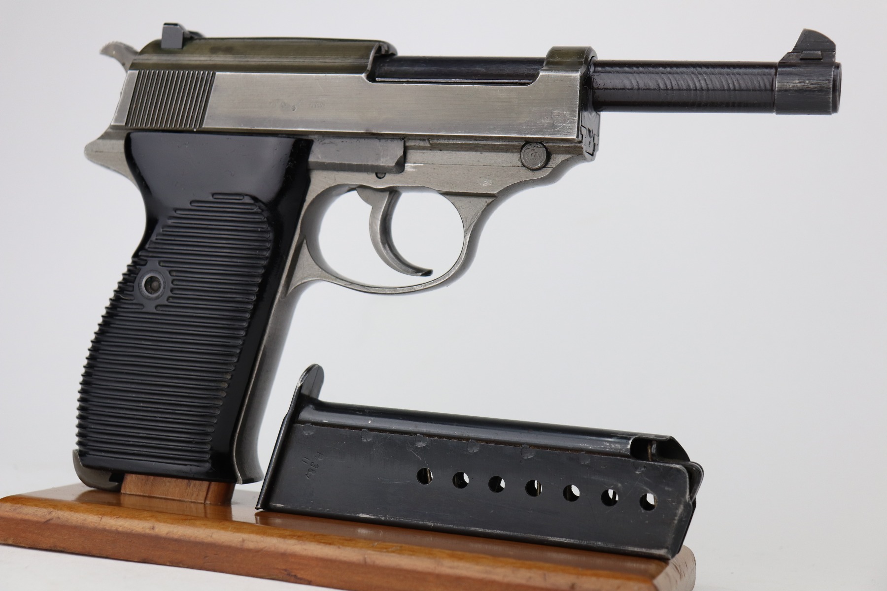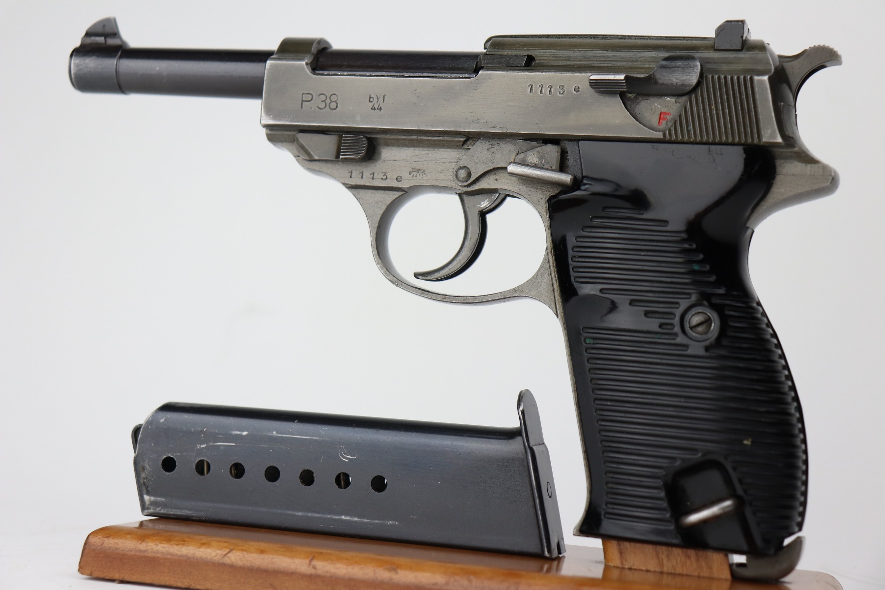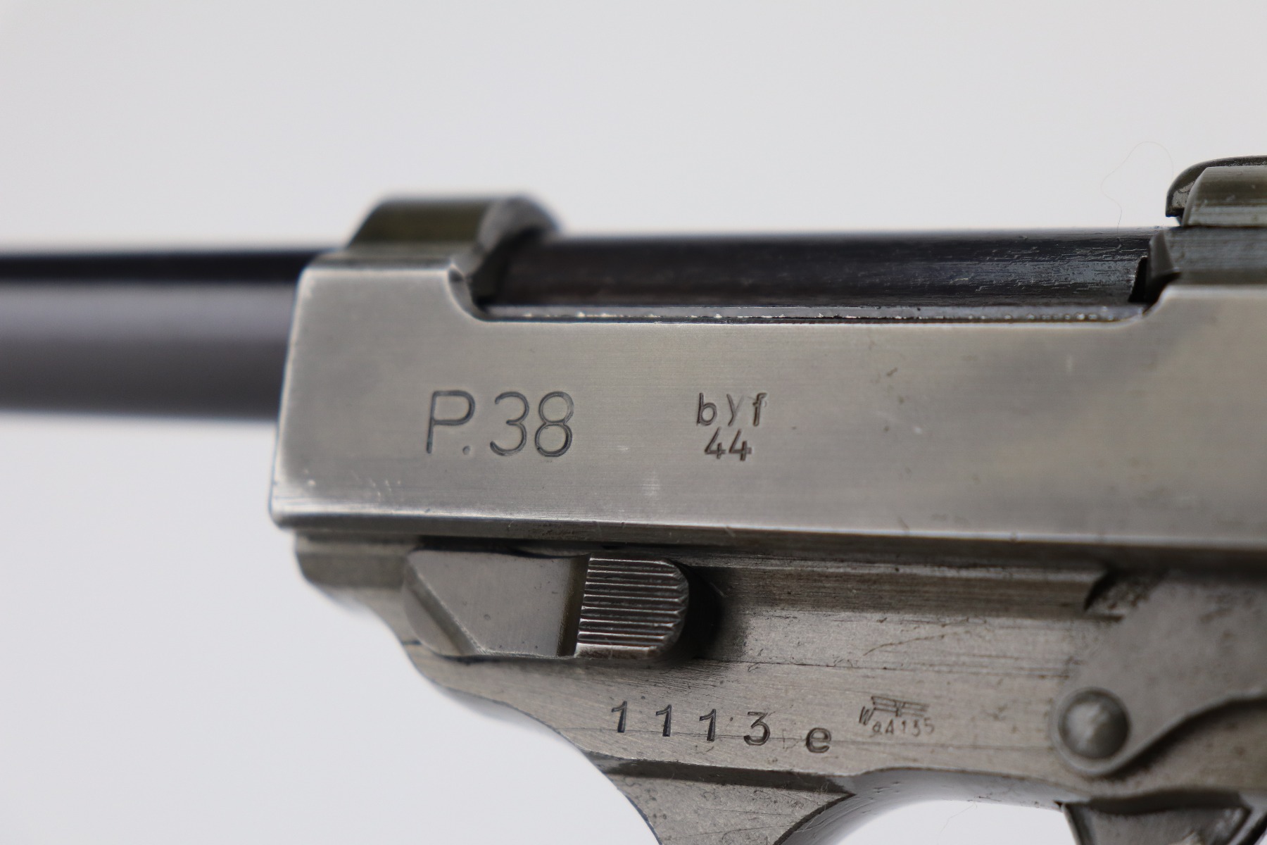 3/30/21 – This is an excellent example of a Mauser P.38 issued to the Nazi military in 1944. The gun is all matching and has the proper “Waffen 135” military proofs. This particular gun has a really cool “tiger pattern” on the slide, a unique and desirable pattern sometimes seen in these guns. The frame and slide are phosphate and the barrel is blued, giving it a dual-tone appearance. The gun is excellent, retaining about 95% of its original finish. There is thinning on the front strap and very minor wear on the high edges of the slide. A few very small scratches at the front of the right side of the slide. There is a number scratched very lightly into the underside of the frame. Comes with excellent grips and a period-correct magazine. Excellent bore – shiny with strong rifling. De-cocker is functional.