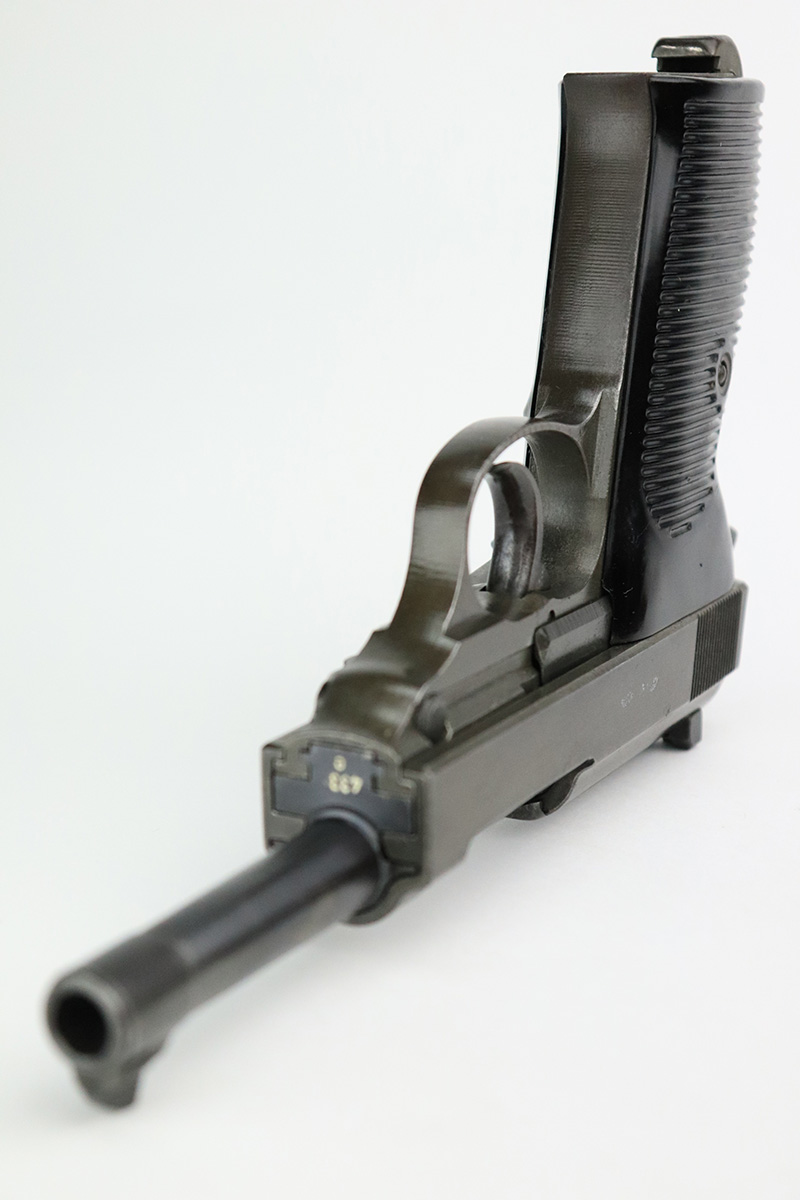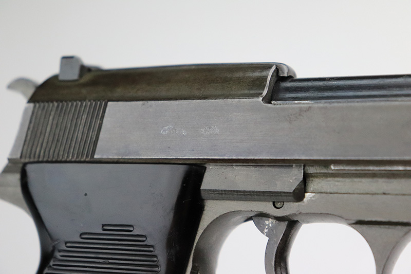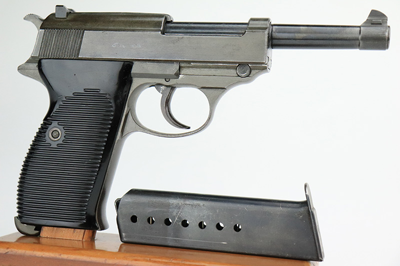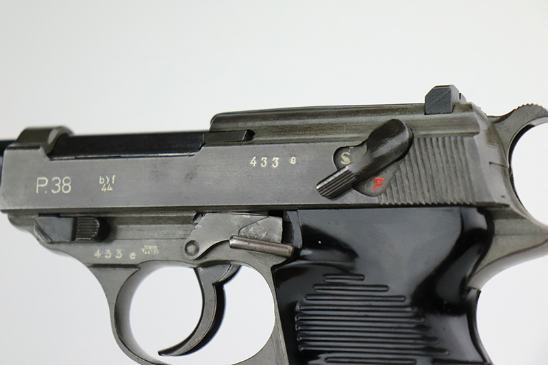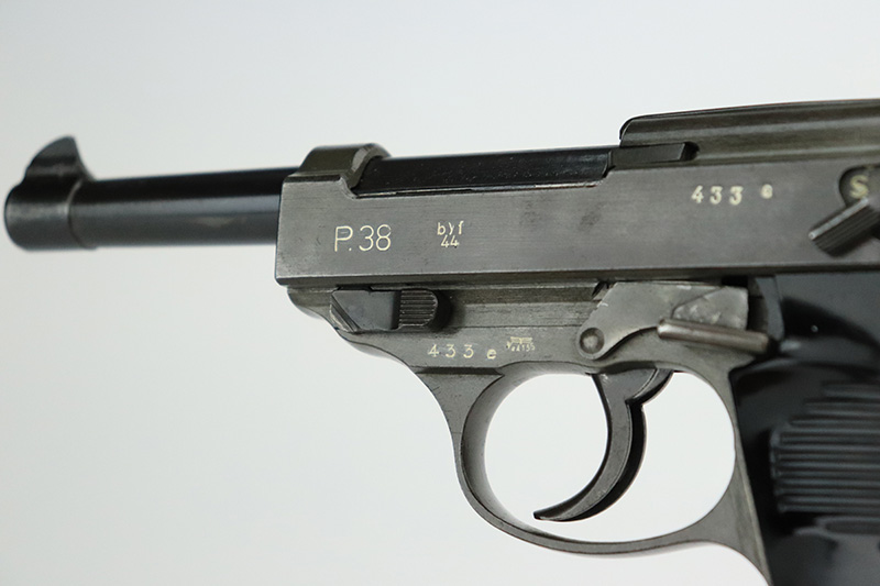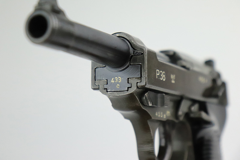 8/15/22 – This is an excellent example of an all matching and original Mauser P.38 with phosphate finish on slide and frame. It has a blued barrel and rear sight, creating the “dual-tone” look that collectors like. Krutzek’s P.38 book estimates 18,000 were produced, and while the slide has a ’44 date, many were completed several months into 1945. They have a rougher, sometimes “splotchy” finish but this one shows very little wear. Little bit of finish loss on the muzzle and front edges of the slide, but excellent overall. There’s also a couple of small patches of minor pinpricking on the right side of the slide. Bore is shiny with strong rifling but there is a little freckling in the grooves. Excellent grips with only minor scuffing. WaA135 magazine. Functional de-cocker.