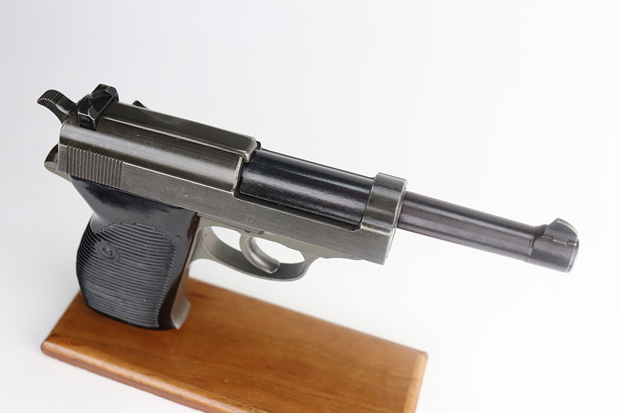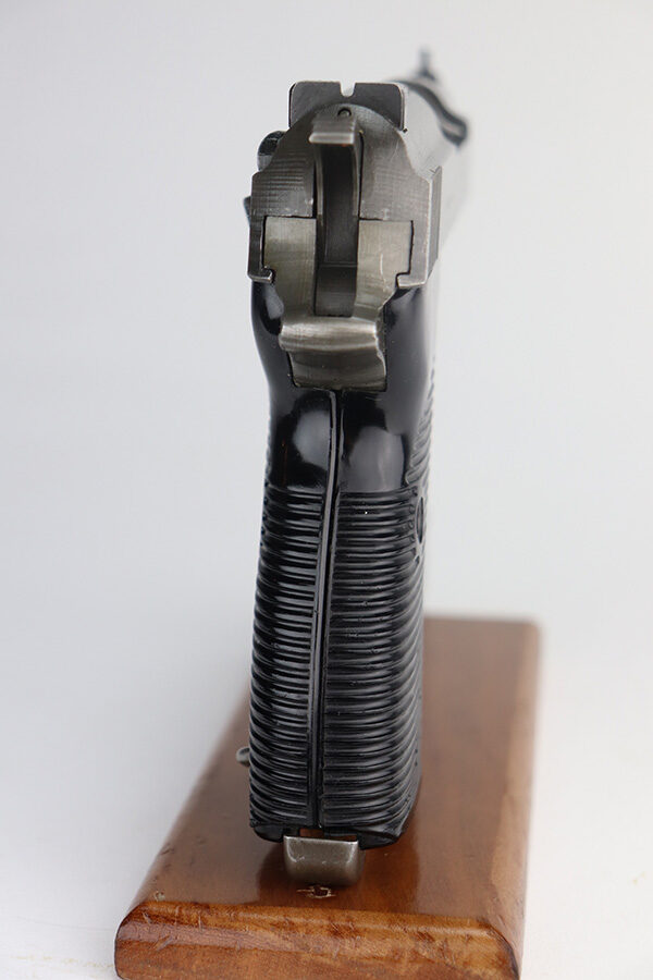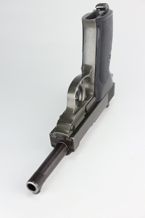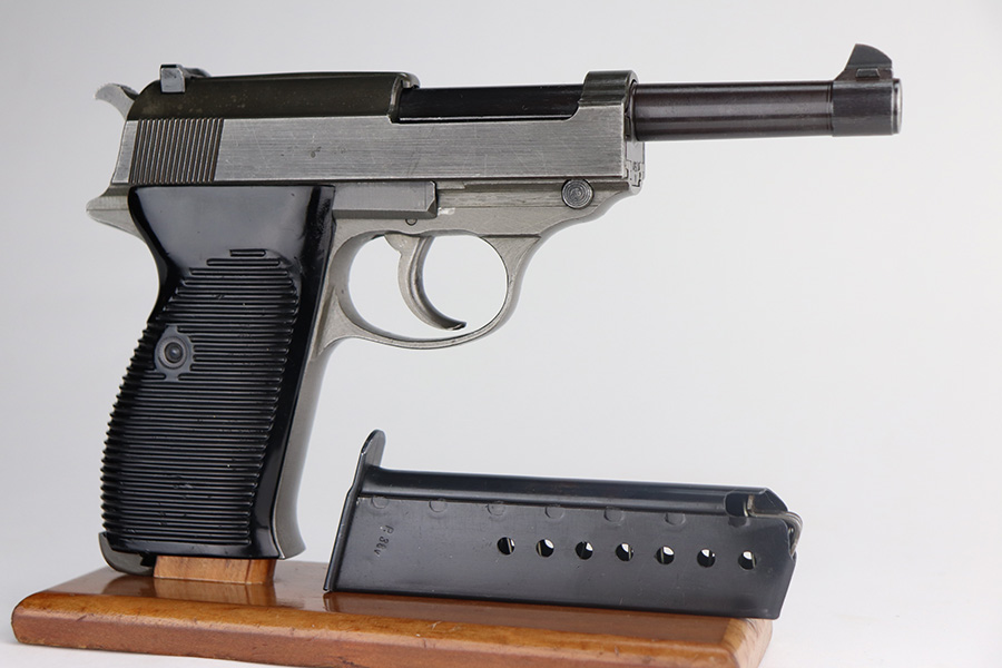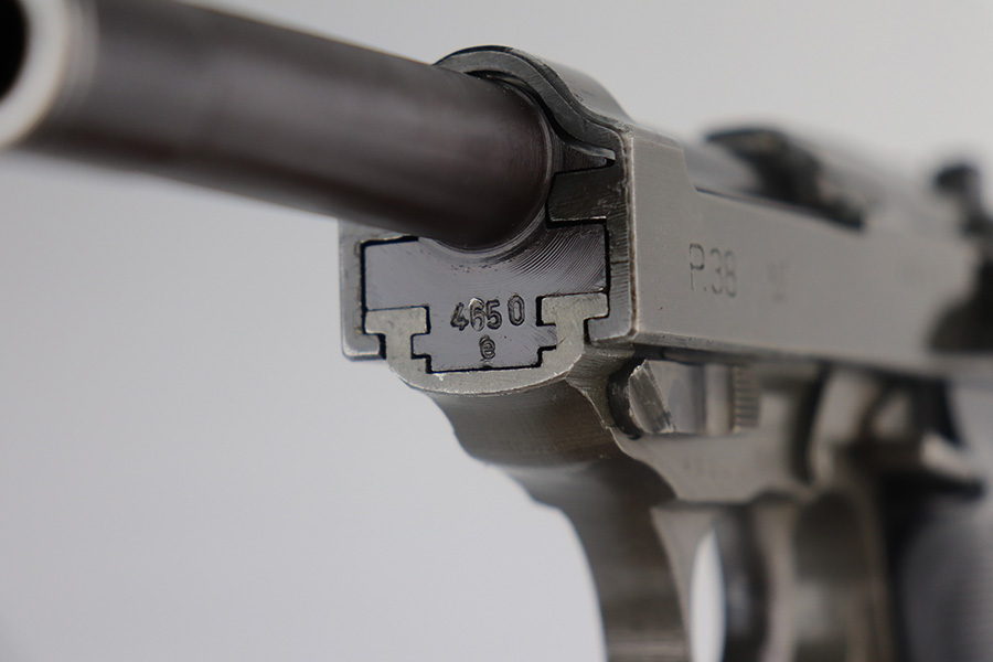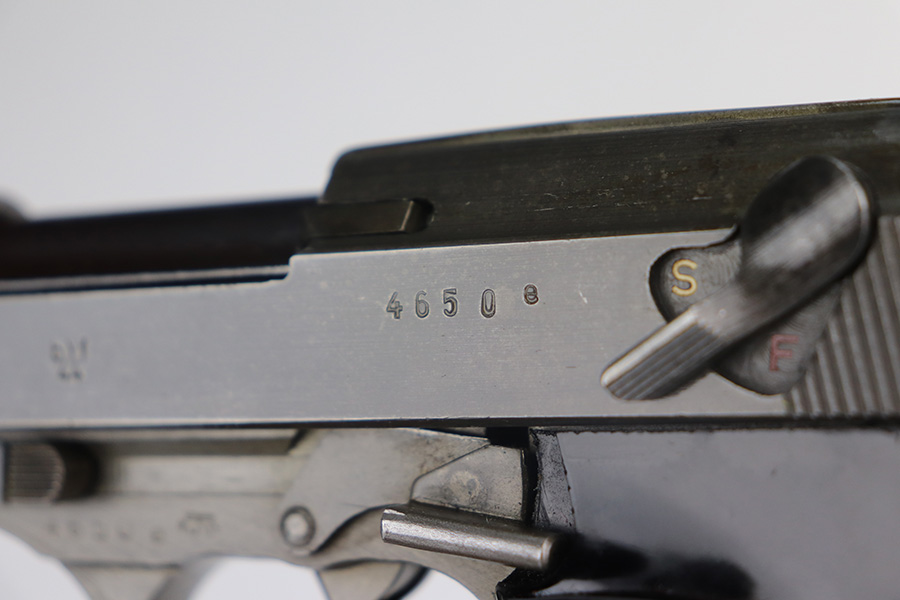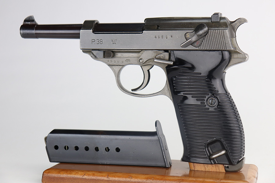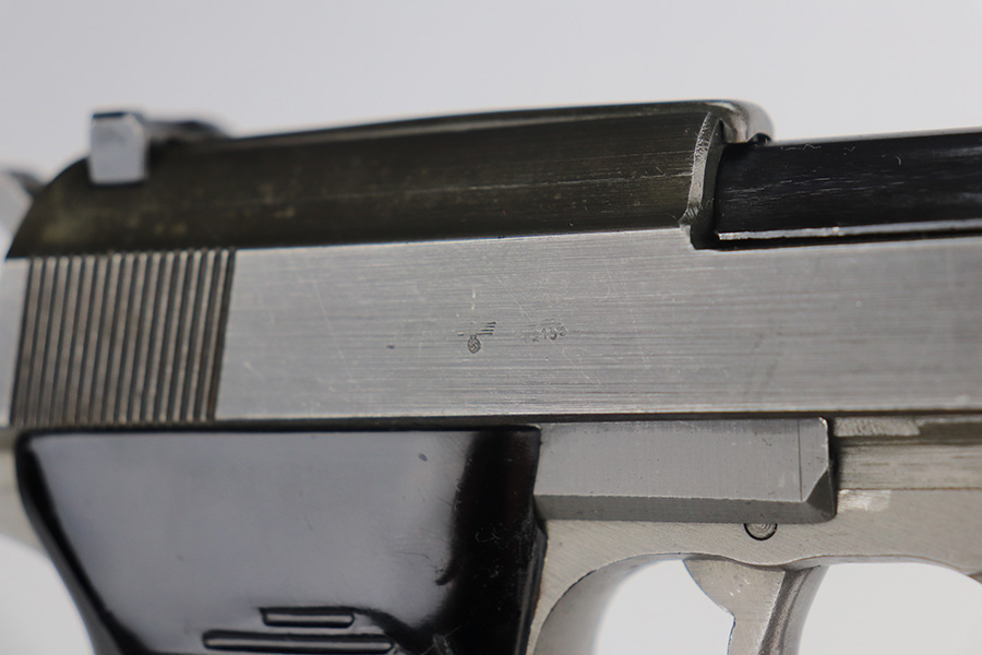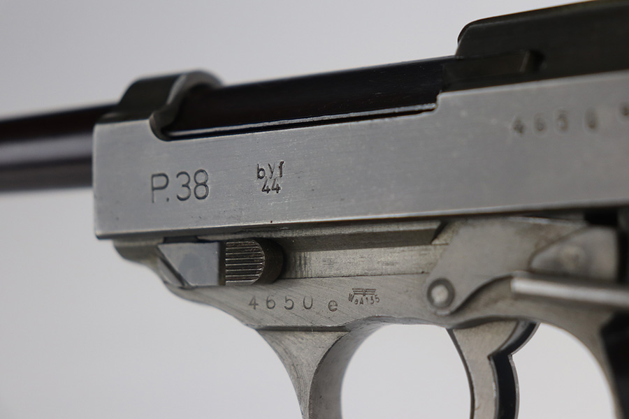 5/24/21 – This is an excellent example of a dual-tone Mauser P.38 issued to the Nazi military in 1944. It gets its dual-tone appearance from the phosphate frame and slide and blued barrel. The gun is all matching and has the proper “waffen 135” military proofs. It has retained about 97% of its original finish. There is just a hint of thinning on the front strap and one area of discoloration on the top plate. Some tiny dots of discoloration here and there on the slide. A few very light surface scratches on the right side of the slide. Comes with excellent grips and a proper magazine. Excellent shiny bore with strong rifling. De-cocker is functional.