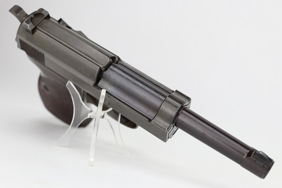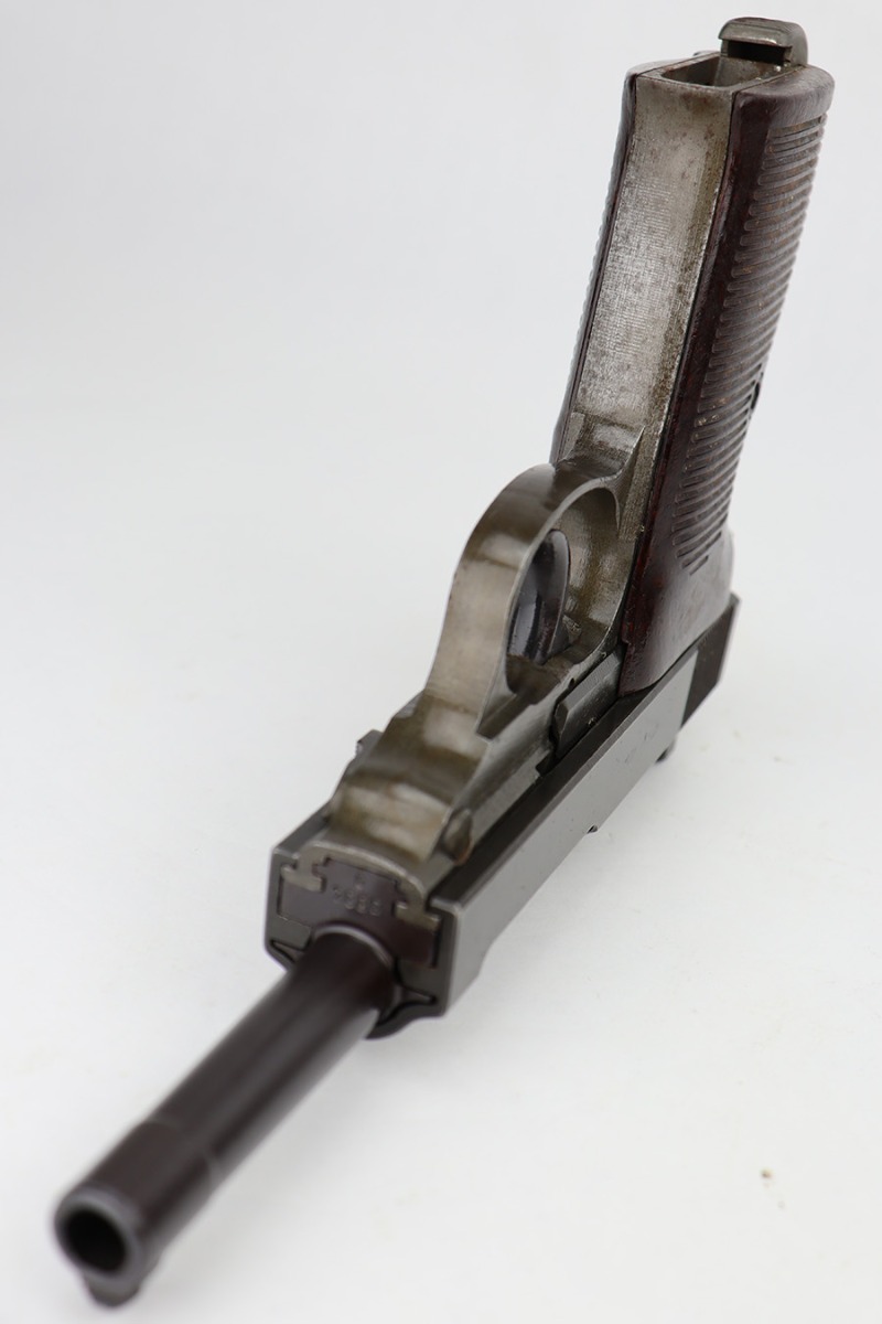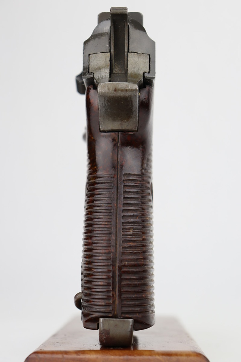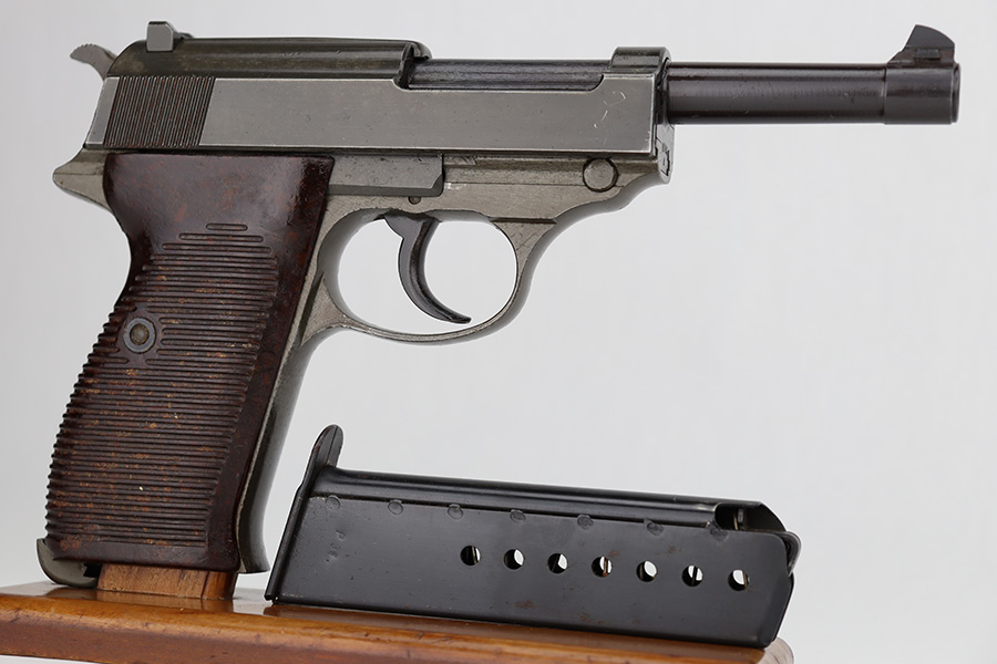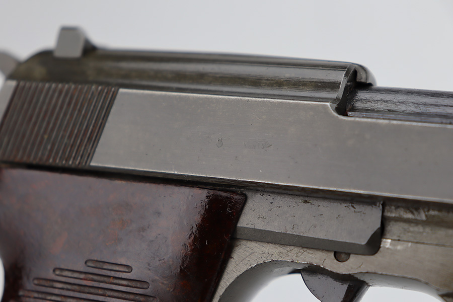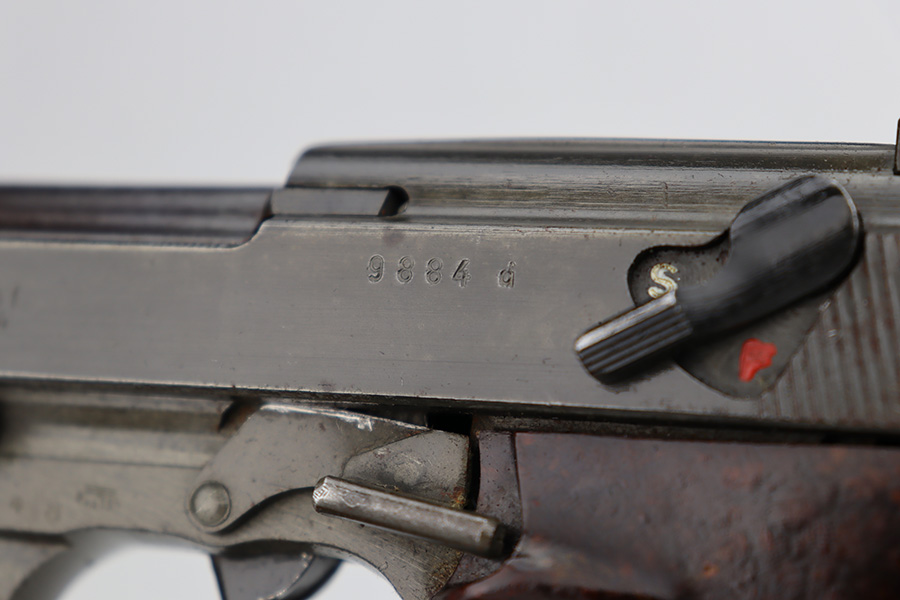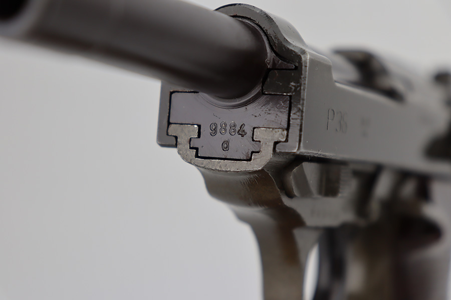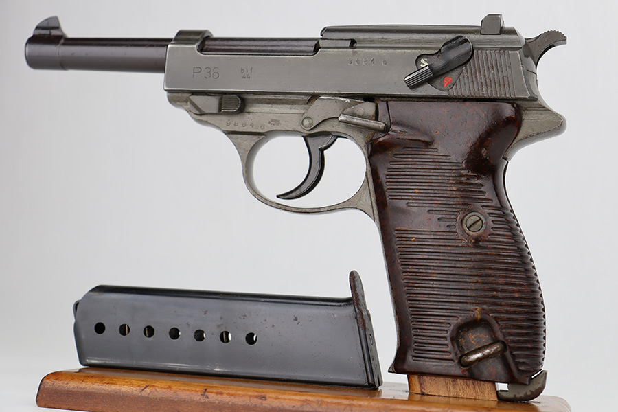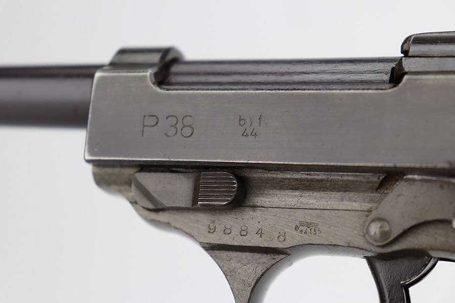 6/12/23 – This is an excellent example of a BYF 44 Mauser P.38 issued to the Nazi military in 1944. All matching with the proper “Waffen 135” military acceptance proofs throughout. The frame and slide have a phosphate finish and the barrel is blued, giving the gun its iconic dual-tone finish. It has retained about 98% of its original finish with minor thinning and light spotty oxidation on the front strap. A couple of very light scratches at the right front of the slide. Since the majority of the finish loss is on the front strap, the profile views are minty. One spot of some surface rust on the magazine release. Fitted with excellent reddish bakelite grips. Comes with a period-correct “Waffen 135” marked Mauser magazine. Near-mint bore. De-cocker is functional.