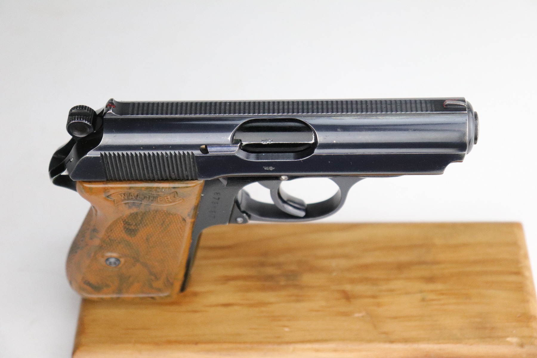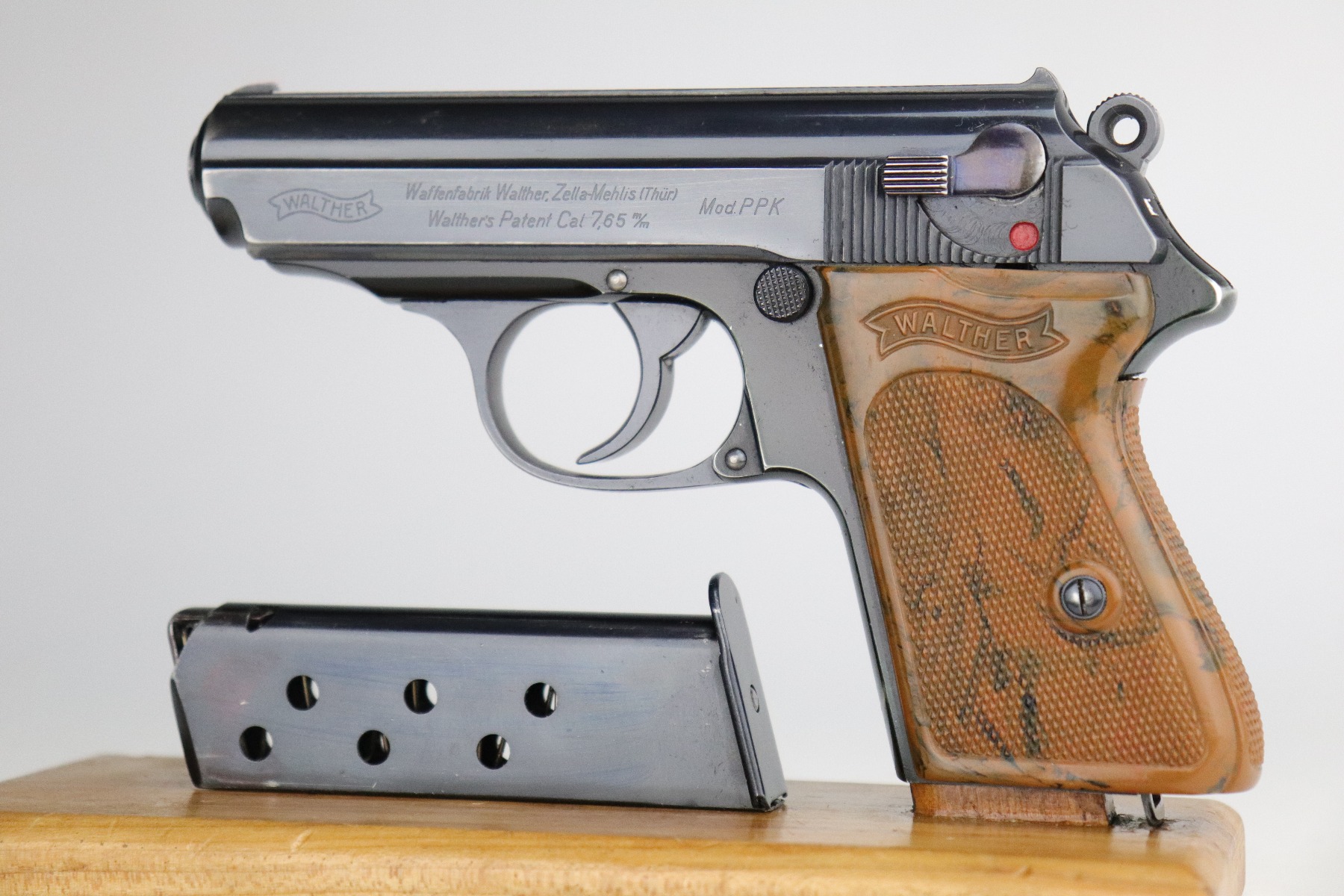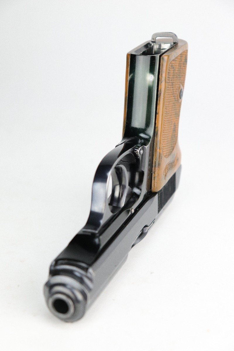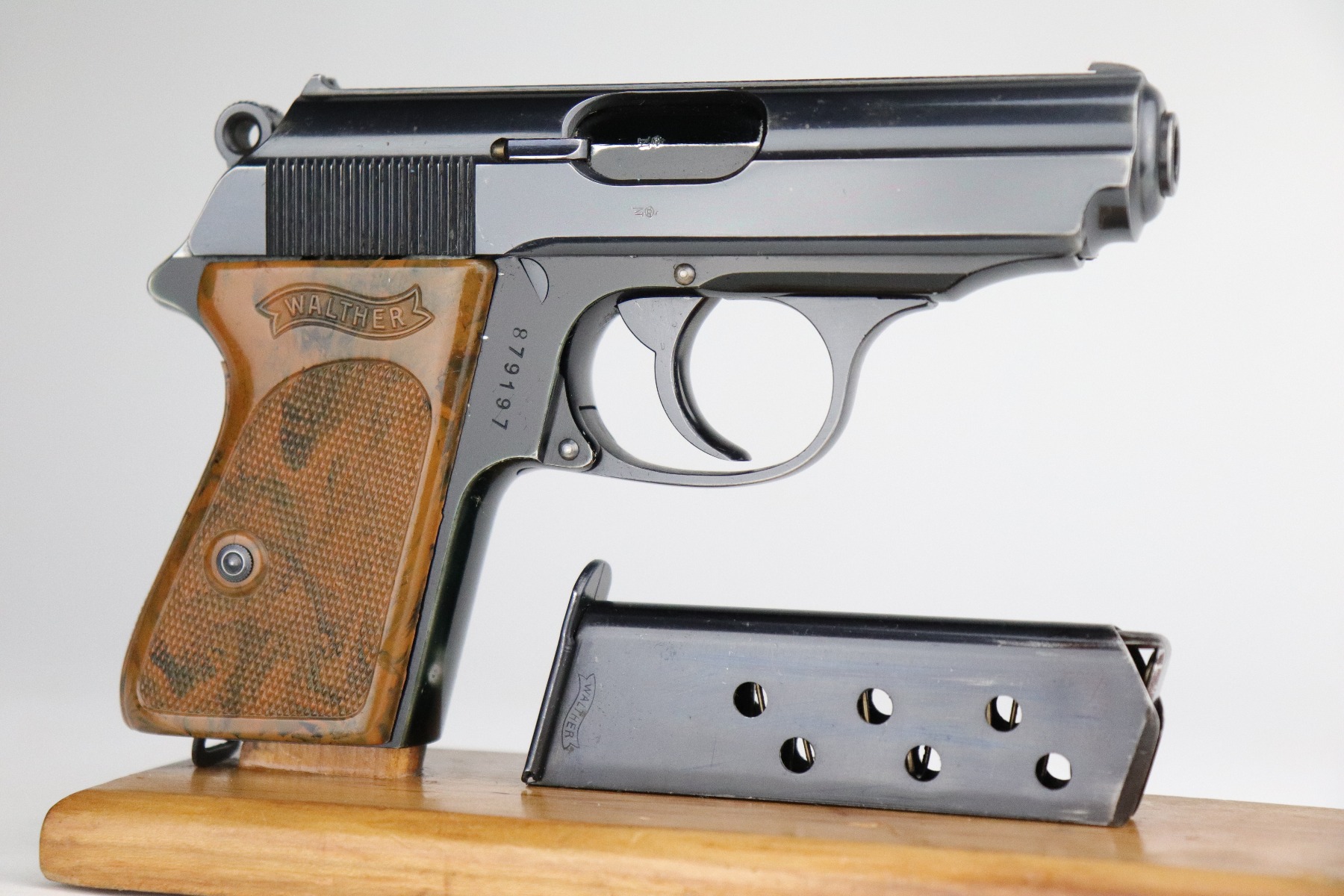 8/20/20 – This is an excellent, duraluminum-frame, Walther PPK made for the commercial market in 1935. It is all matching. This gun is in beautiful condition. It has retained about 97% of its original finish. There is very minor muzzle wear and a few small dots of wear on both sides of the slide. There are minor spots of wear on the front strap and on the tang. It has a minty brown Walther grip and comes with an excellent, early, Walther banner-only magazine. The bore is excellent – shiny with strong rifling.