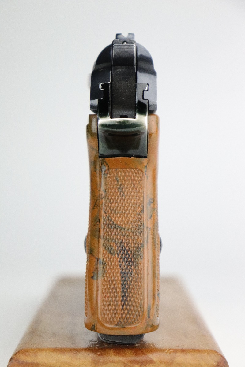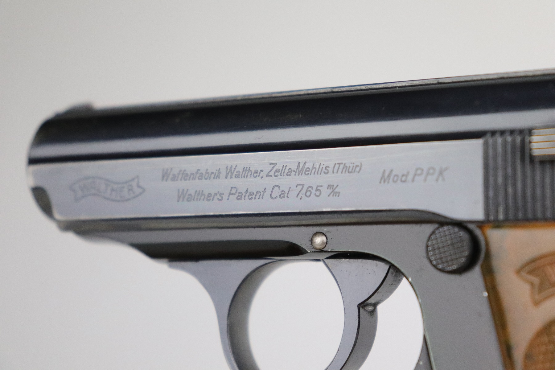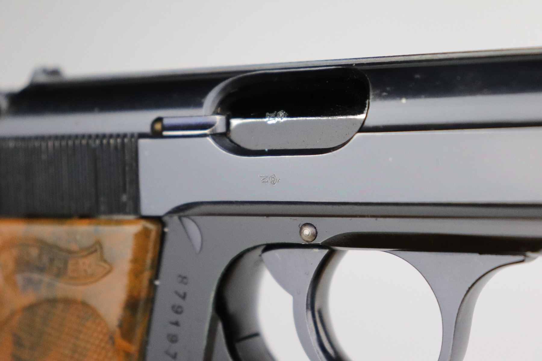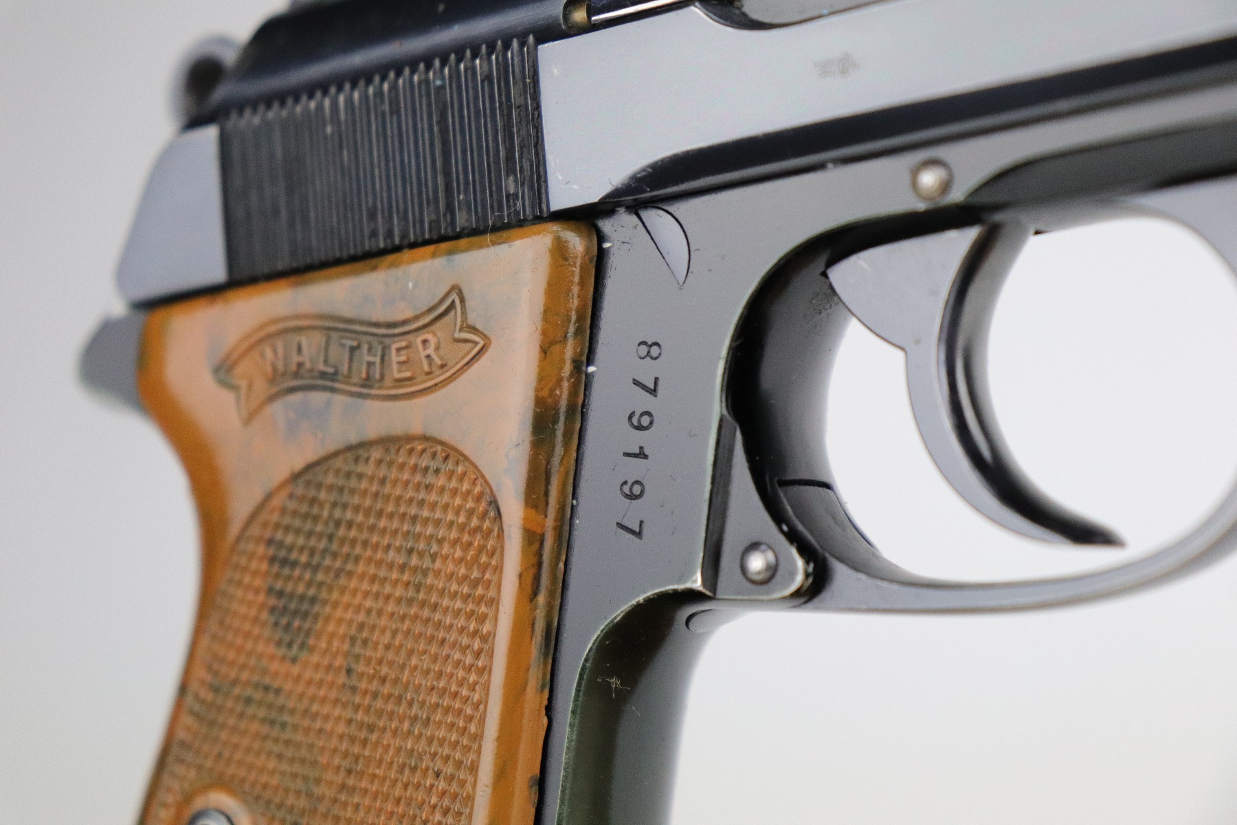 8/20/20 – This is an excellent, duraluminum-frame, Walther PPK made for the commercial market in 1935. It is all matching. This gun is in beautiful condition. It has retained about 97% of its original finish. There is very minor muzzle wear and a few small dots of wear on both sides of the slide. There are minor spots of wear on the front strap and on the tang. It has a minty brown Walther grip and comes with an excellent, early, Walther banner-only magazine. The bore is excellent – shiny with strong rifling.