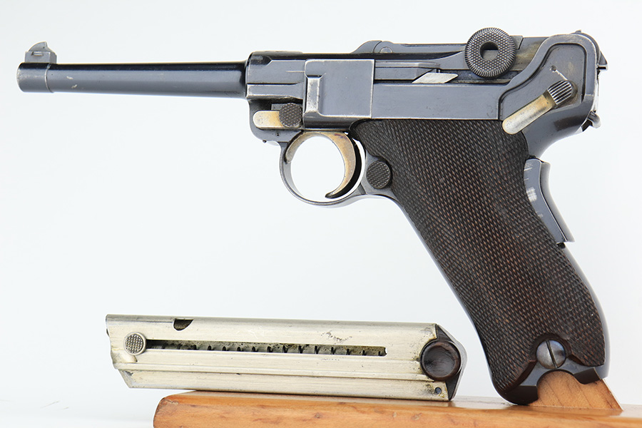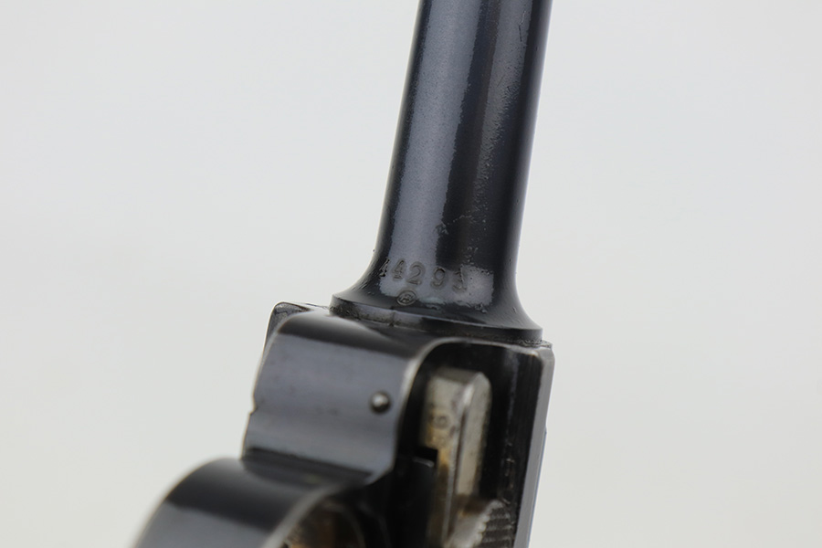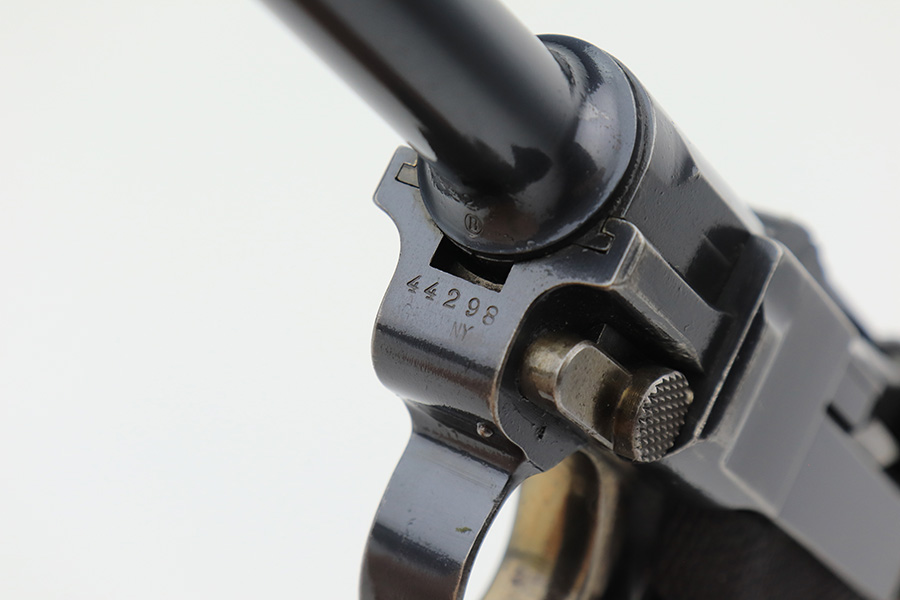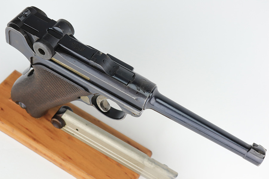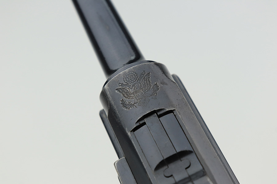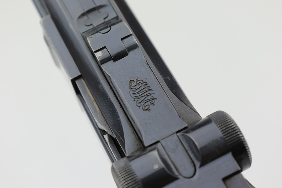 1/23/23 – This is an excellent, all original 1906 DWM American Eagle Luger, chambered in .30 Luger. These pistols went to the US retail market and the manufacturers at DWM realized that nation-based crests increased sales of these Lugers, so that is why you find the American Eagle over the chamber. This is also why you see GERMANY marked on the frame, denoting these were exported for commercial sale. This particular gun has retained about 96-97% of its original bluing. Areas of very minor wear around the muzzle, on the side plate, and on the side rails. Some very light scratchy wear on the front strap and very minor freckling on both straps. Comes with nice period-correct wood grips and a properly-blank wood bottom magazine. The bore has good rifling with very minor pin-pricking throughout.