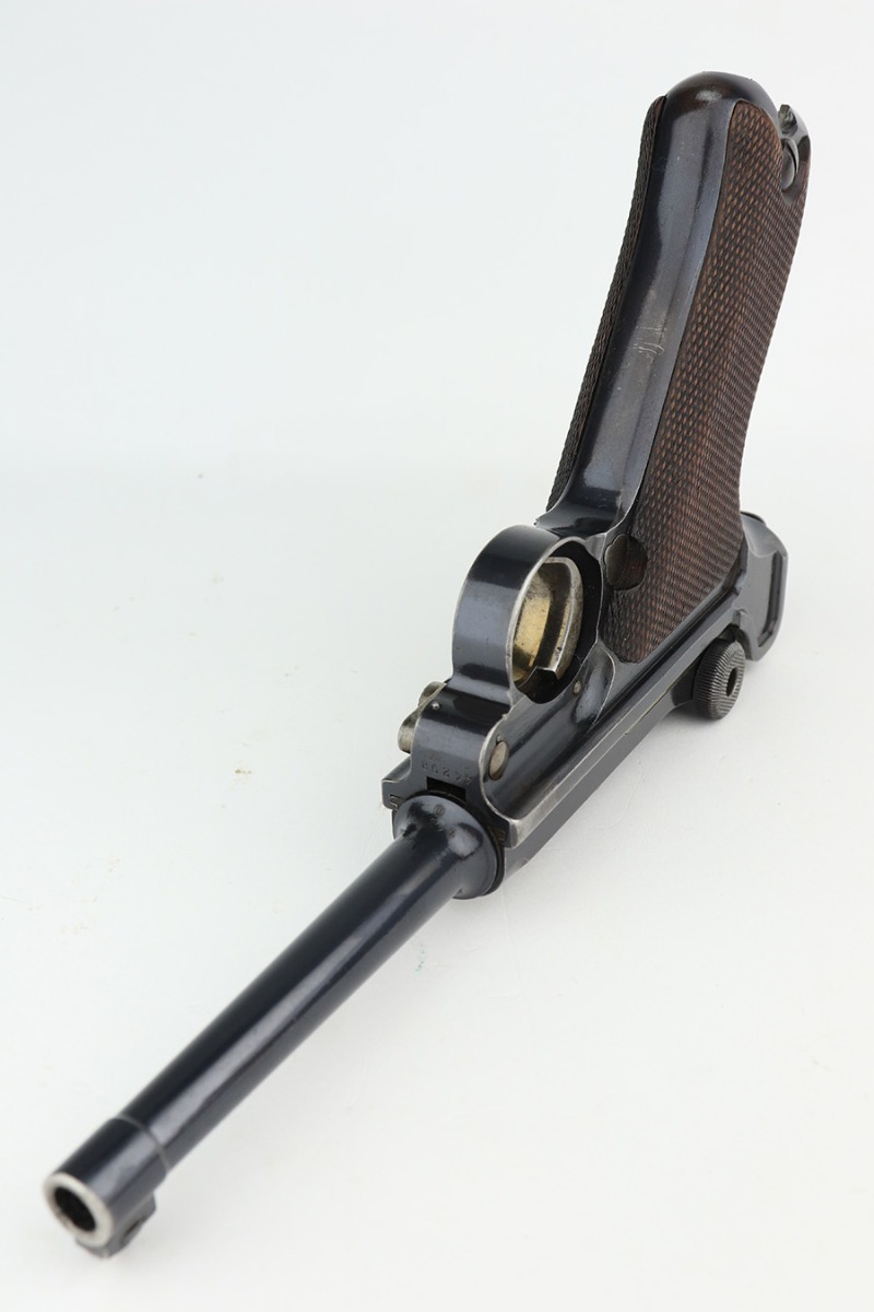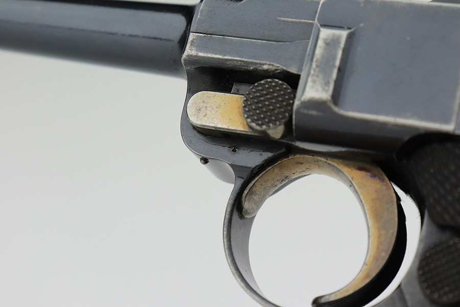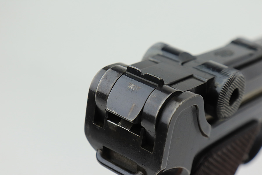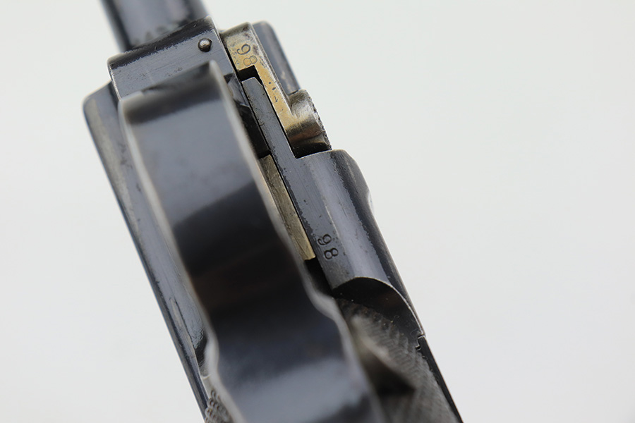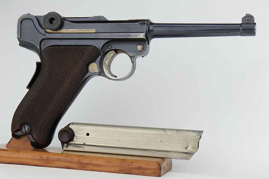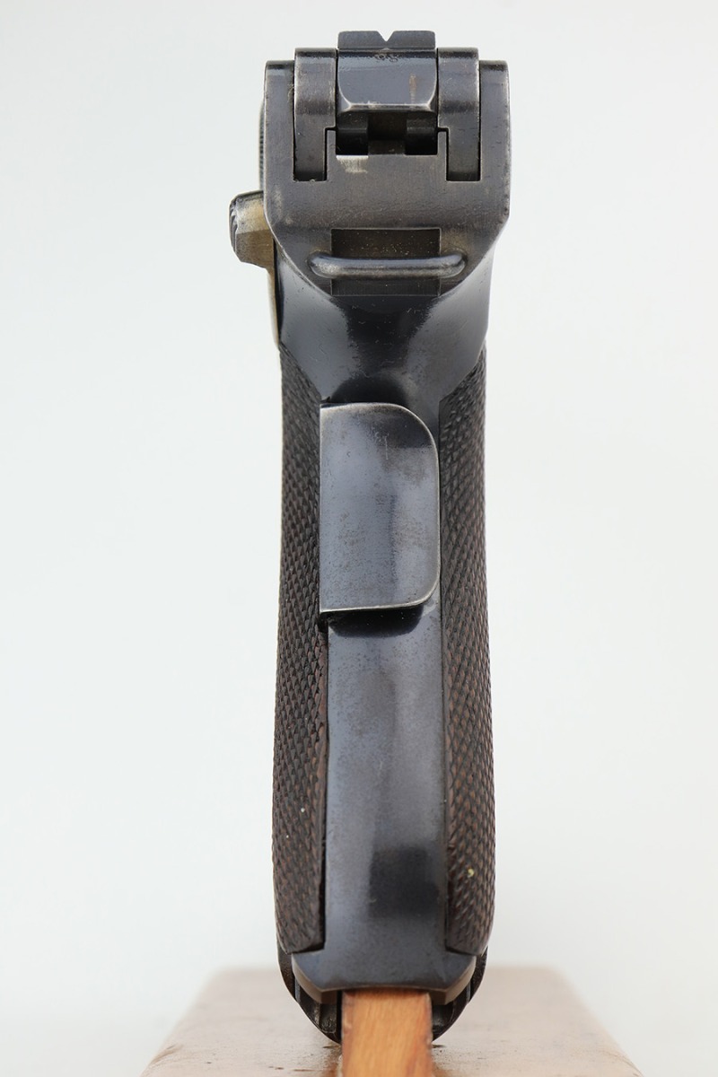 1/23/23 – This is an excellent, all original 1906 DWM American Eagle Luger, chambered in .30 Luger. These pistols went to the US retail market and the manufacturers at DWM realized that nation-based crests increased sales of these Lugers, so that is why you find the American Eagle over the chamber. This is also why you see GERMANY marked on the frame, denoting these were exported for commercial sale. This particular gun has retained about 96-97% of its original bluing. Areas of very minor wear around the muzzle, on the side plate, and on the side rails. Some very light scratchy wear on the front strap and very minor freckling on both straps. Comes with nice period-correct wood grips and a properly-blank wood bottom magazine. The bore has good rifling with very minor pin-pricking throughout.