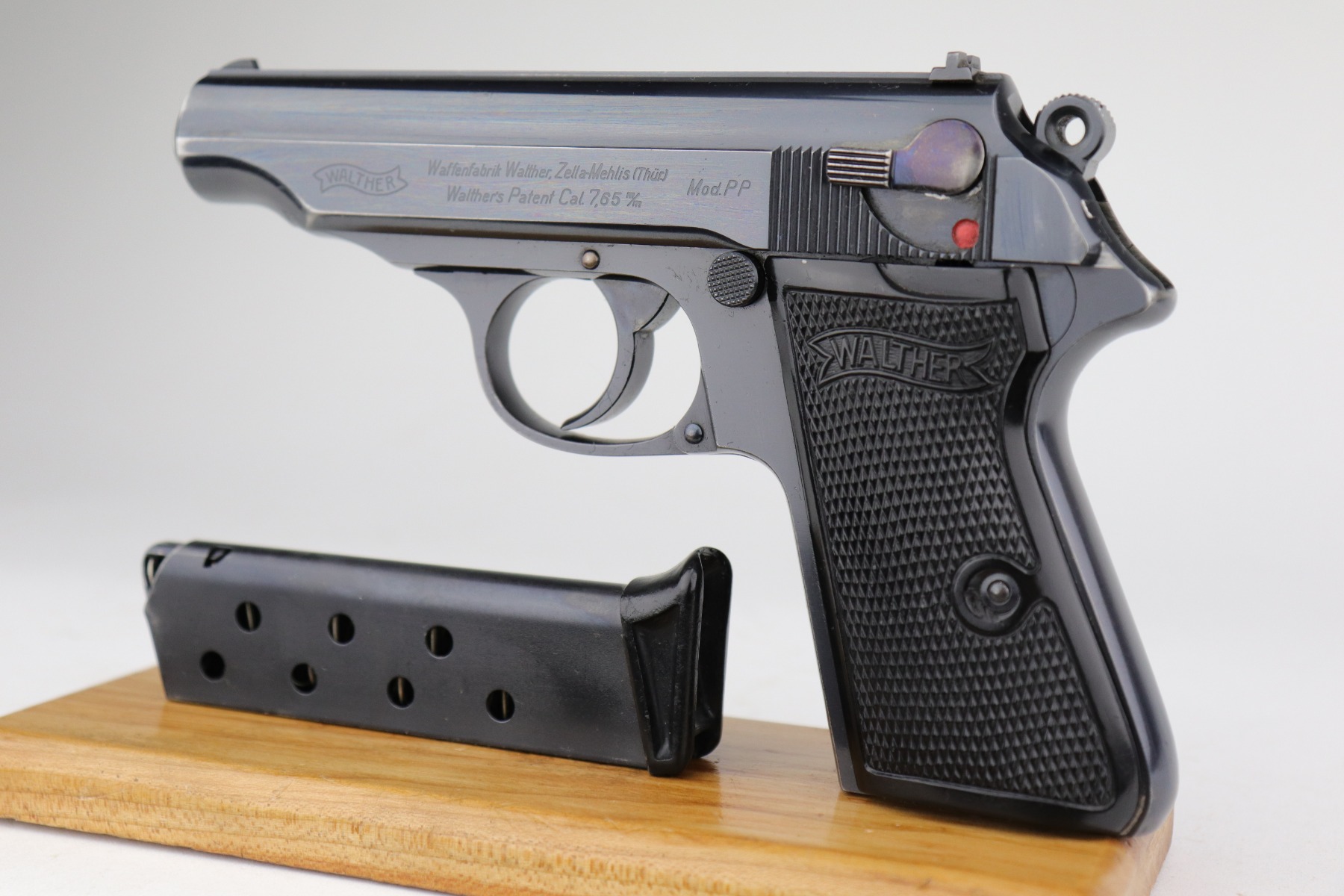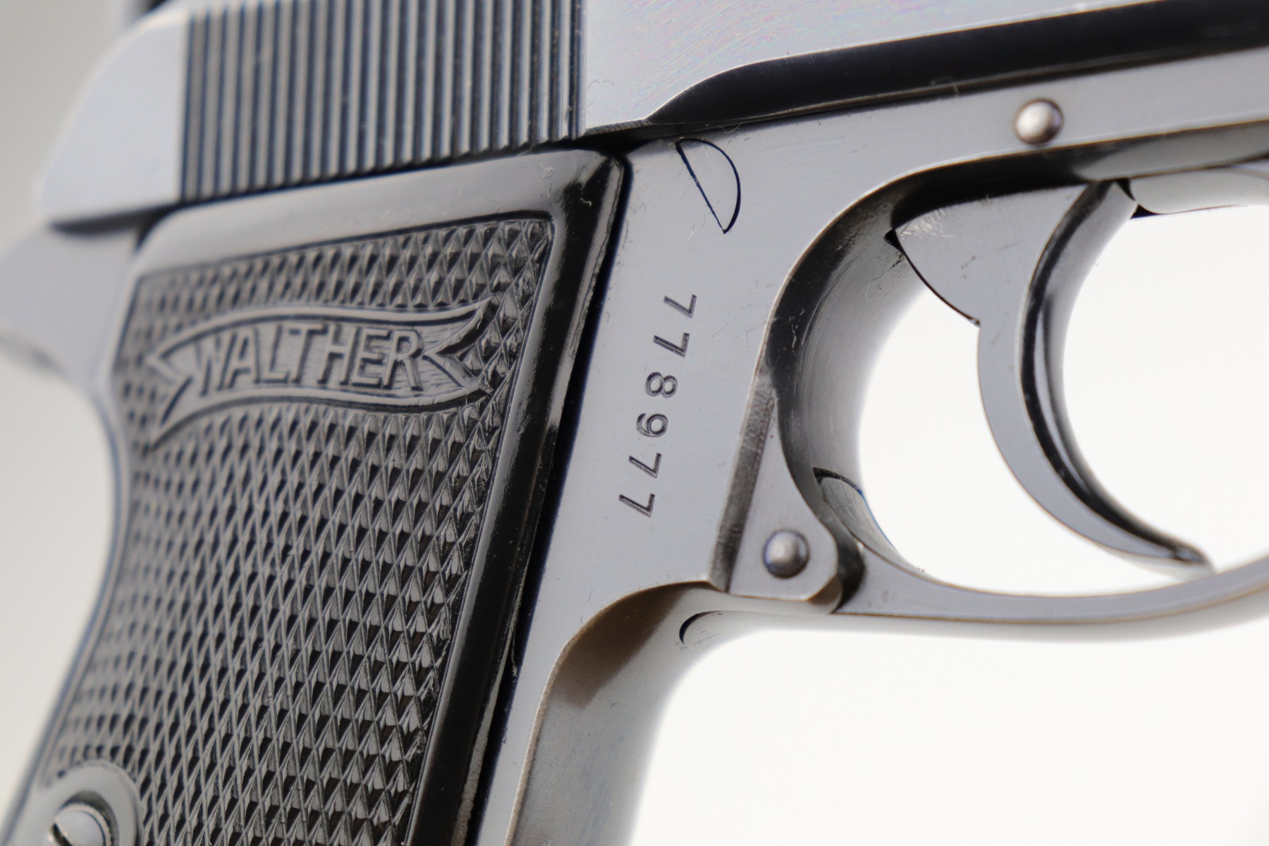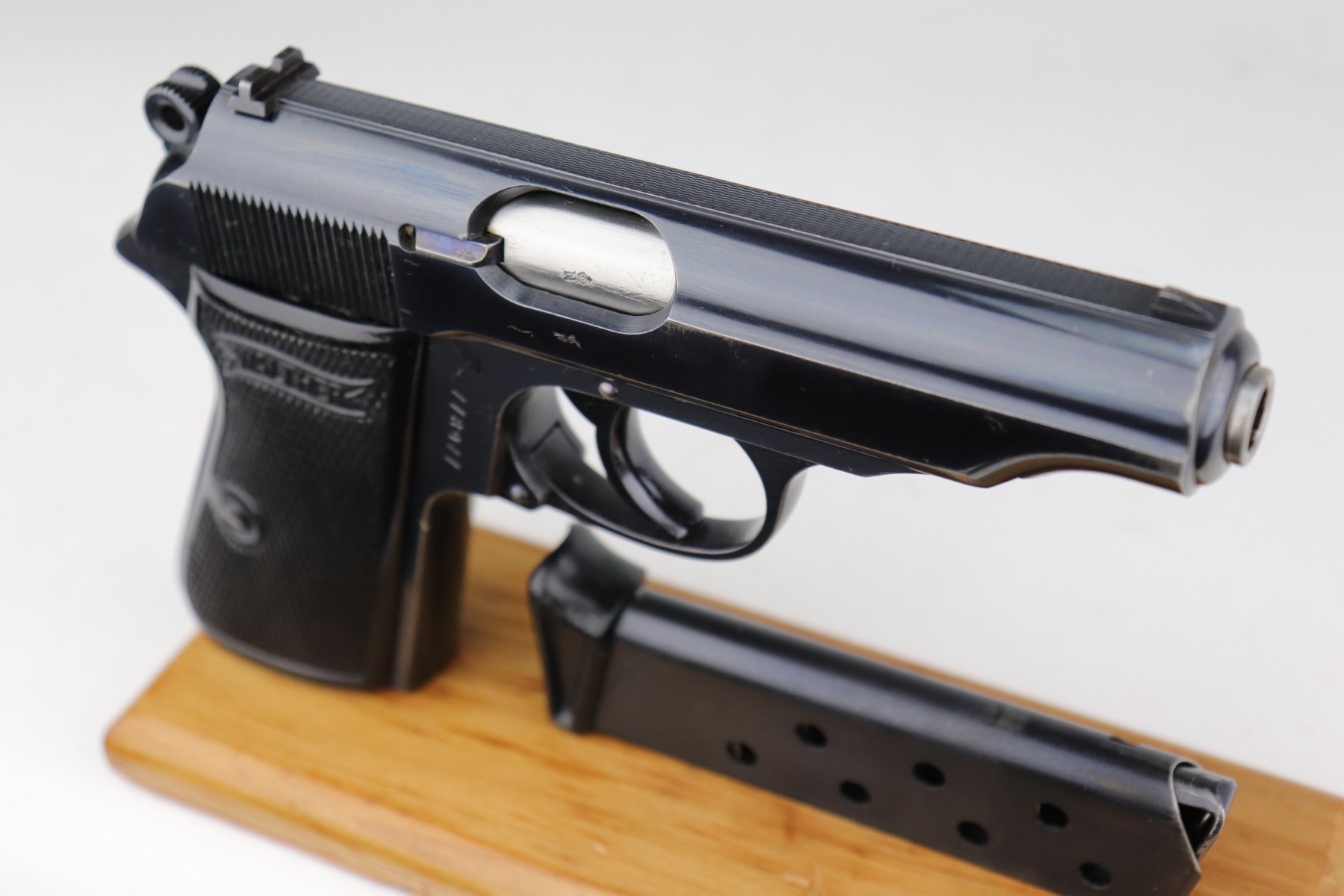 1/4/21 – This is an excellent example of a Walther PP that was sold in the commercial market in 1932. It is all matching and has the proper “Crown N” proofs. It has early features such as 90 safety lever and extended barrel. This one has retained about 96% of its original high polish finish. There is minor wear around the muzzle and some of the high edges. Very light handling marks here and there including the straps. It comes with excellent early weighted grips and a finger extension magazine. The bore is mint.