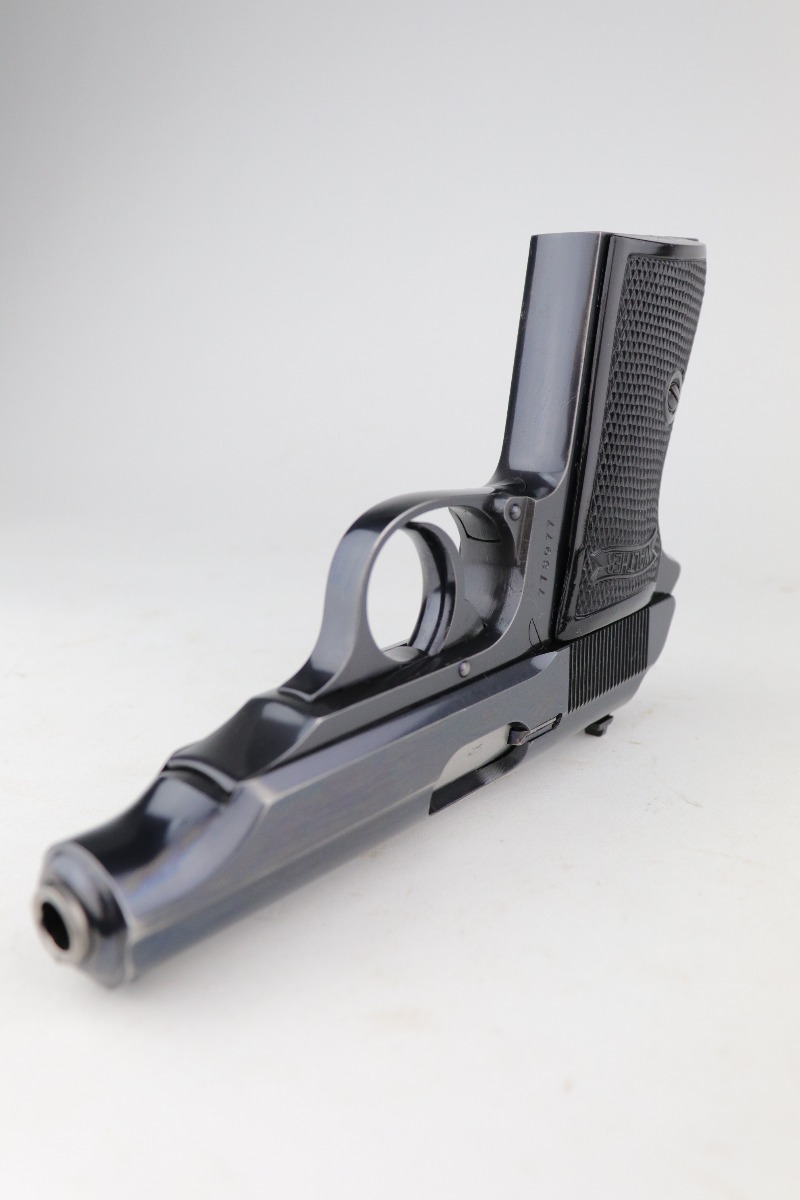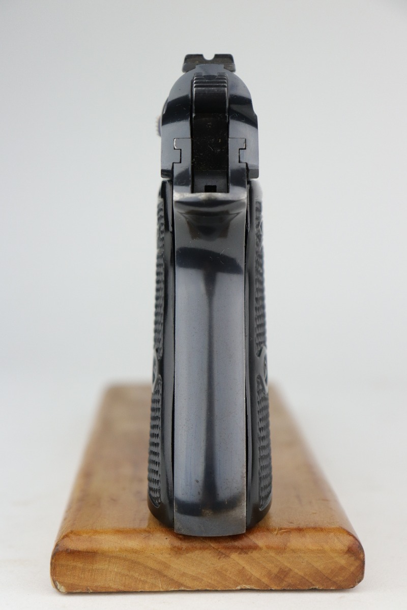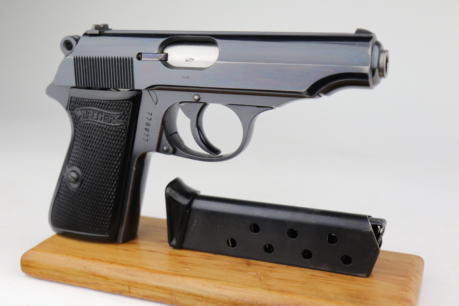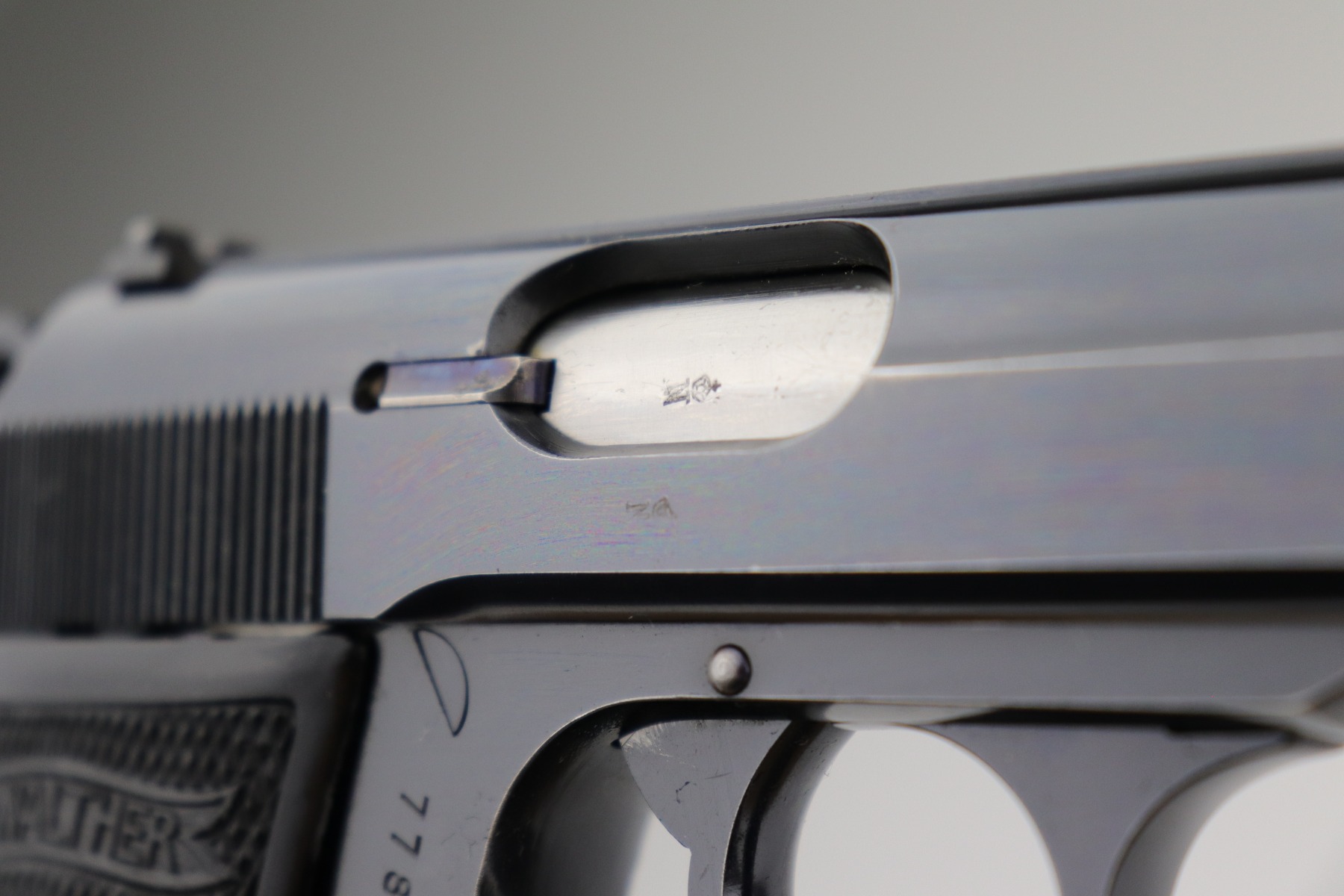 1/4/21 – This is an excellent example of a Walther PP that was sold in the commercial market in 1932. It is all matching and has the proper “Crown N” proofs. It has early features such as 90 safety lever and extended barrel. This one has retained about 96% of its original high polish finish. There is minor wear around the muzzle and some of the high edges. Very light handling marks here and there including the straps. It comes with excellent early weighted grips and a finger extension magazine. The bore is mint.