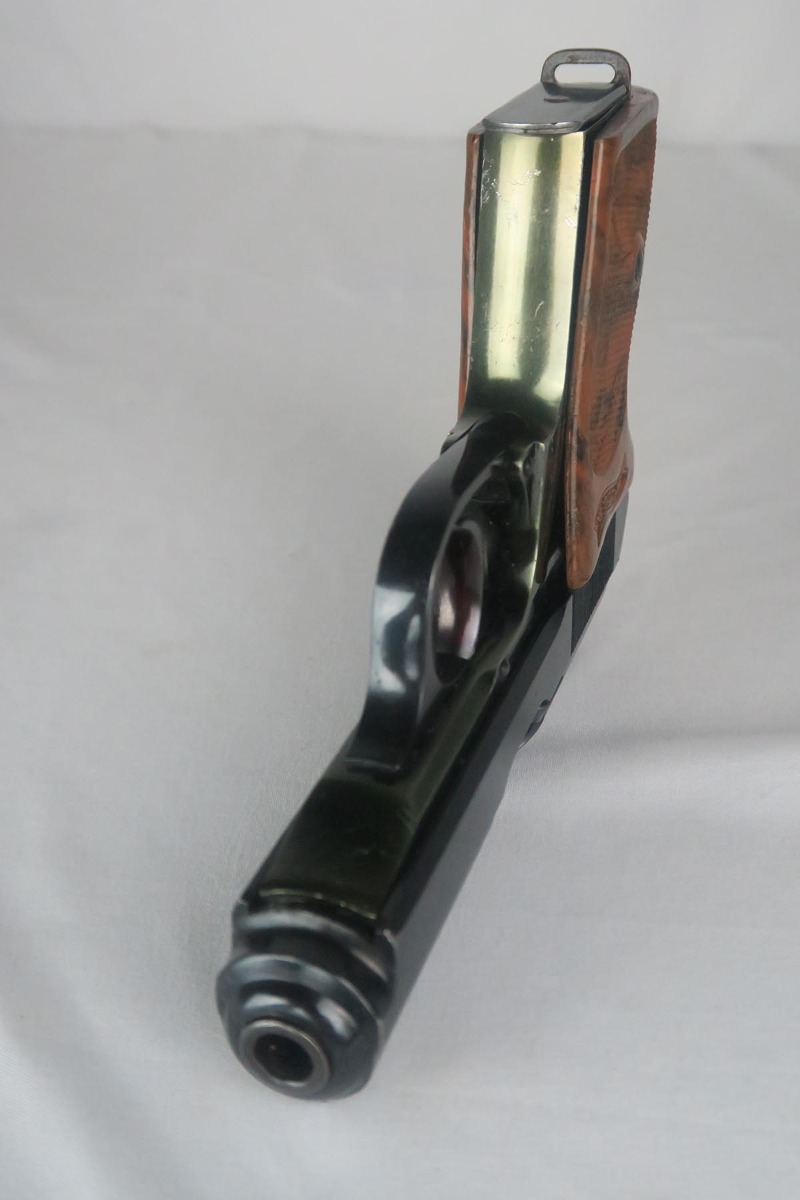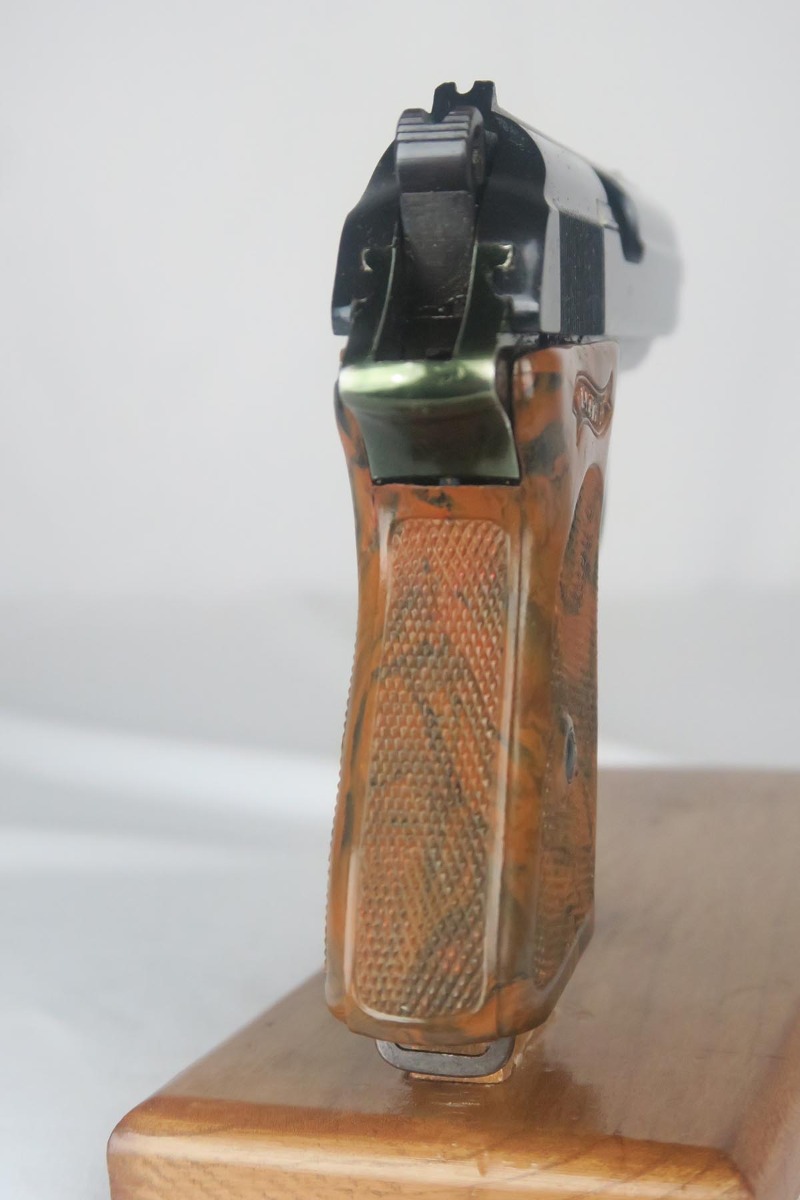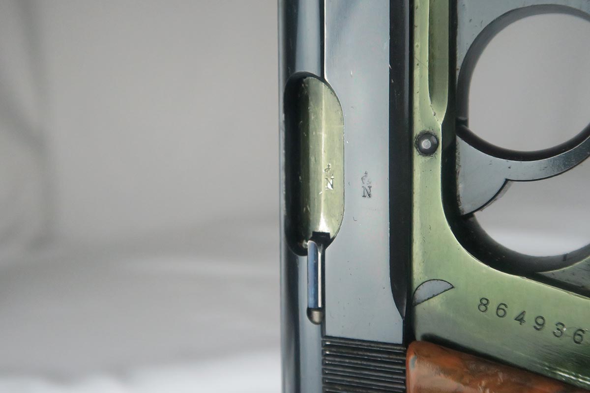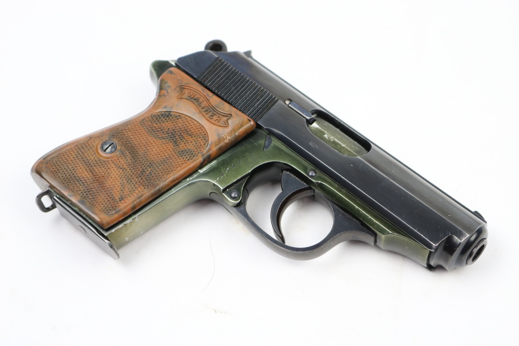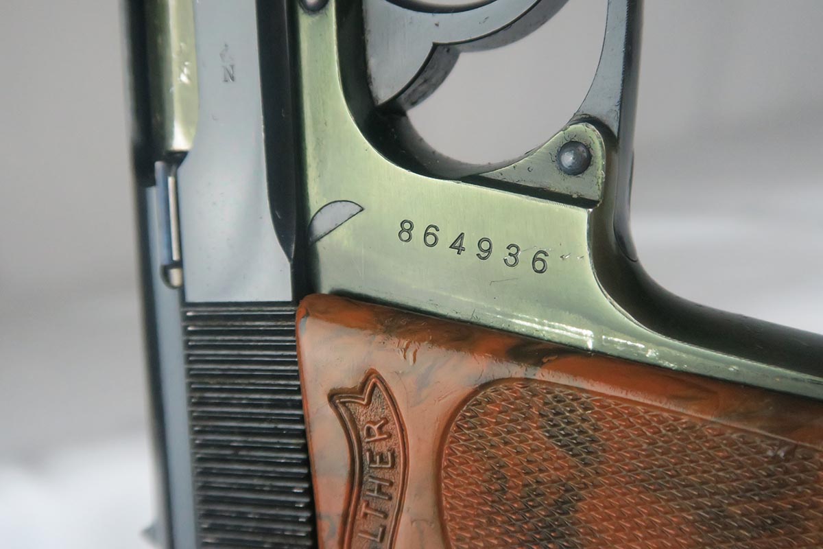 1/30/18 – This is an early and scarce Walther PPK with duraluminum frame.  I call this one a “dual-tone” because the anodized finish shows a bright green on the frame, with a minty high-polish blue on the slide.  The contrast is most striking than the photos show, and very cool looking.  The frame shows a few scuffs and minor thinning of the finish, while the slide is near-mint.  Excellent bore and early banner magazine.  The grip shows a couple small surface cracks.