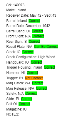 12/15/21 – This is an excellent example of an early Inland M1 Carbine issued to the US military in 1942. A full parts list with markings has been included in the photos. It is all correct, except for the trigger which has been replaced. Overall, it is in excellent condition. There are some areas of thinning and small dots of oxidation along the barrel. Very minor wear around the muzzle. The stock is minty with crisp “P” and cross-canon military cartouche markings. Comes with one period-correct magazine. The bore is mint.