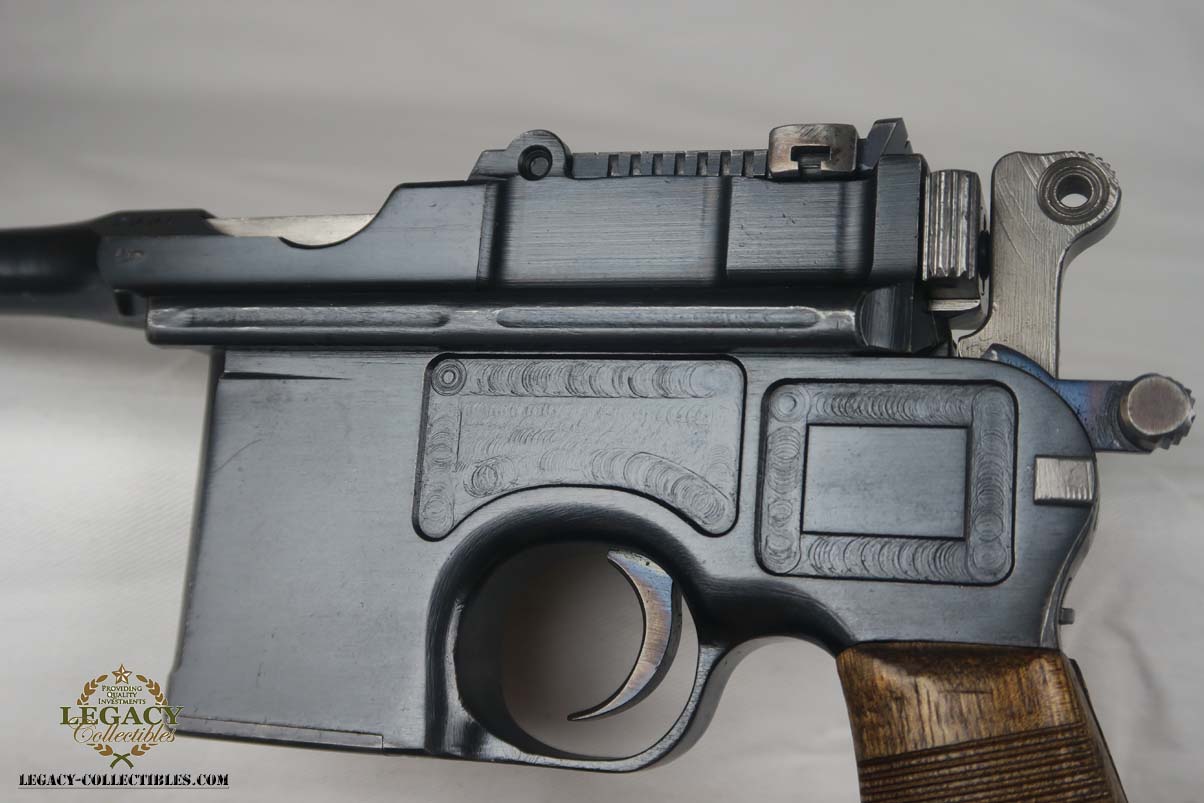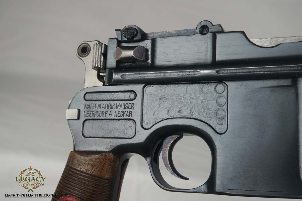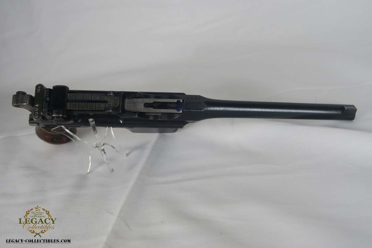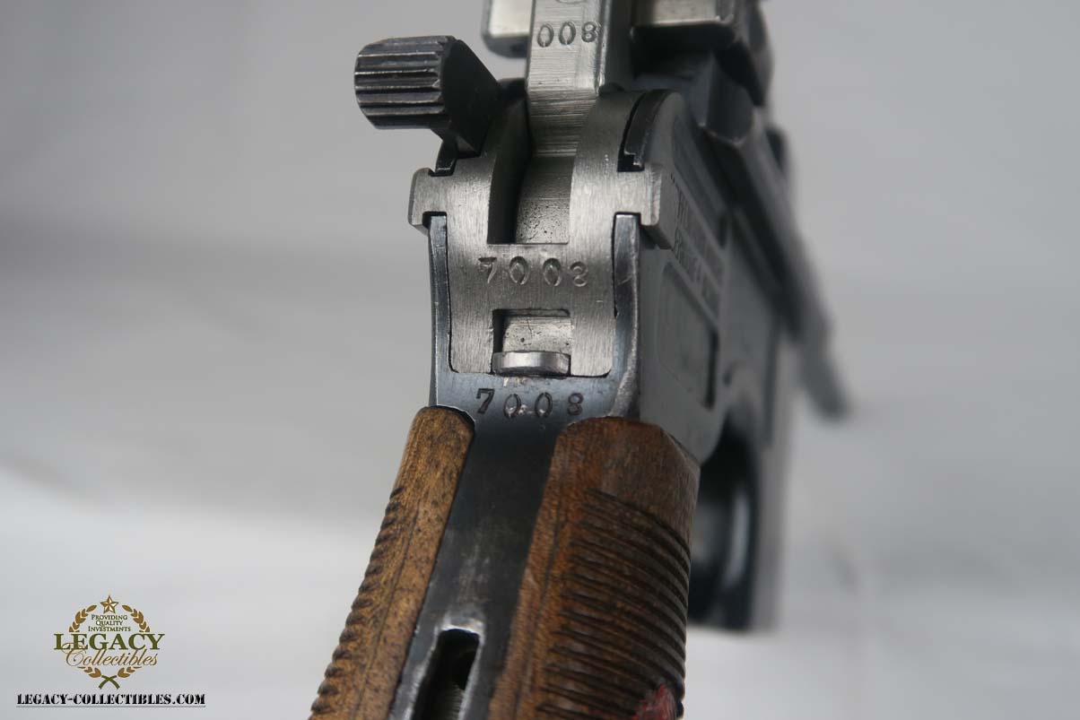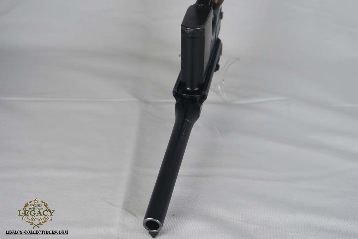 4/17/17 – This is an excellent and original Mauser C96, also known as a Red 9.  It has about 97-98% of its original bluing, making it one of the nicest we’ve had come through the office in recent memory.  It is all matching and correct, including the grips.  The serial is 7008, and given there were about 140,000 of these manufactured, starting at S/N 1, this is one of the earlier Red 9’s you’ll see any time soon!  Other than common edge wear, the only notable spot of wear is on the underside of the barrel, and this is exactly where it would obtain wear from sitting in a stock.  The grips have the number 9 cut into them, and filled with red paint.  This was done to distinguish between the M1896/16 and the M1896/12.  Because the added red 9 was accomplished by various regimental armorers in the field during war time, it varies in size, color and quality.  This pistol has a minty bore with no issues to mention.  Another pistol that would be tough to upgrade!