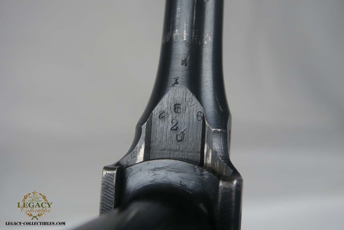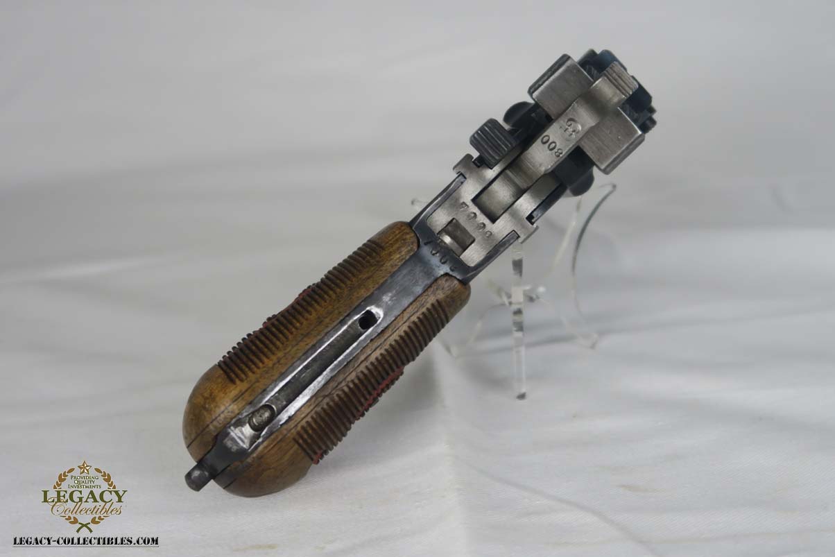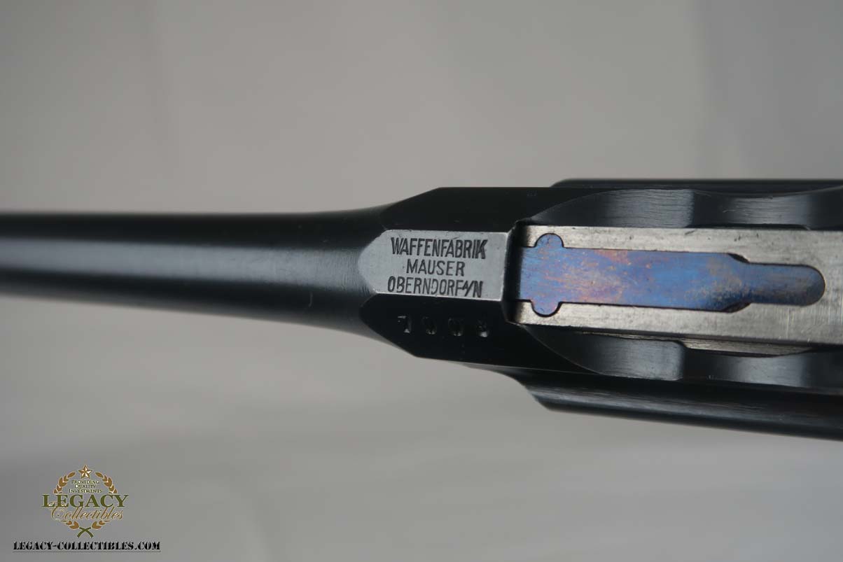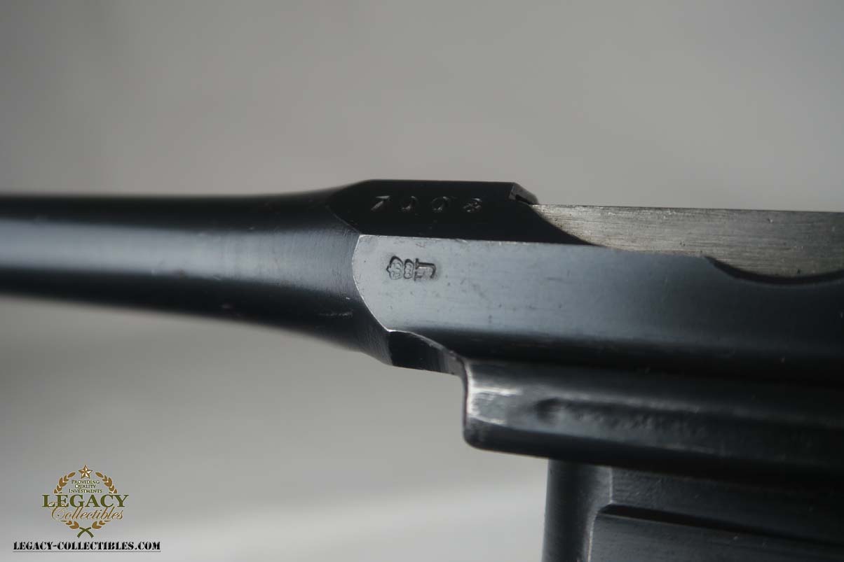 4/17/17 – This is an excellent and original Mauser C96, also known as a Red 9.  It has about 97-98% of its original bluing, making it one of the nicest we’ve had come through the office in recent memory.  It is all matching and correct, including the grips.  The serial is 7008, and given there were about 140,000 of these manufactured, starting at S/N 1, this is one of the earlier Red 9’s you’ll see any time soon!  Other than common edge wear, the only notable spot of wear is on the underside of the barrel, and this is exactly where it would obtain wear from sitting in a stock.  The grips have the number 9 cut into them, and filled with red paint.  This was done to distinguish between the M1896/16 and the M1896/12.  Because the added red 9 was accomplished by various regimental armorers in the field during war time, it varies in size, color and quality.  This pistol has a minty bore with no issues to mention.  Another pistol that would be tough to upgrade!