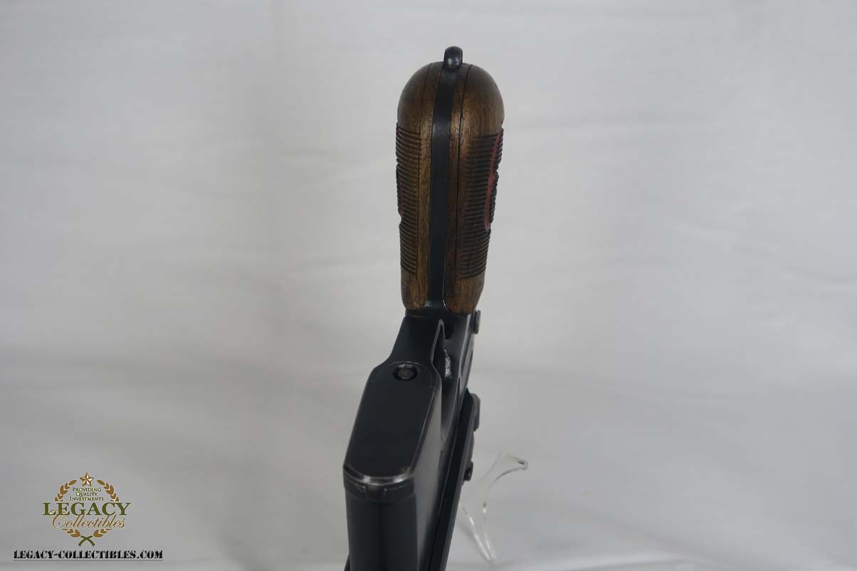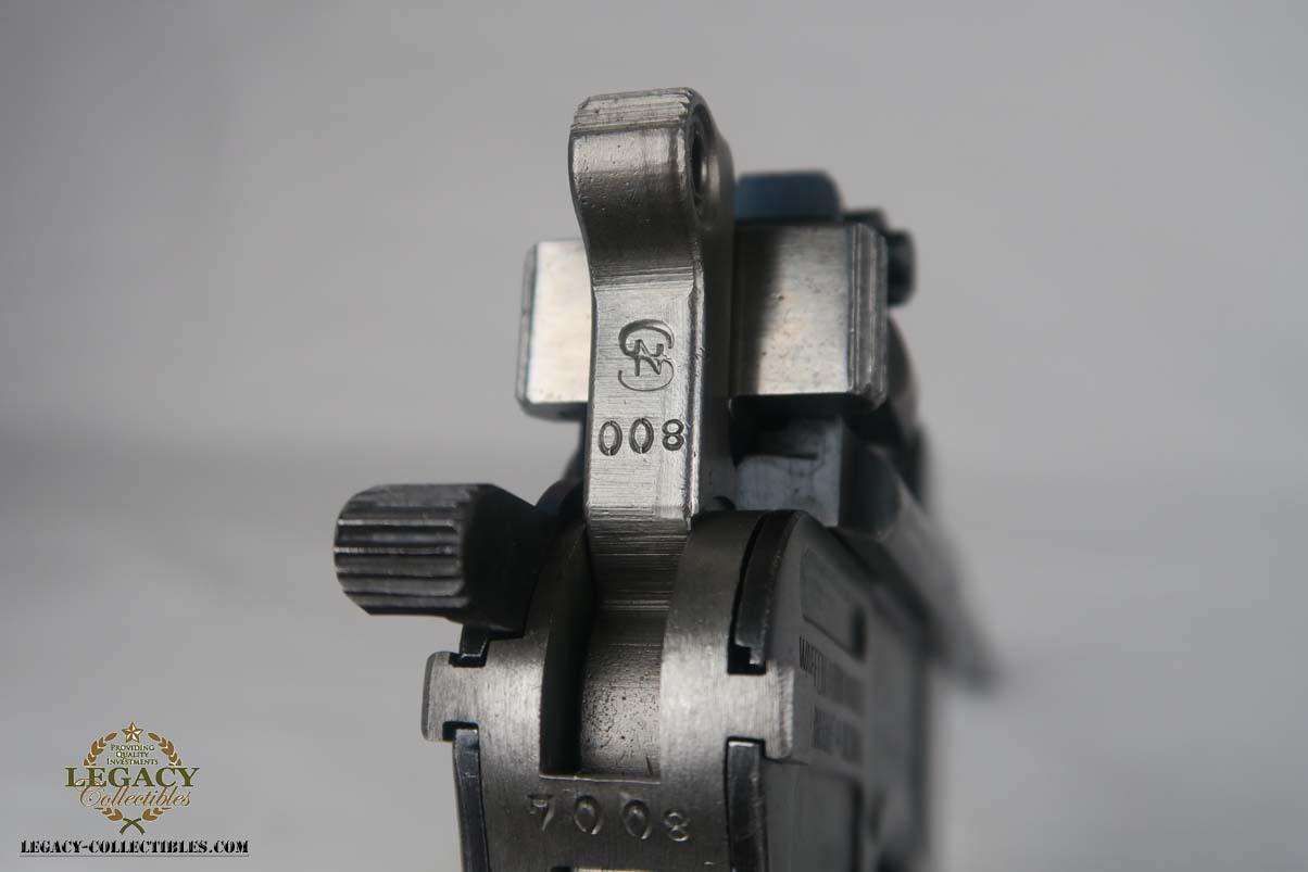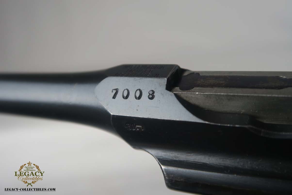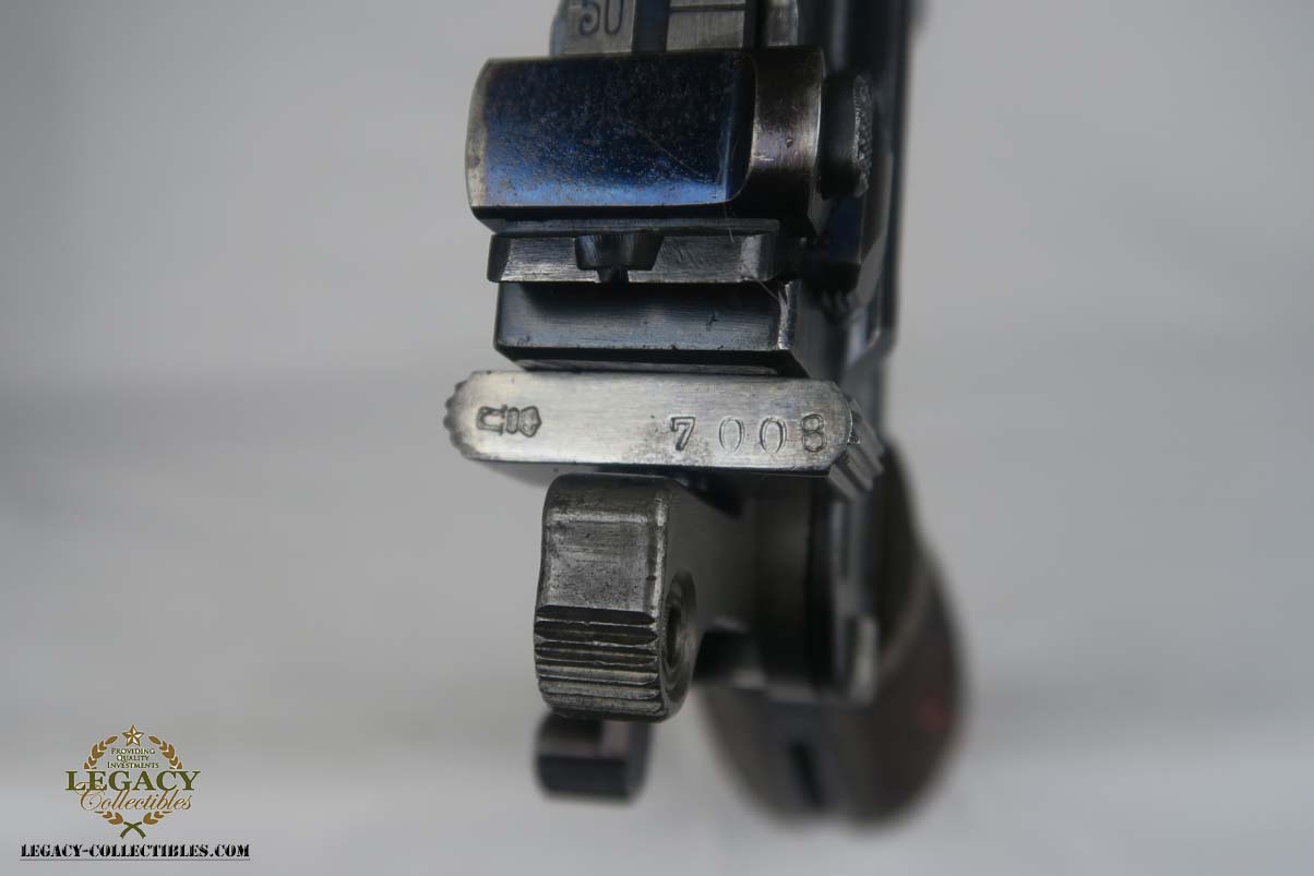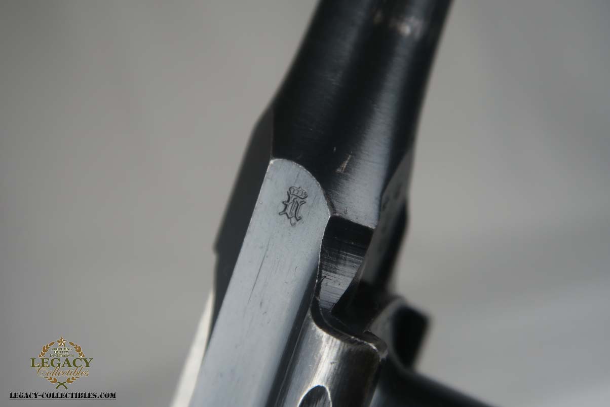 4/17/17 – This is an excellent and original Mauser C96, also known as a Red 9.  It has about 97-98% of its original bluing, making it one of the nicest we’ve had come through the office in recent memory.  It is all matching and correct, including the grips.  The serial is 7008, and given there were about 140,000 of these manufactured, starting at S/N 1, this is one of the earlier Red 9’s you’ll see any time soon!  Other than common edge wear, the only notable spot of wear is on the underside of the barrel, and this is exactly where it would obtain wear from sitting in a stock.  The grips have the number 9 cut into them, and filled with red paint.  This was done to distinguish between the M1896/16 and the M1896/12.  Because the added red 9 was accomplished by various regimental armorers in the field during war time, it varies in size, color and quality.  This pistol has a minty bore with no issues to mention.  Another pistol that would be tough to upgrade!