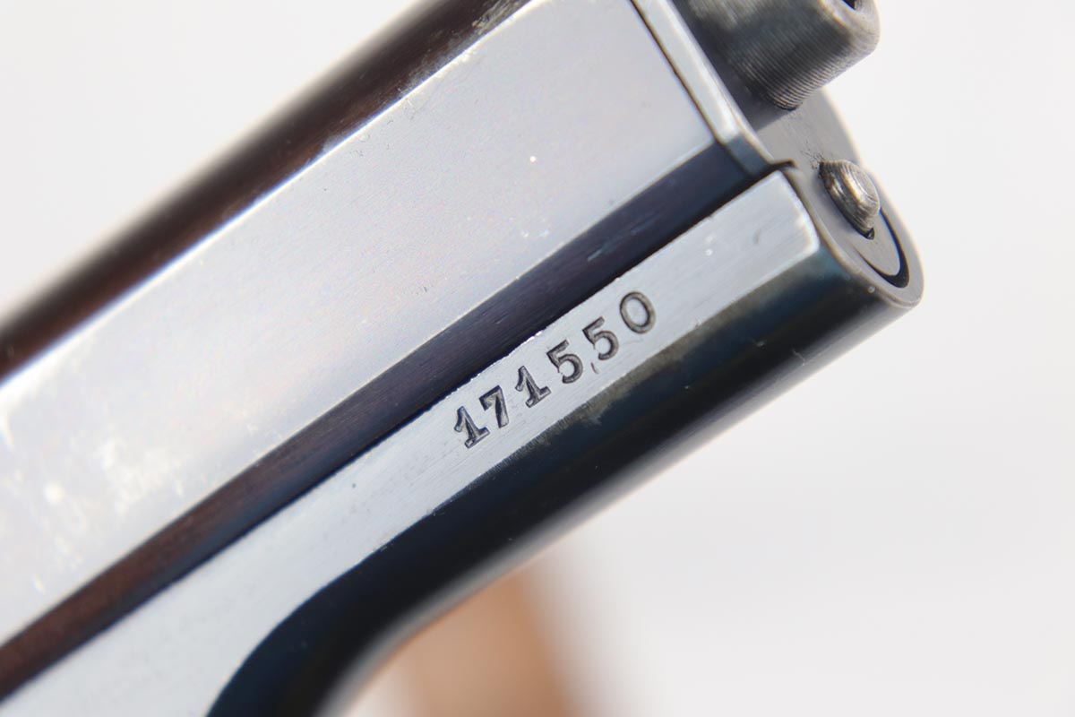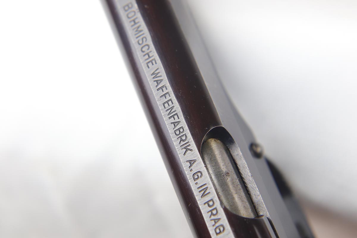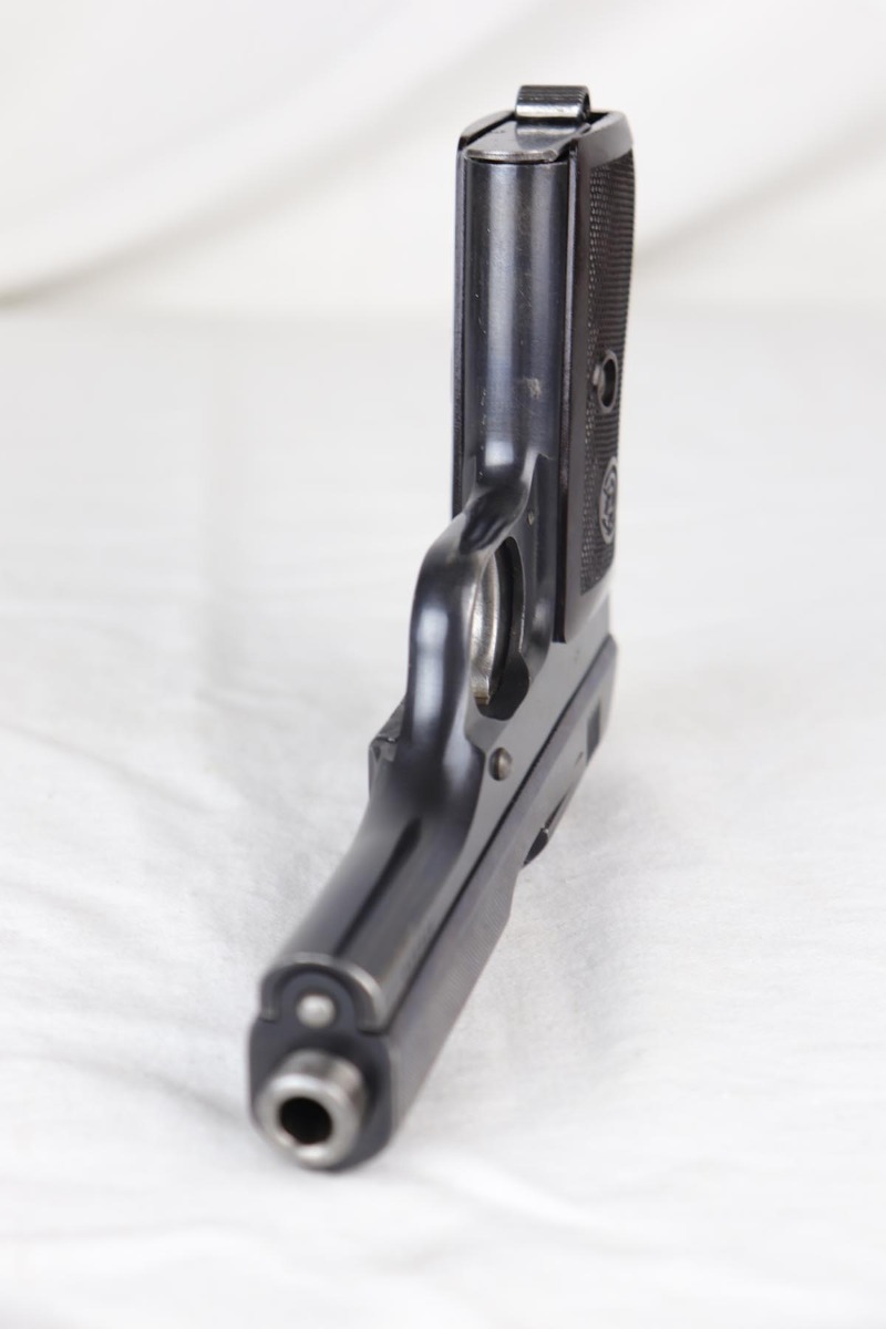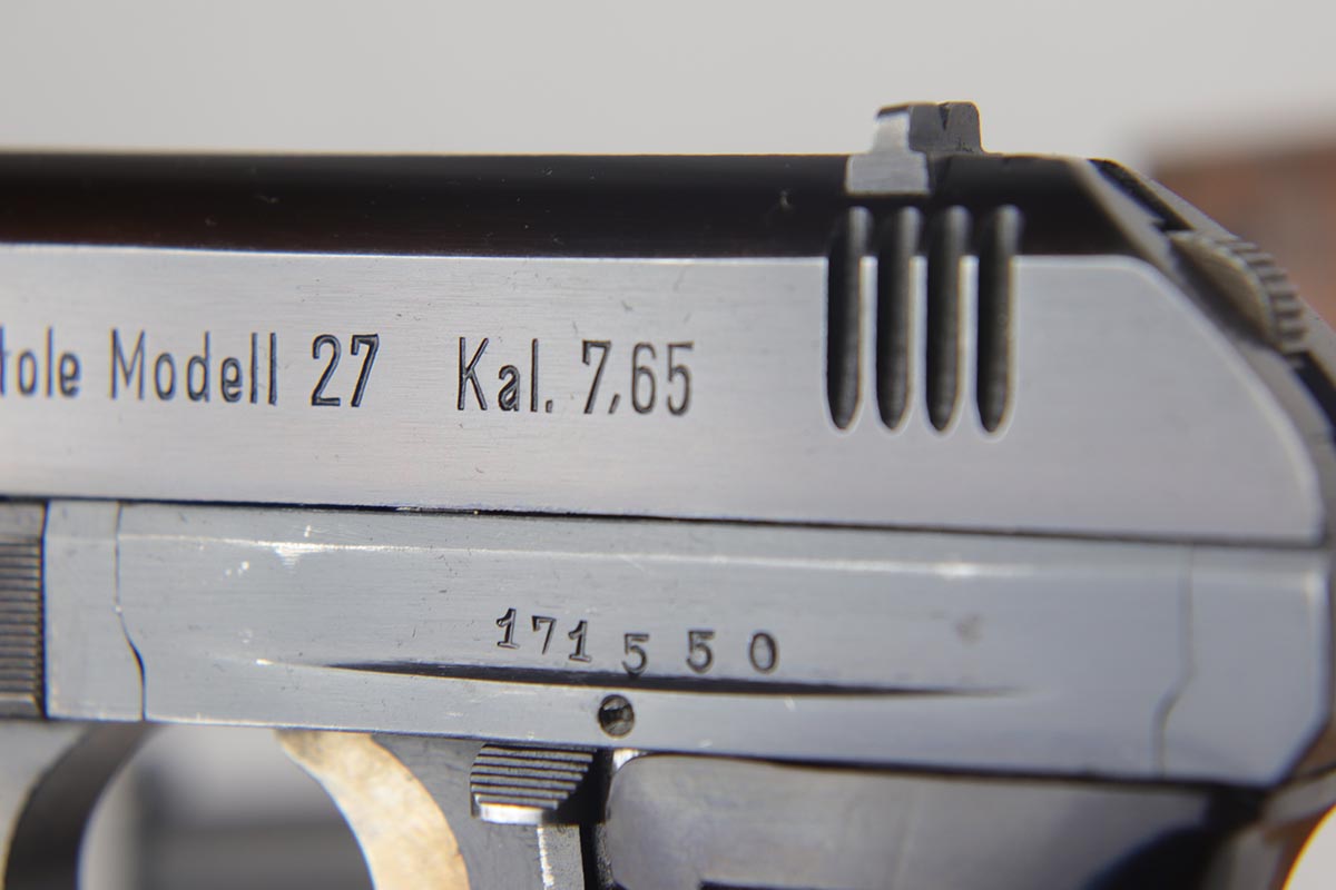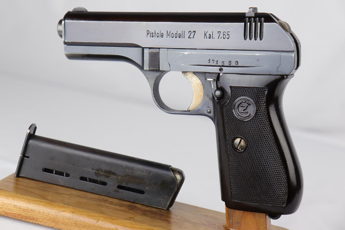 7/19/18 – This is a very nice, high-polish CZ model 27 pistol, manufactured in the early 40s for use by the German Army.  The slide has a nice plum hue to it, and contrasts the bright blue of the frame nicely.  About 95-96% original blue remains, with an area of finish loss in front of the ejection port, and some thinning on the trigger guard/front strap.  Excellent original grip with no chips or cracks.  All matching pistol with very nice bore.