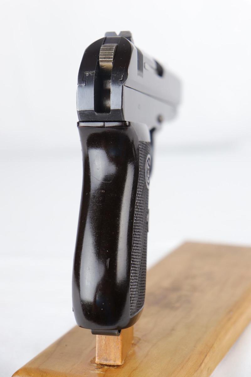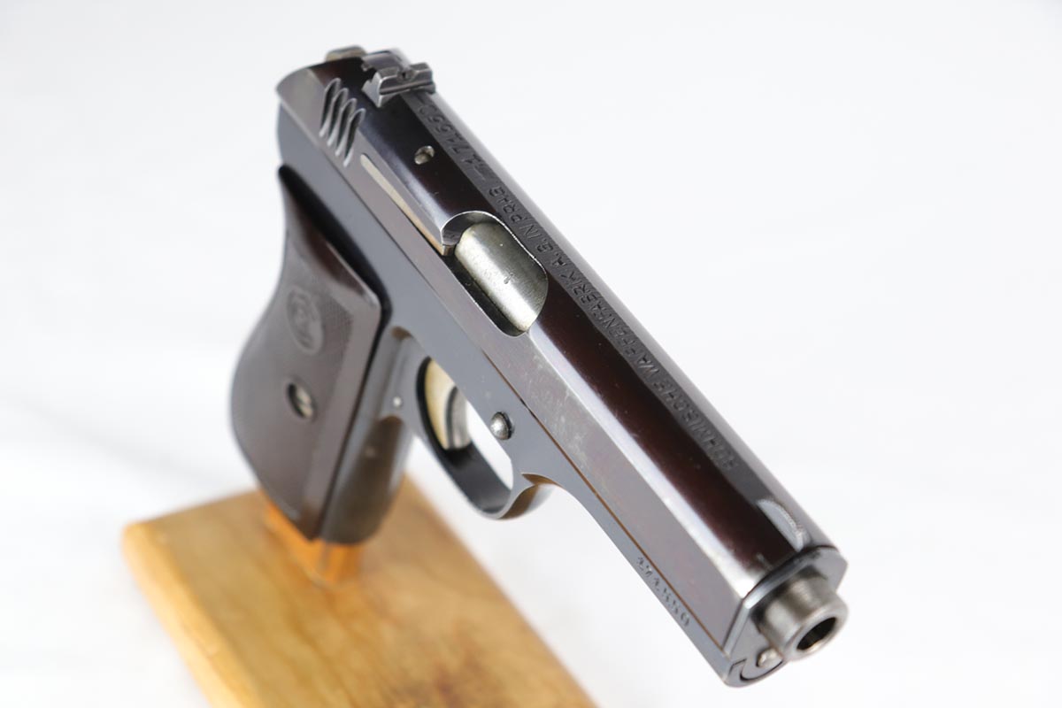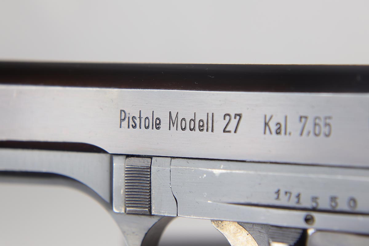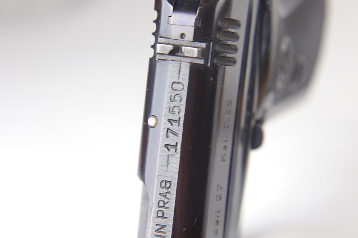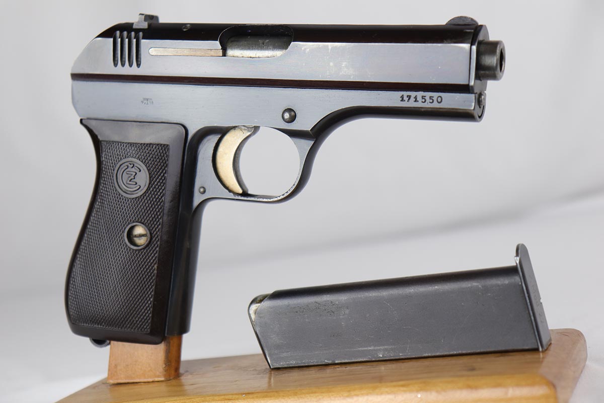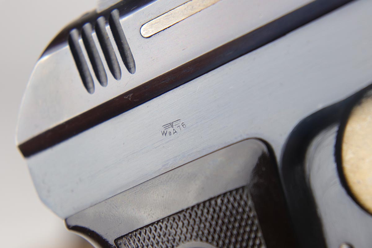 7/19/18 – This is a very nice, high-polish CZ model 27 pistol, manufactured in the early 40s for use by the German Army.  The slide has a nice plum hue to it, and contrasts the bright blue of the frame nicely.  About 95-96% original blue remains, with an area of finish loss in front of the ejection port, and some thinning on the trigger guard/front strap.  Excellent original grip with no chips or cracks.  All matching pistol with very nice bore.