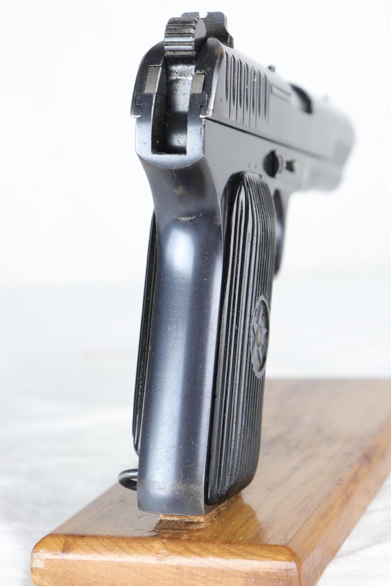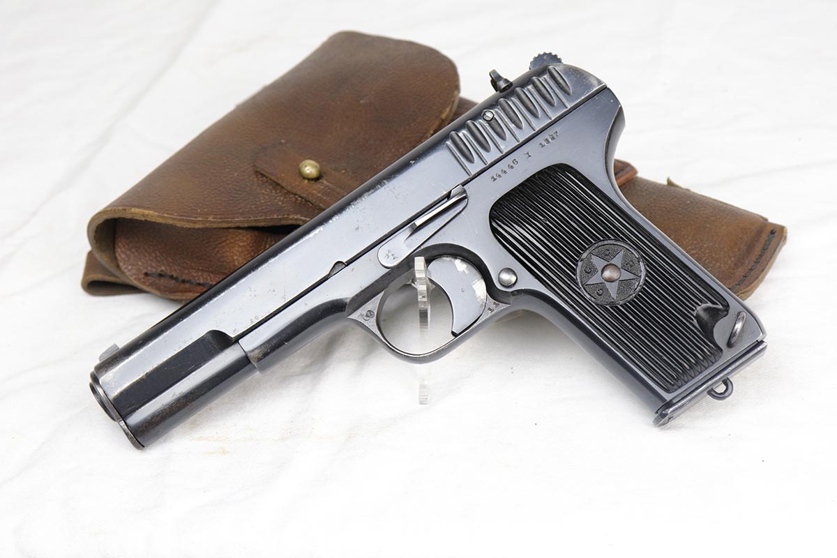 3/29/18 – This is one of the better early Russian TT33 pistols we’ve seen, in excellent original condition and retaining around 93-94% of its original high luster blue with just a couple of minor spots of holster wear as per pictures and no pitting evident anywhere.. The grips and the bore are excellent as well. The gun is all matching, including the frame, barrel, slide and the hammer group. The gun comes with its original excellent 1937 dated and maker marked holster. 1937 dated TT33 pistols in this condition are very uncommon and are a dark reminder of Stalin’s purges that took place the same year the gun was made.