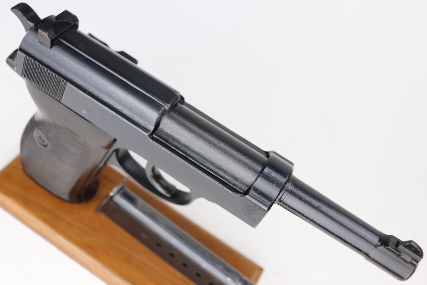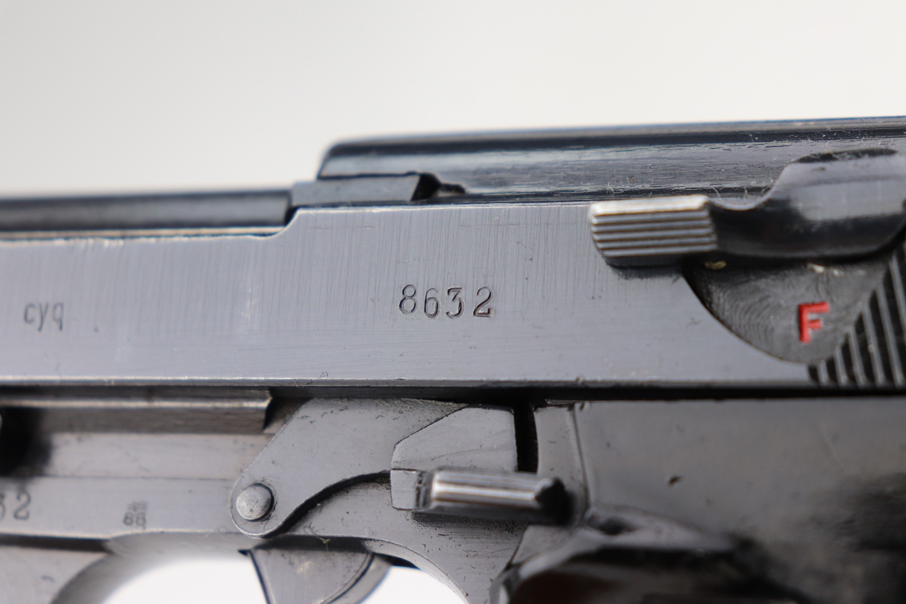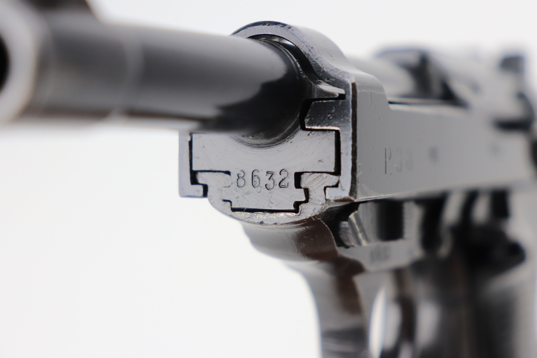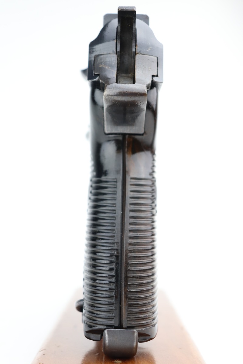2/25/21 – This is an excellent example of a Spreewerk P.38 issued to the Nazi military in 1942. This is an early gun, made in late 1942, the first year of production. The gun is all matching and has the proper “Eagle 88” military proofs. There is very minor thinning and and oxidation on the front strap and minor wear around the muzzle. One spot of discoloration on the top plate. It comes with excellent grips and one period-correct magazine. The bore is mint. De-cocker is functional.