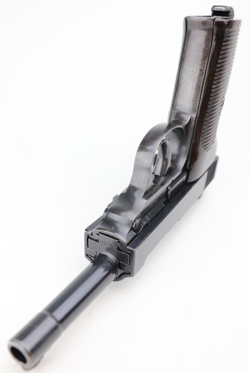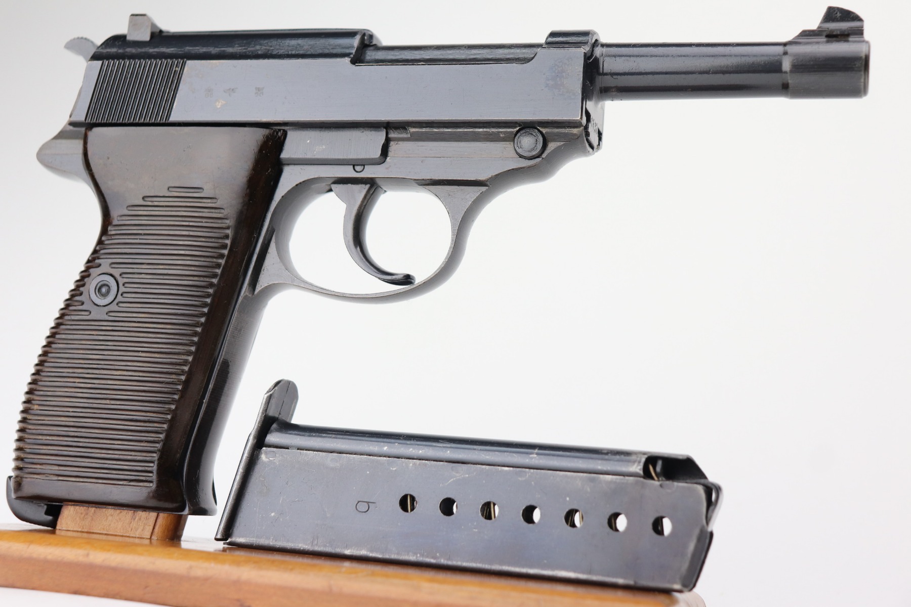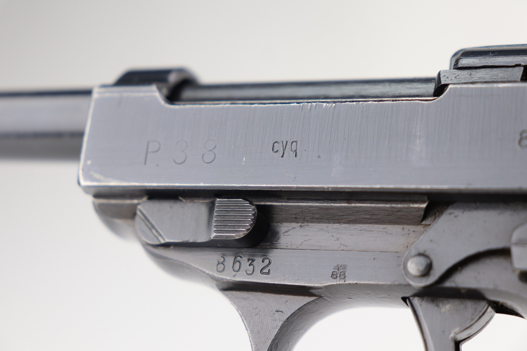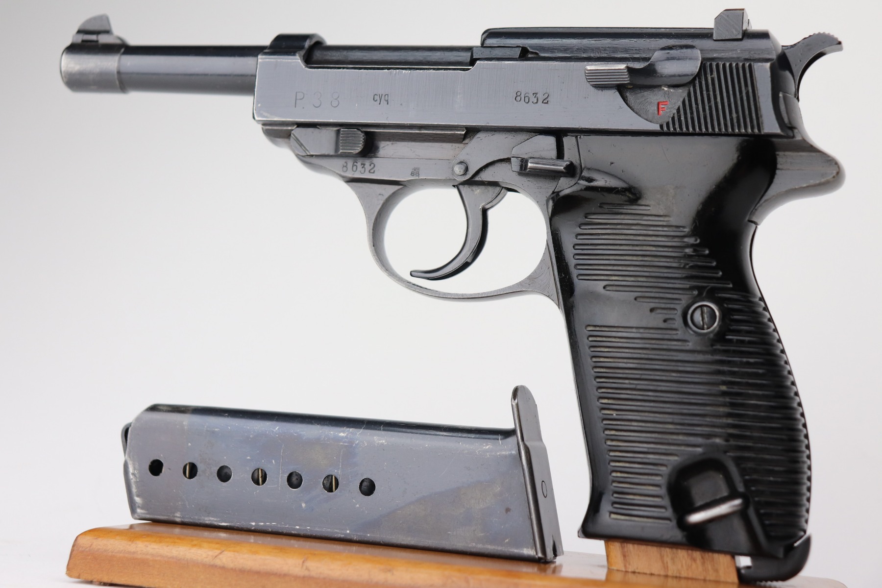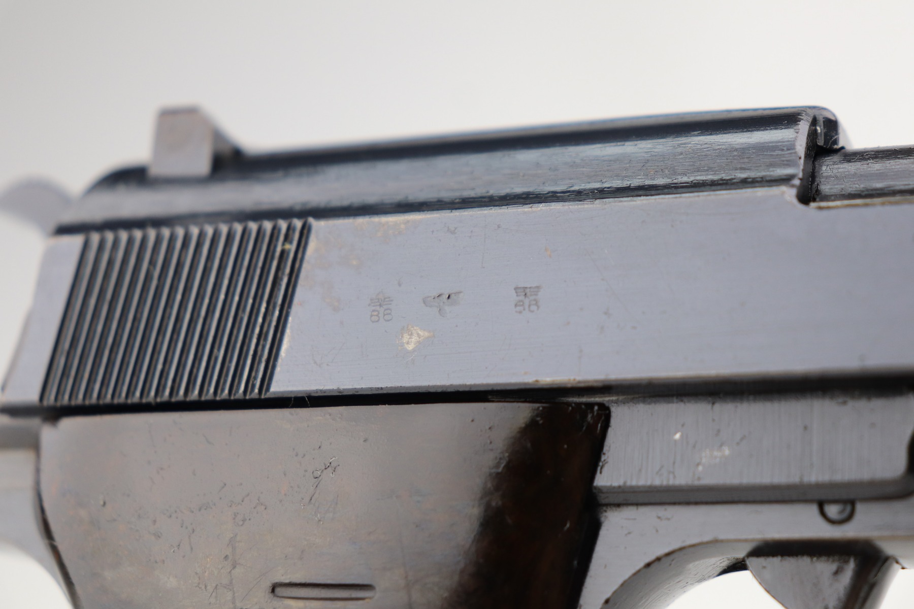 2/25/21 – This is an excellent example of a Spreewerk P.38 issued to the Nazi military in 1942. This is an early gun, made in late 1942, the first year of production. The gun is all matching and has the proper “Eagle 88” military proofs. There is very minor thinning and and oxidation on the front strap and minor wear around the muzzle. One spot of discoloration on the top plate. It comes with excellent grips and one period-correct magazine. The bore is mint. De-cocker is functional.
