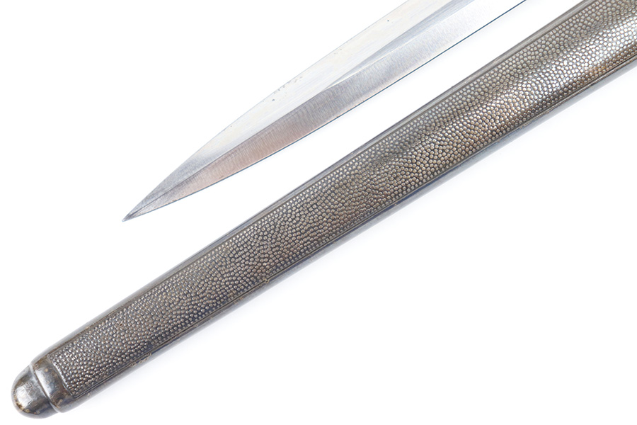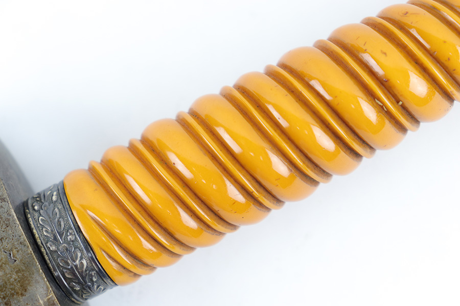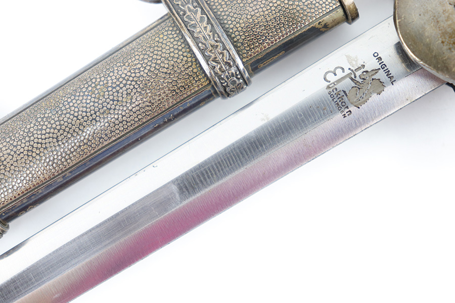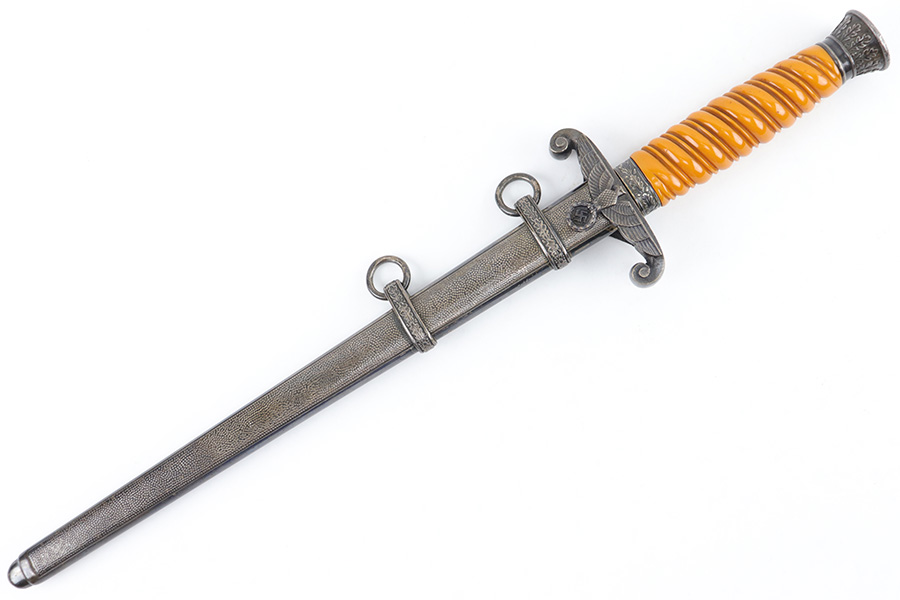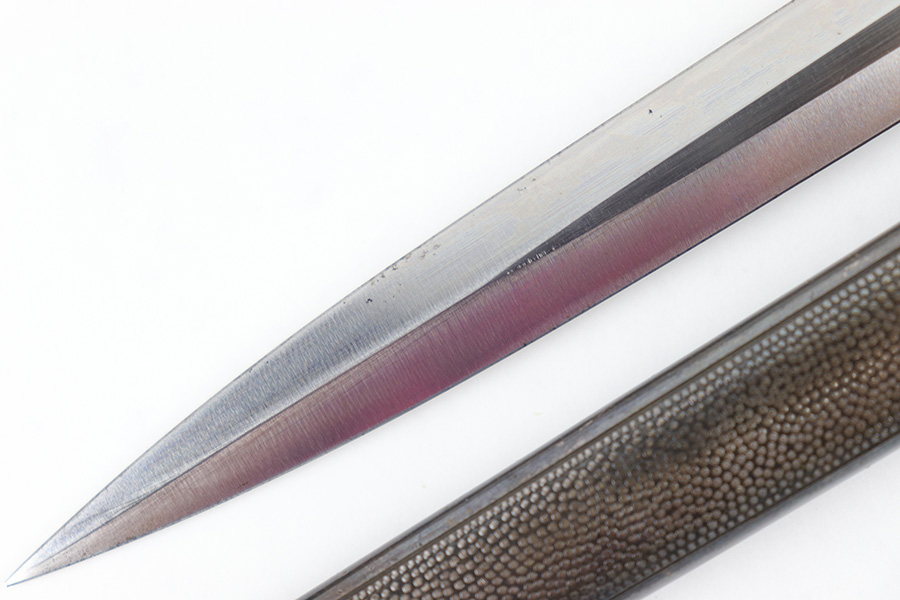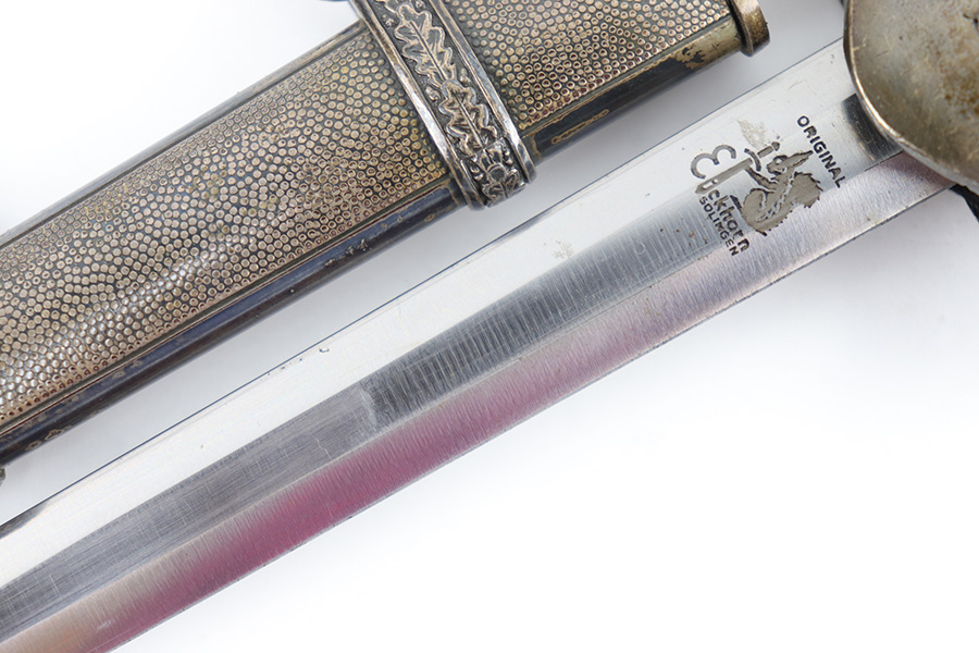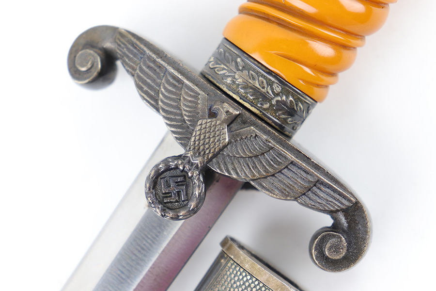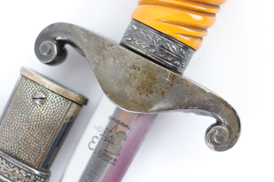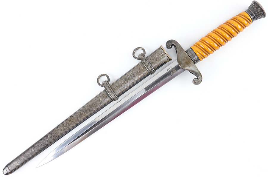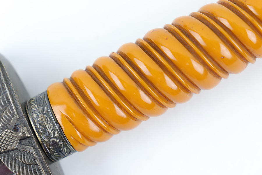 5/26/23 – This is an original WW2 German Army dagger produced by Eickhorn. This example is in excellent overall condition. The blade is very clean with visible cross graining and minimal surface speckling and some light patina. The hand guard and pommel both retain some of their original finish, although there is some mild surface patina and light edge wear on both. The burnt-orange colored bakelite handle has no cracks or chips. The only flaw on this offering is found on the scabbard. The lower ring is loose and not secure – see photos. Otherwise the scabbard is in great condition with some original finish intact, and no dents.