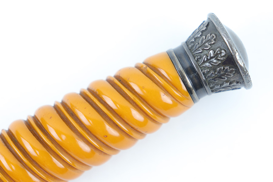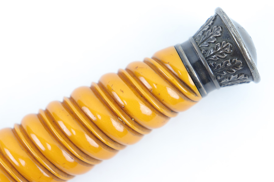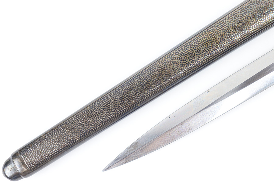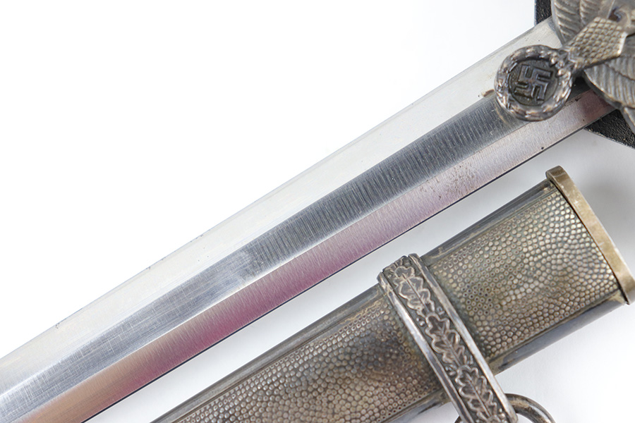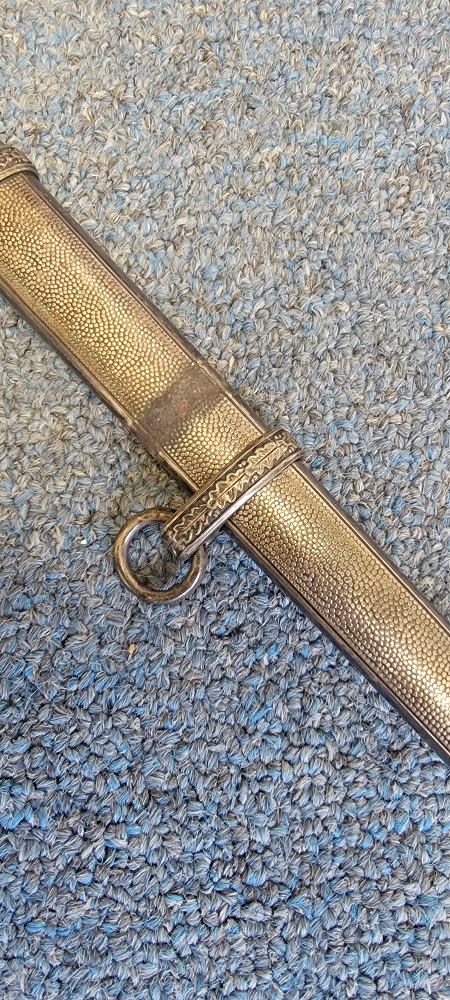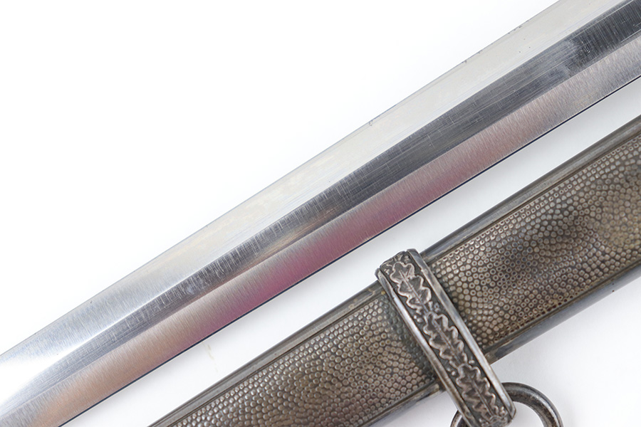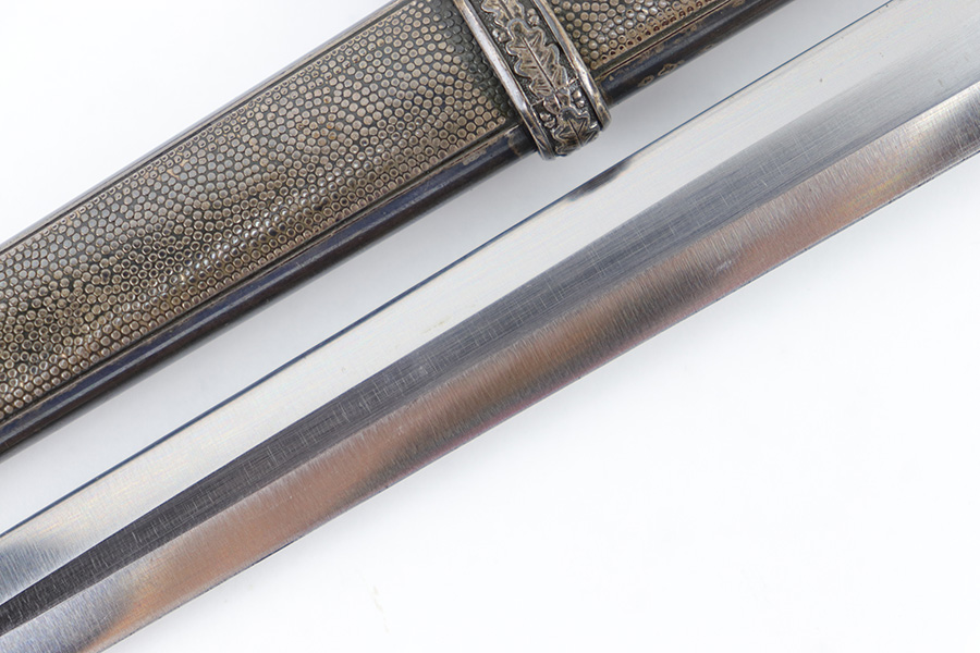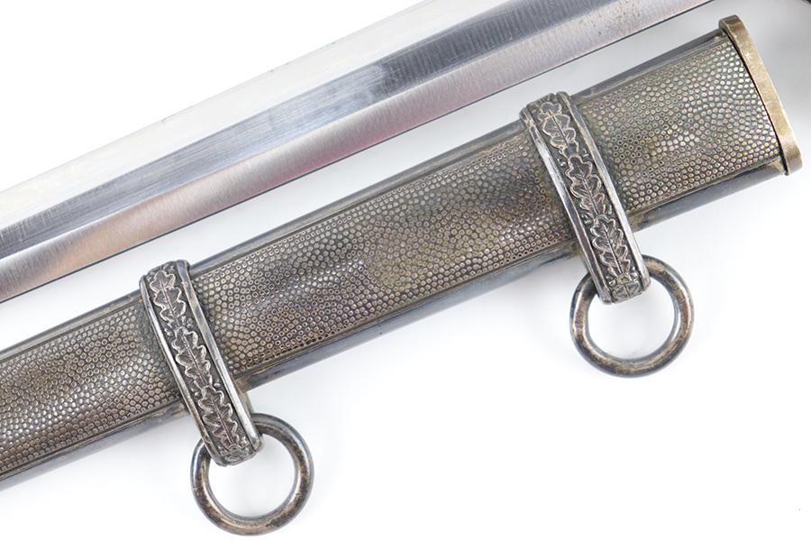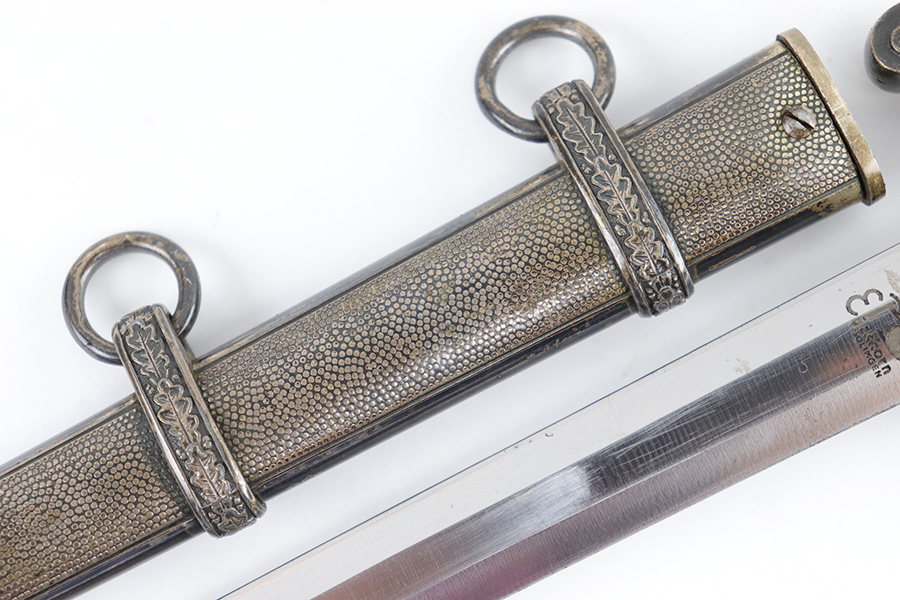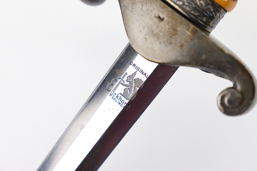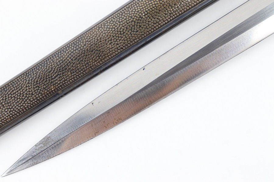 5/26/23 – This is an original WW2 German Army dagger produced by Eickhorn. This example is in excellent overall condition. The blade is very clean with visible cross graining and minimal surface speckling and some light patina. The hand guard and pommel both retain some of their original finish, although there is some mild surface patina and light edge wear on both. The burnt-orange colored bakelite handle has no cracks or chips. The only flaw on this offering is found on the scabbard. The lower ring is loose and not secure – see photos. Otherwise the scabbard is in great condition with some original finish intact, and no dents.