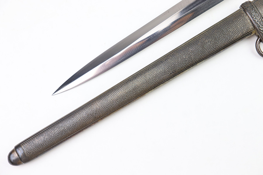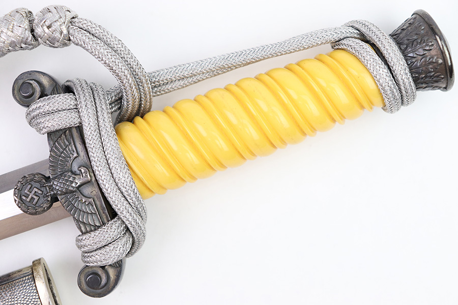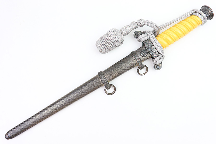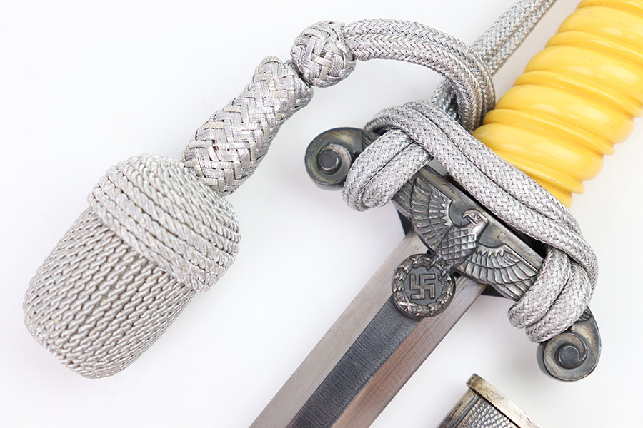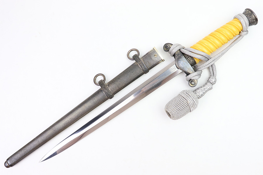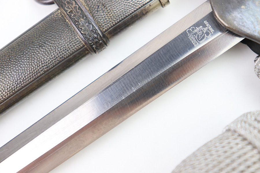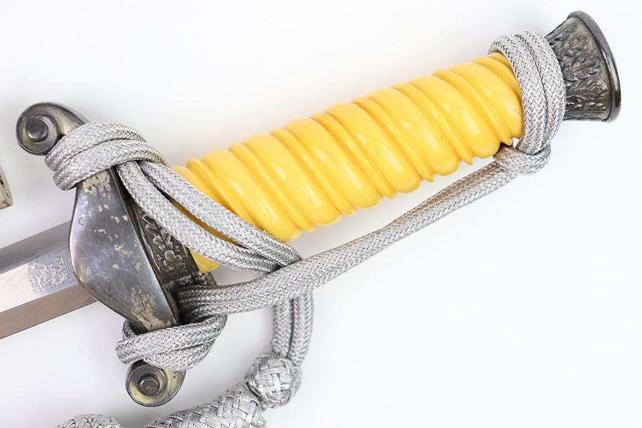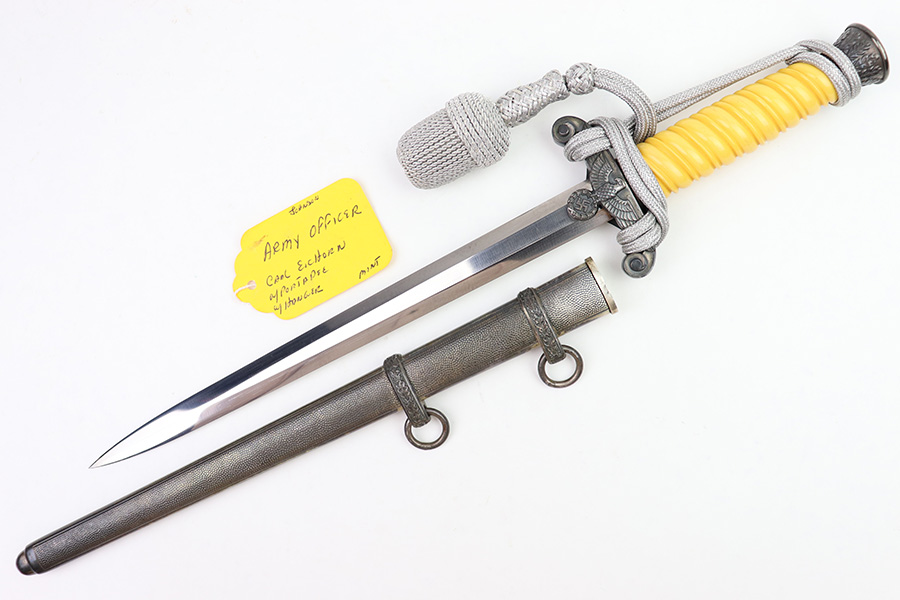 8/15/22 – This is a high-end collectible German Army Officer Dagger with an original scabbard and silver portepee. The dagger blade is in minty condition with visible cross-graining and minimal surface wear. There’s some mild spots of discoloration and light scabbard wear. Maker stamped by Eickhorn on one side. The hand guard and pommel both retain some of the original finish, and have mild surface patina. The bakelite handle has no chord wrapping, but there are no cracks or chips on the bakelite. The portepee is clean and excellent with a tight knot and no chord fraying. The scabbard is also excellent with some of the original finish still intact as shown. Comes with a 1990 dated tag from Thomas Whittmann.