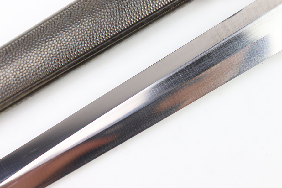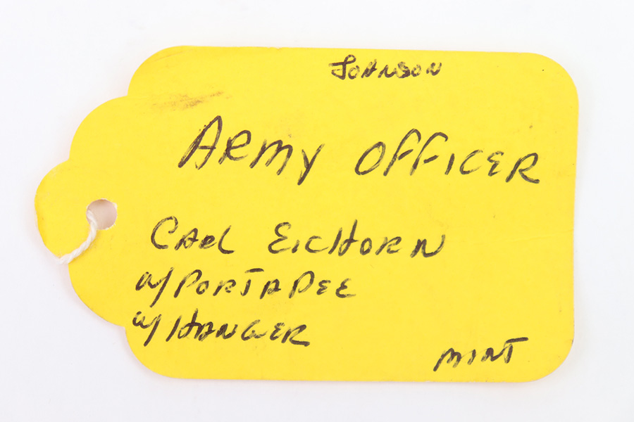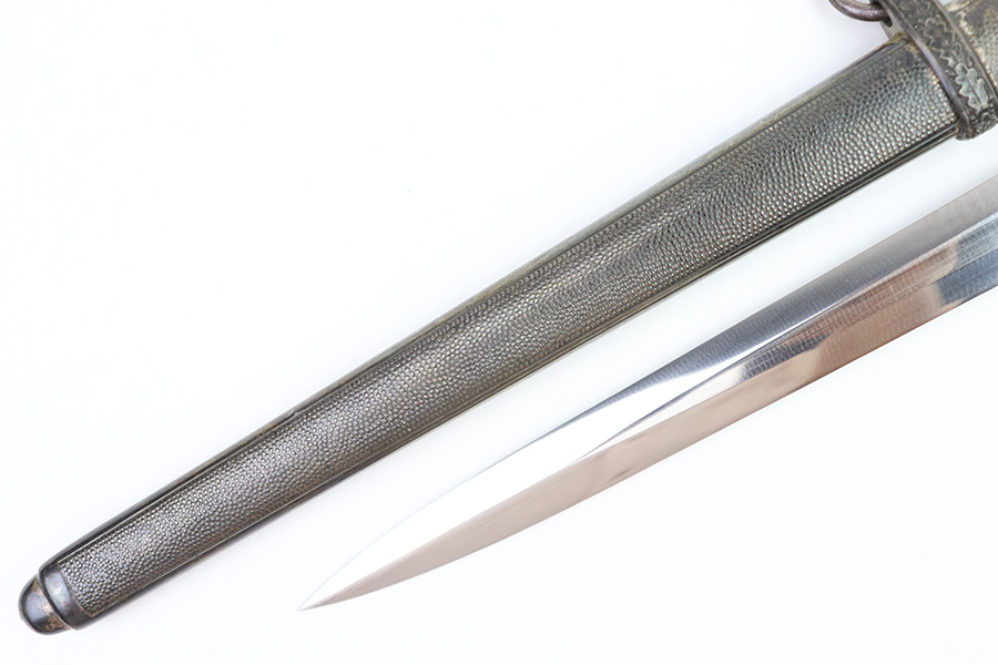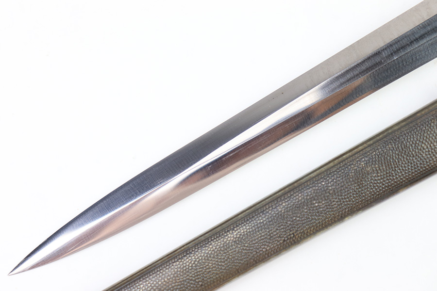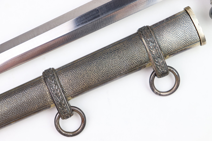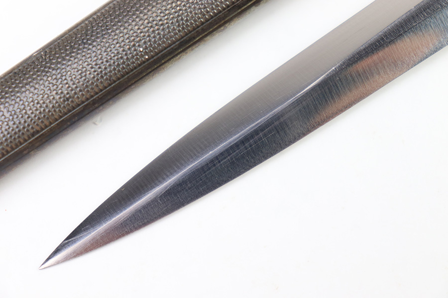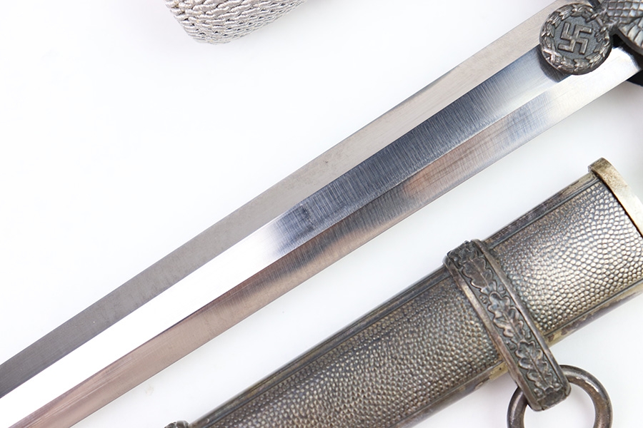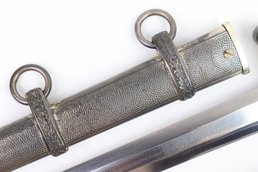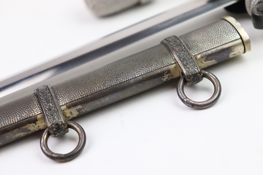 8/15/22 – This is a high-end collectible German Army Officer Dagger with an original scabbard and silver portepee. The dagger blade is in minty condition with visible cross-graining and minimal surface wear. There’s some mild spots of discoloration and light scabbard wear. Maker stamped by Eickhorn on one side. The hand guard and pommel both retain some of the original finish, and have mild surface patina. The bakelite handle has no chord wrapping, but there are no cracks or chips on the bakelite. The portepee is clean and excellent with a tight knot and no chord fraying. The scabbard is also excellent with some of the original finish still intact as shown. Comes with a 1990 dated tag from Thomas Whittmann.