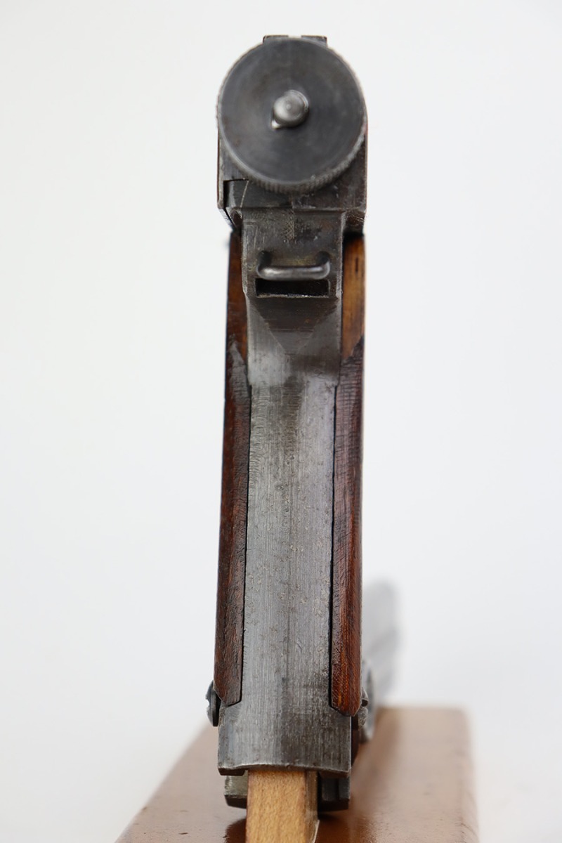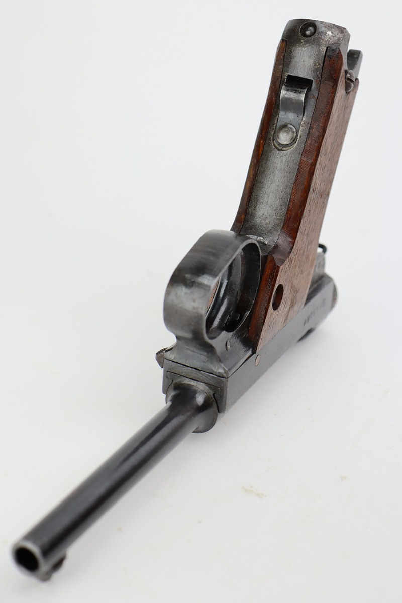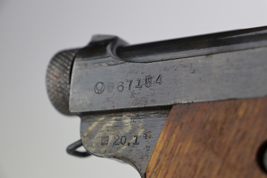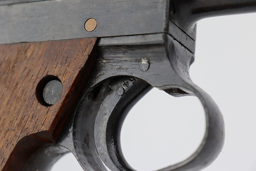 8/1/23 – This is an excellent example of an end-of-war Nambu Type 14, manufactured in January of 1945. All matching with the proper late-war features. Comes with one original matching-numbered magazine. The gun has retained about 97% of its original finish with just hints of thinning on the grip straps. Fitted with excellent, matching-numbered, late-war, slab-style grips. Mint bore.