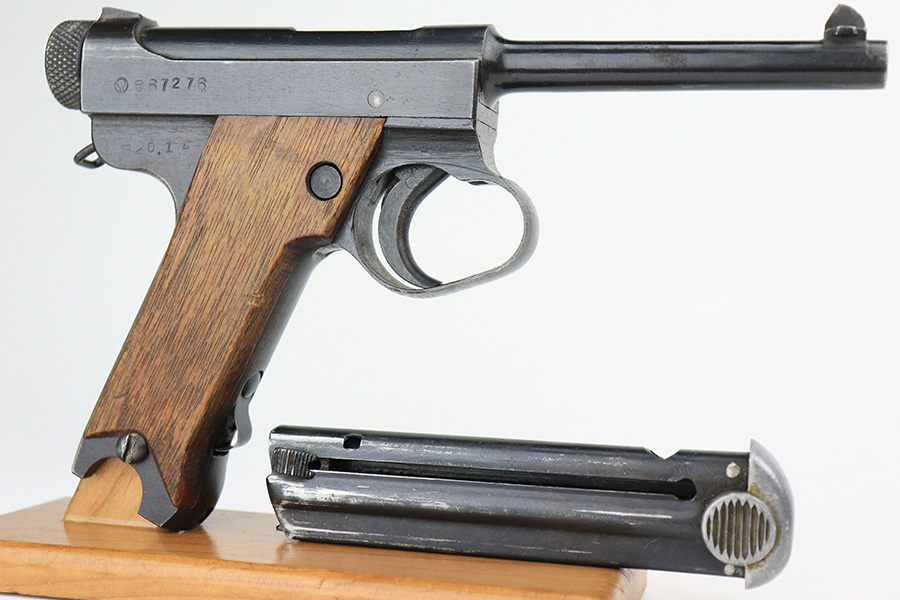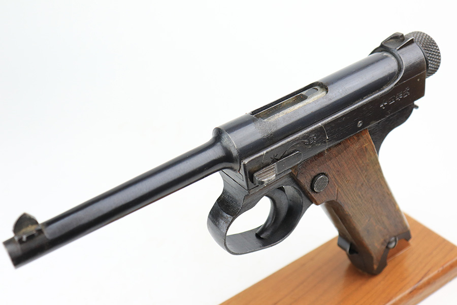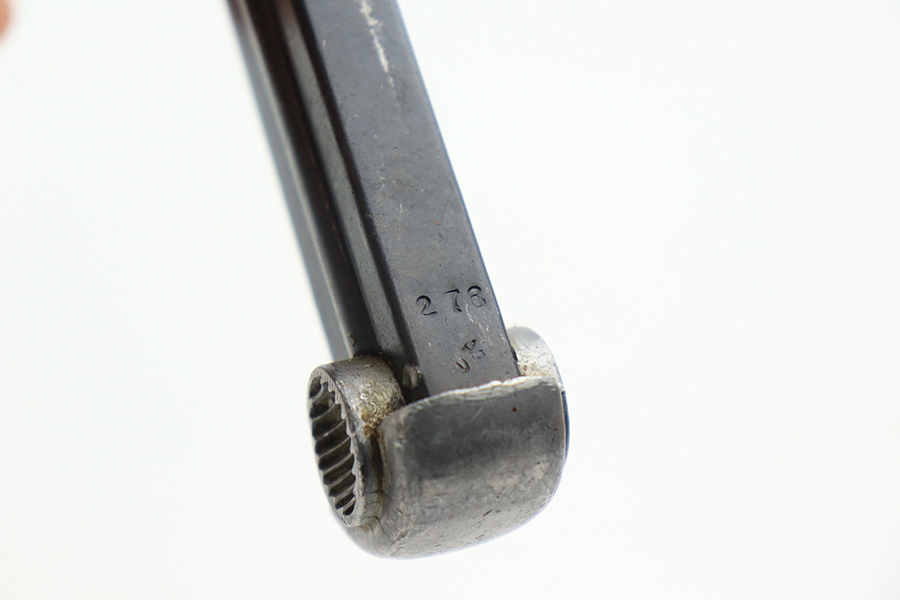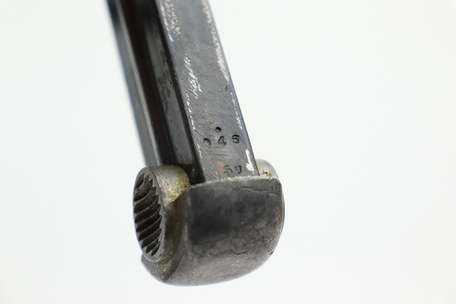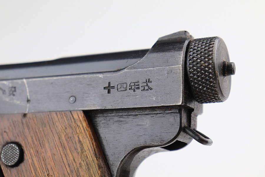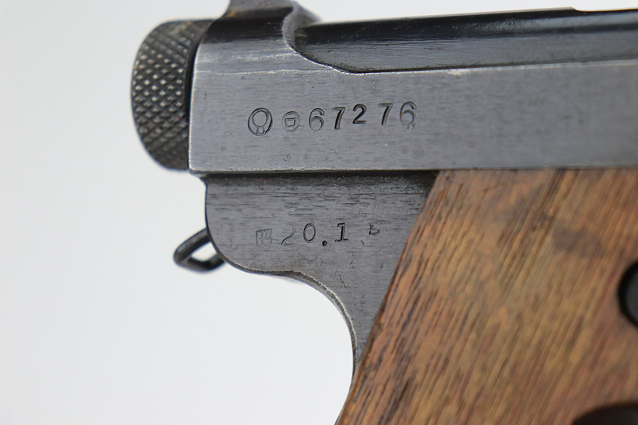 8/24/22 – This is an excellent example of a late Nambu Type 14 issued to the Japanese military towards the very end of WW2, in January of 1945. It is all matching and comes as a rig with a period-correct holster, one original matching-numbered magazine, one period-correct mismatched magazine, and cleaning rod. It also has the proper late-war slab side wood grips – matching to the gun. The gun itself has retained about 96-97% of its original finish. Most of the finish loss comes in the form of minor thinning on the grip straps. Also very minor muzzle wear and wear near the safety lever. There are some late-war casting flaws near the ejection port. Mint bore.