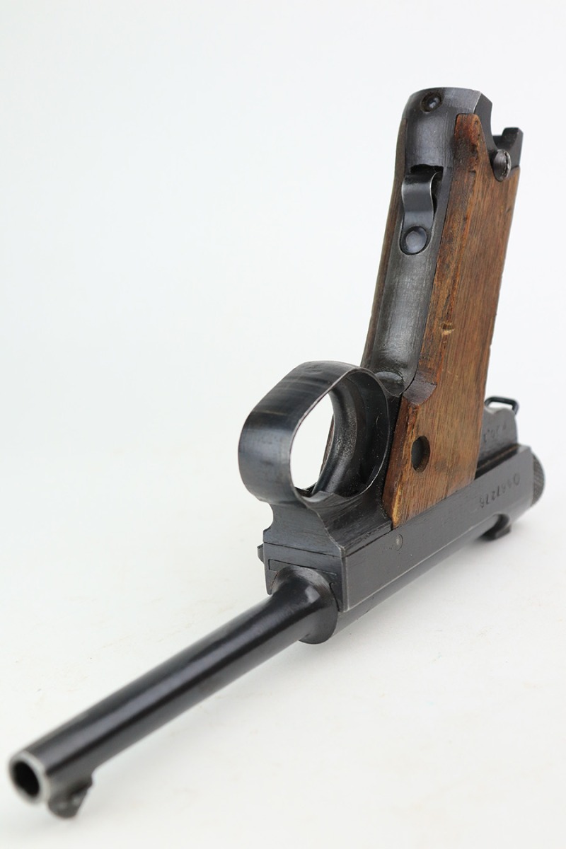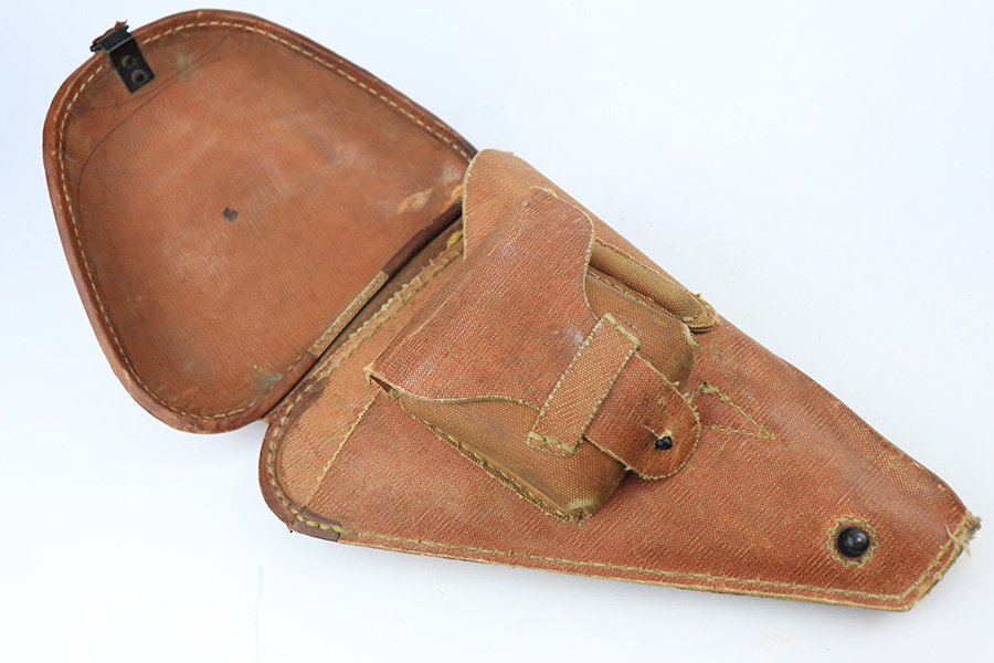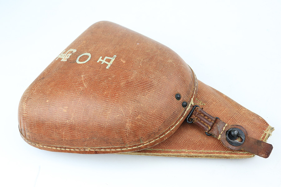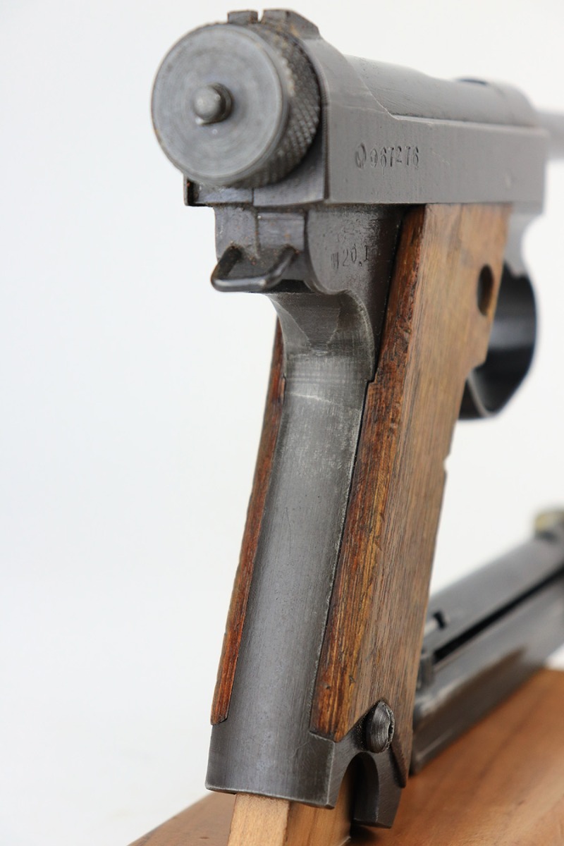 8/24/22 – This is an excellent example of a late Nambu Type 14 issued to the Japanese military towards the very end of WW2, in January of 1945. It is all matching and comes as a rig with a period-correct holster, one original matching-numbered magazine, one period-correct mismatched magazine, and cleaning rod. It also has the proper late-war slab side wood grips – matching to the gun. The gun itself has retained about 96-97% of its original finish. Most of the finish loss comes in the form of minor thinning on the grip straps. Also very minor muzzle wear and wear near the safety lever. There are some late-war casting flaws near the ejection port. Mint bore.