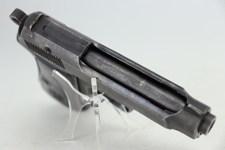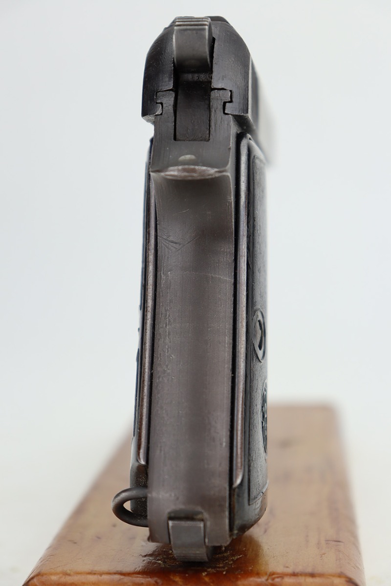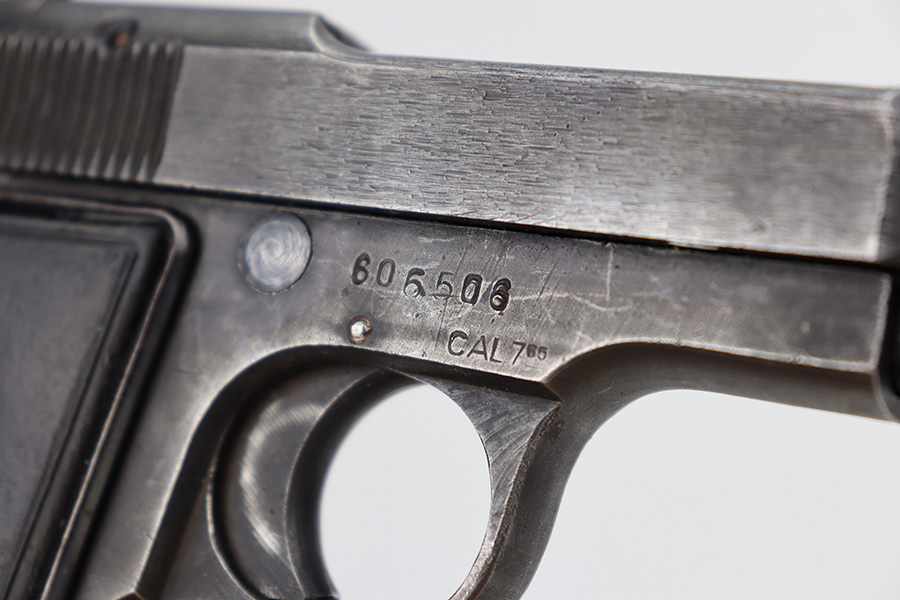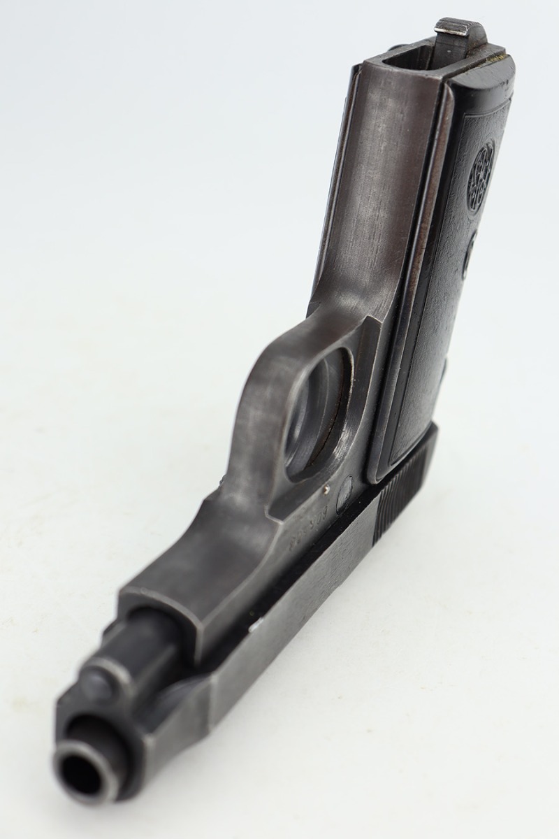 12/27/23 – This is an excellent example of a Beretta Model 1935, manufactured at the end of WW2. It is matching and has the proper late-war characteristics, such as rough machining, no slide legend, and a “CAL 7.65” marking on the right side of the frame. There is a “4UT” proof on the tang, indicating it was issued to the Nazi military. It has retained about 97% of its original late-war finish with just minor high edge wear. Excellent black bakelite grips and comes with a period-correct magazine. Minty bore.