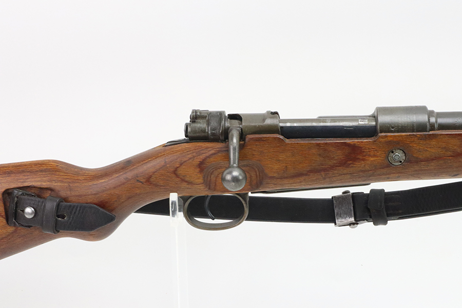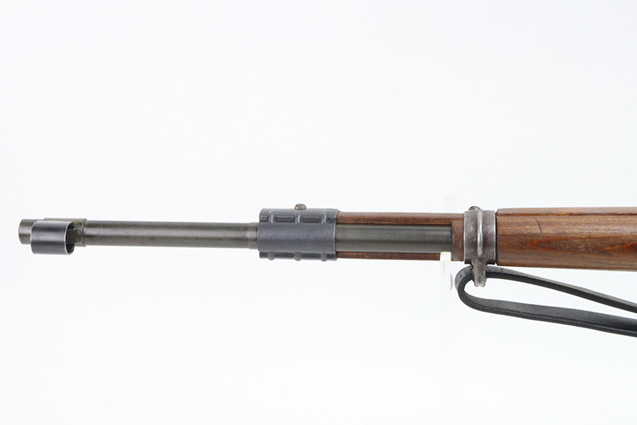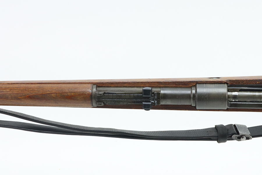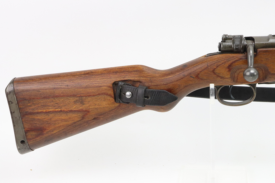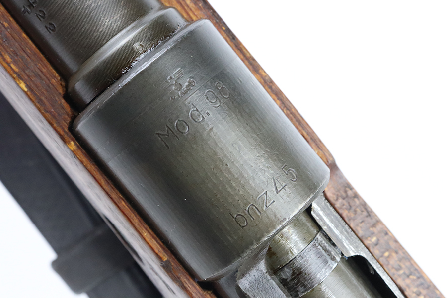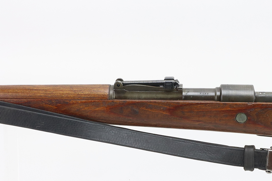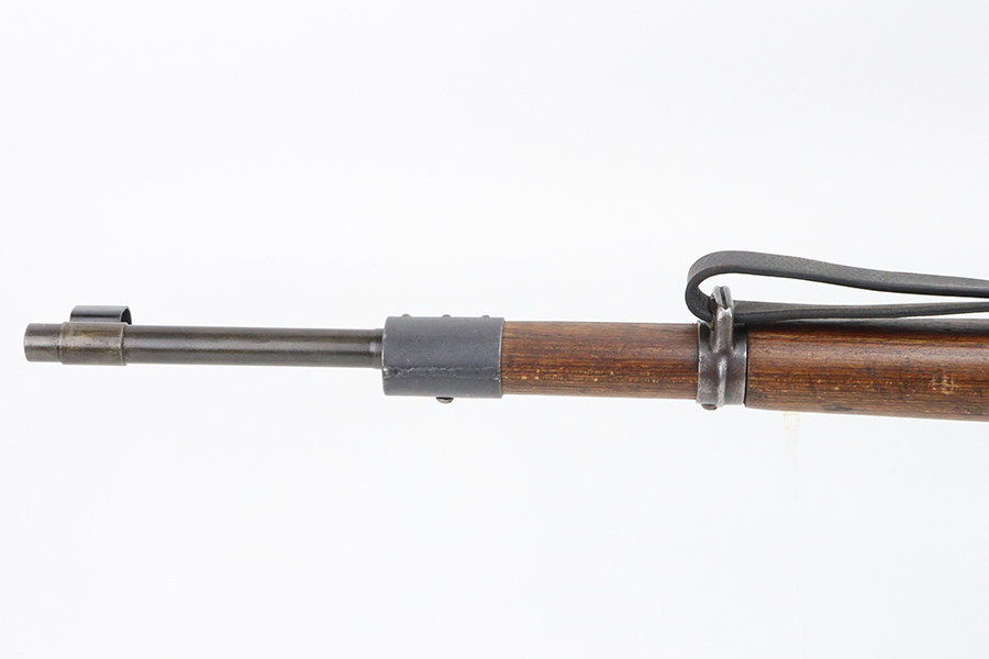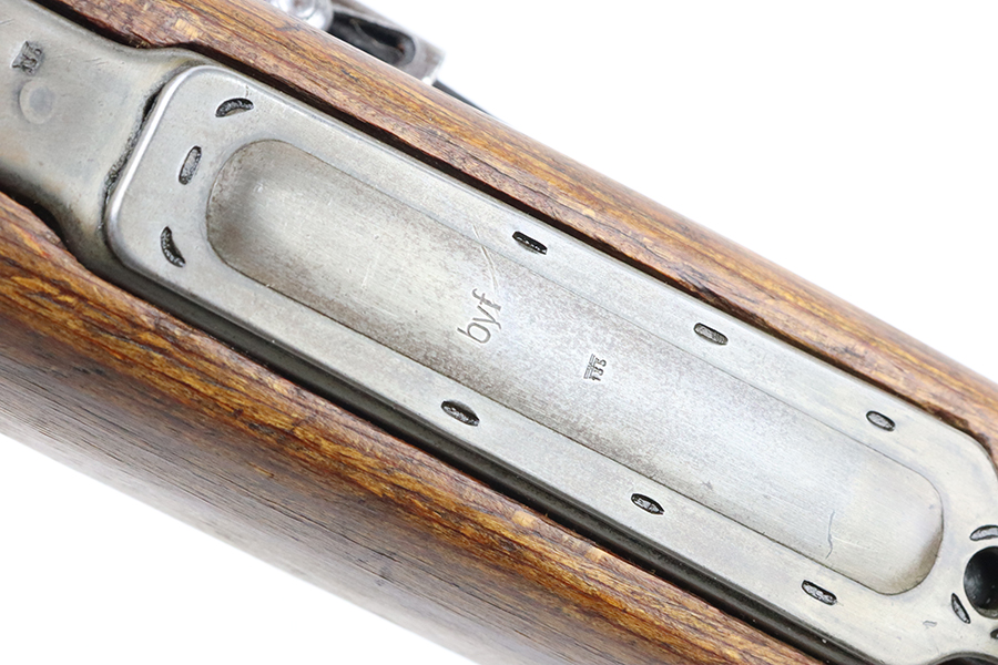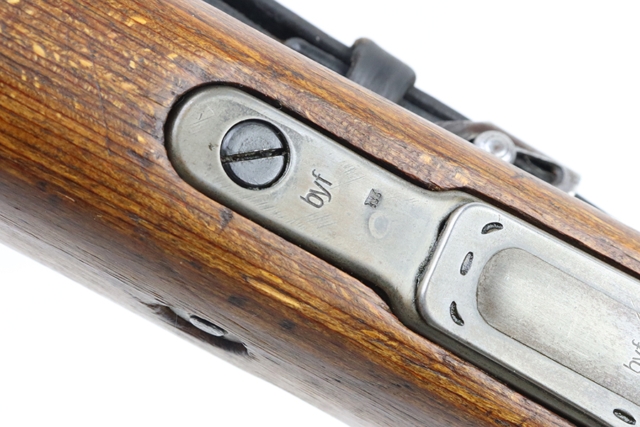 4/8/24 – This is an excellent example of an end-of-war Steyr BNZ 45 Kriegsmodell rifle issued to the Nazi military in 1945. It is all matching and has the proper characteristics for this variation: “Waffen 623” proofs throughout, mixture of phosphate and blued parts, no bayonet lug, screw-fastened barrel bands, Mauser-made floor plate and trigger assembly. One waffen proof on the right side of the butt stock. The metal parts have retained about 93-95% of their original finish. Most of the wear is on the rear barrel band. Excellent wood furniture. Stone-mint bore. Comes with a period-correct leather sling.