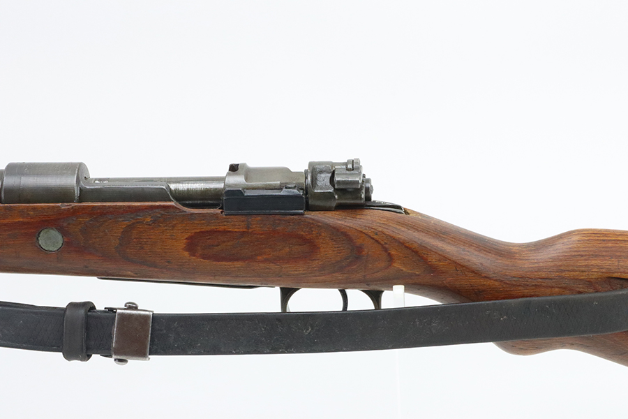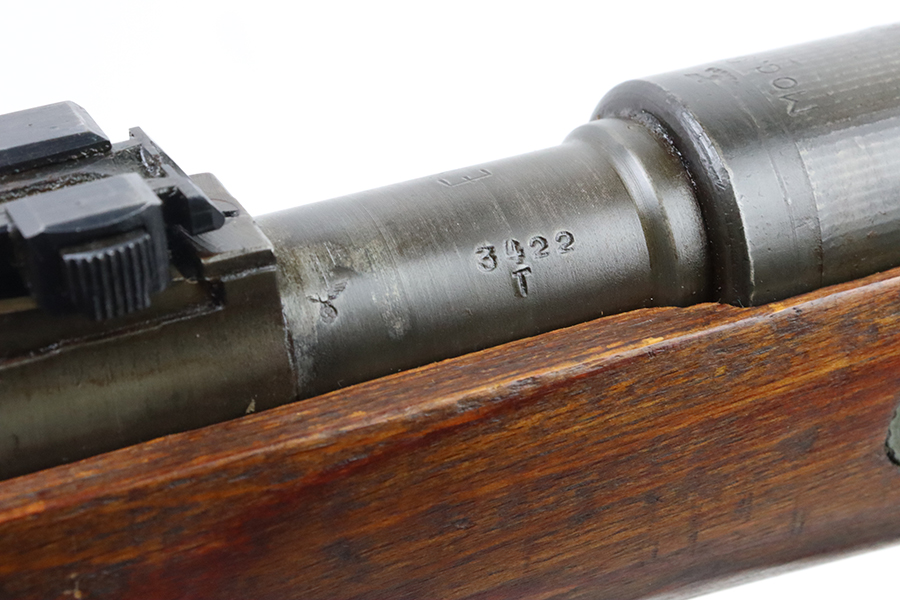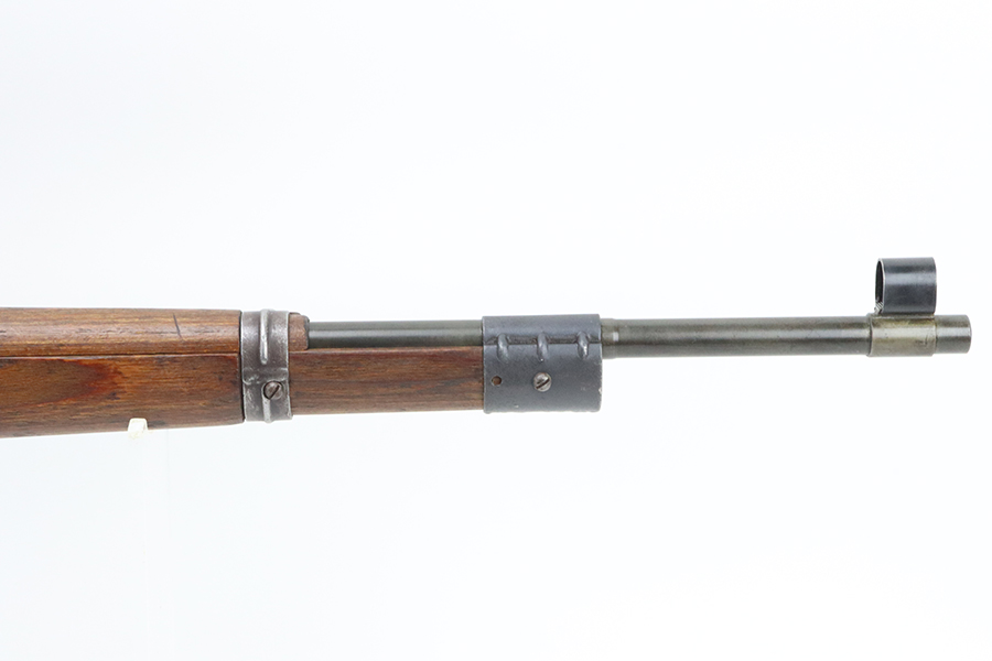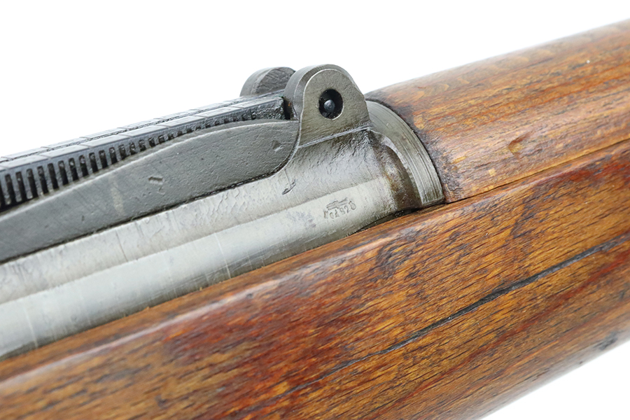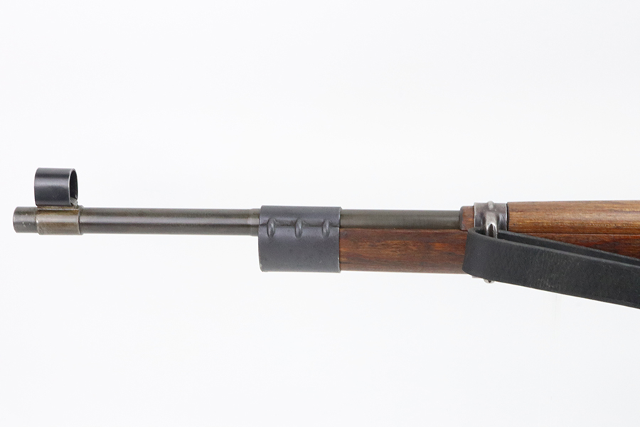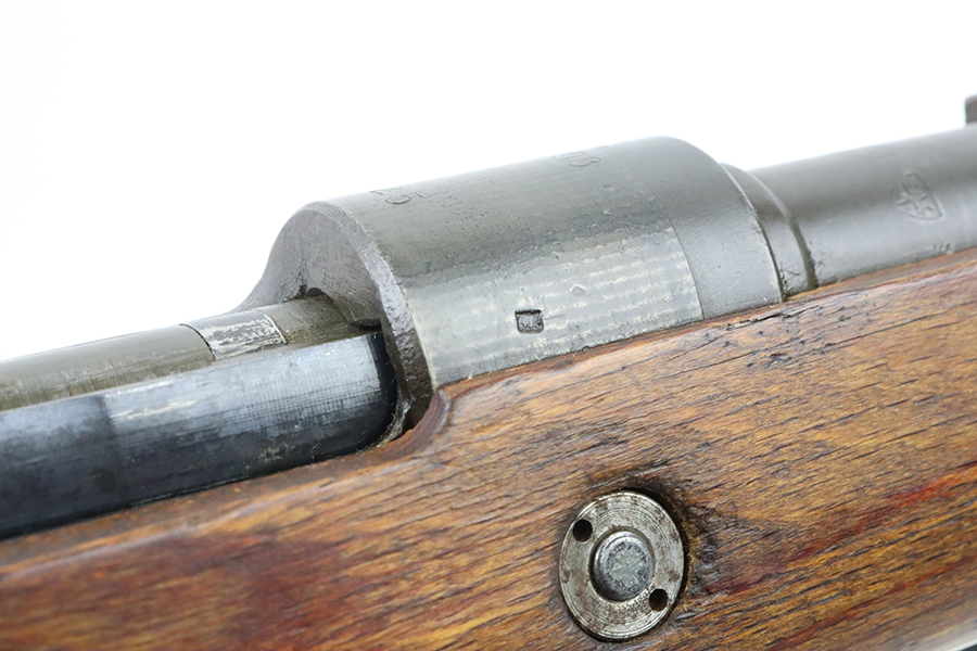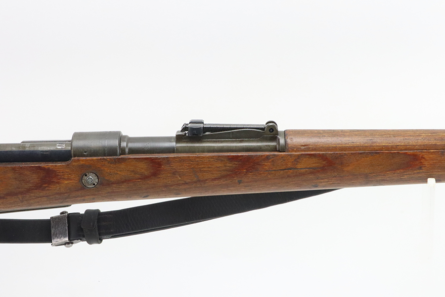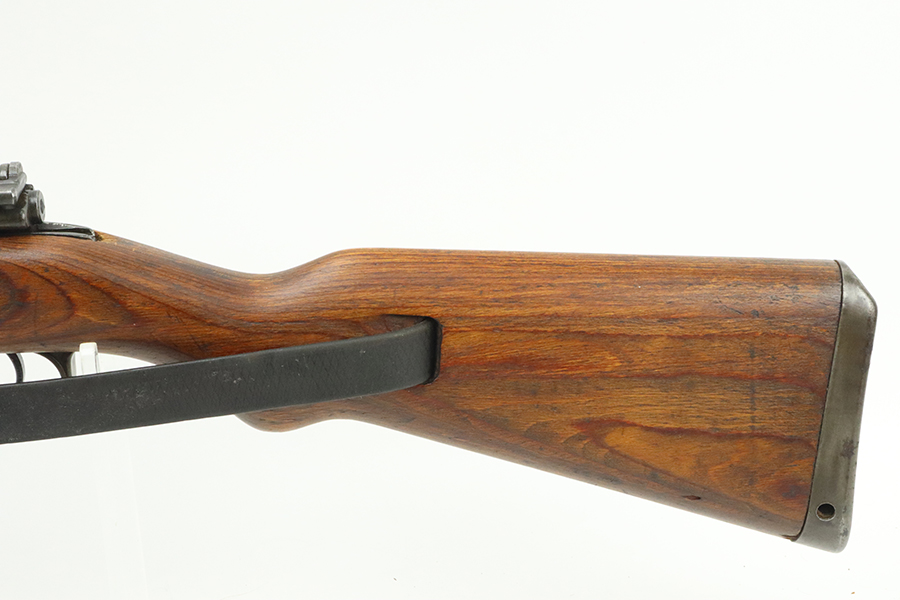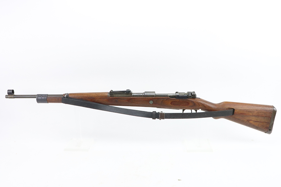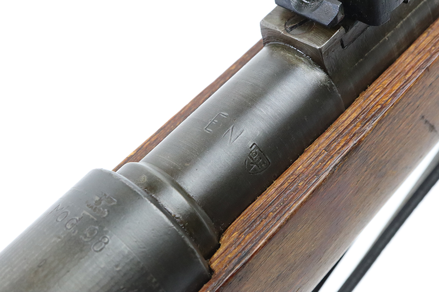 4/8/24 – This is an excellent example of an end-of-war Steyr BNZ 45 Kriegsmodell rifle issued to the Nazi military in 1945. It is all matching and has the proper characteristics for this variation: “Waffen 623” proofs throughout, mixture of phosphate and blued parts, no bayonet lug, screw-fastened barrel bands, Mauser-made floor plate and trigger assembly. One waffen proof on the right side of the butt stock. The metal parts have retained about 93-95% of their original finish. Most of the wear is on the rear barrel band. Excellent wood furniture. Stone-mint bore. Comes with a period-correct leather sling.
