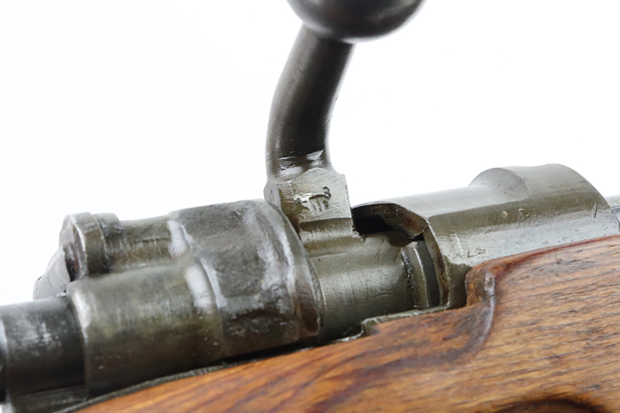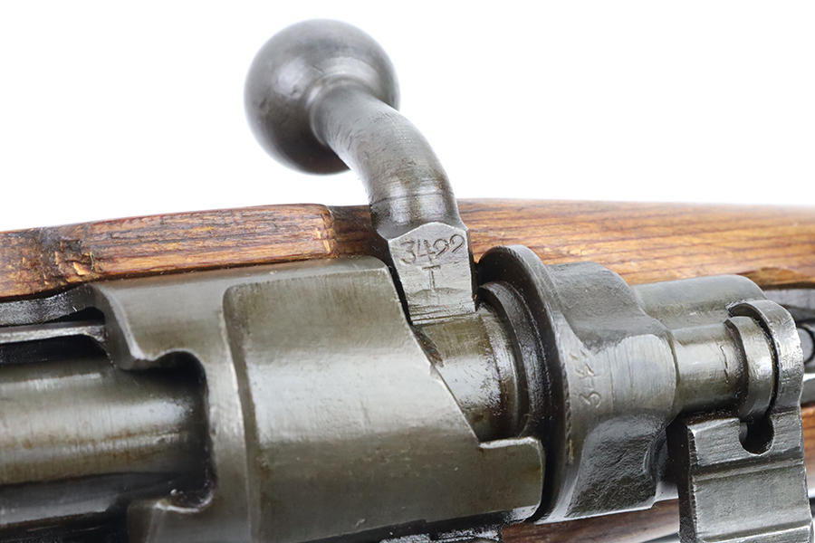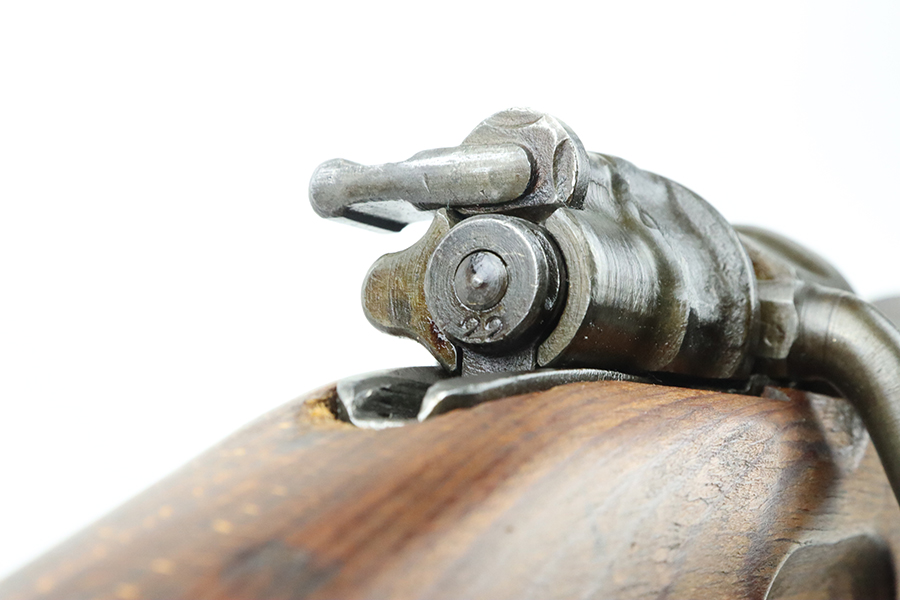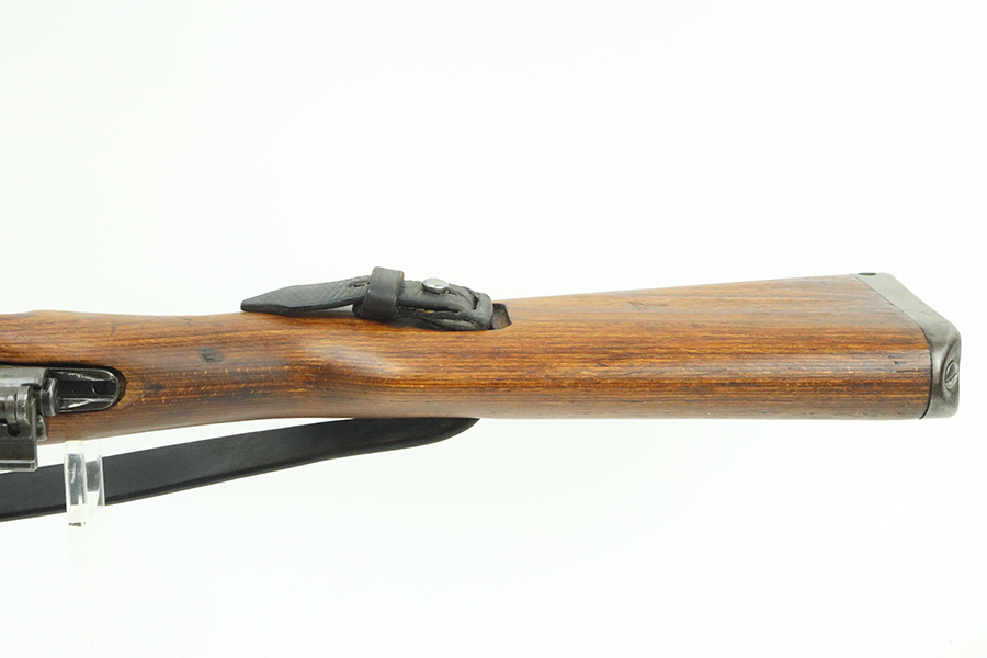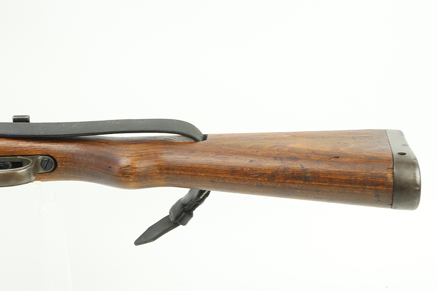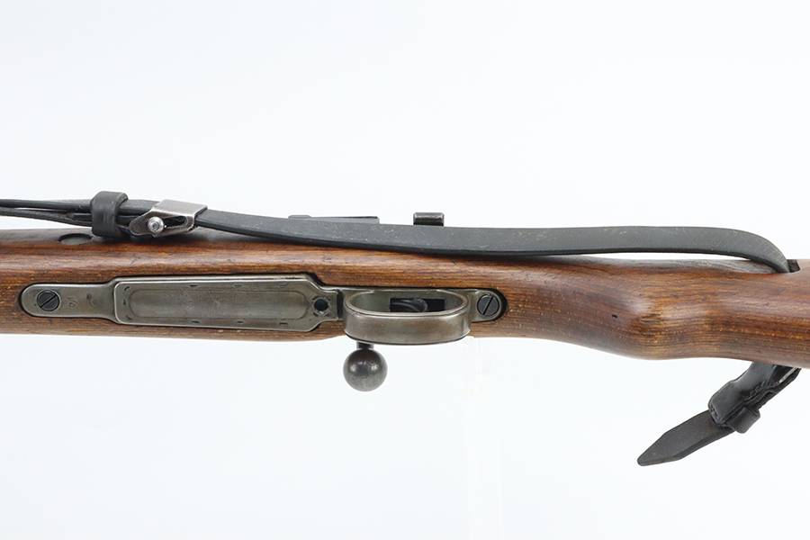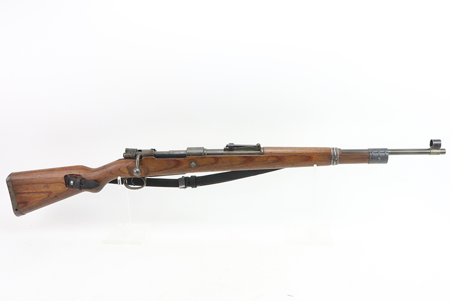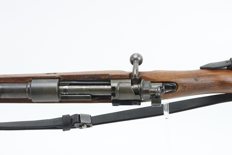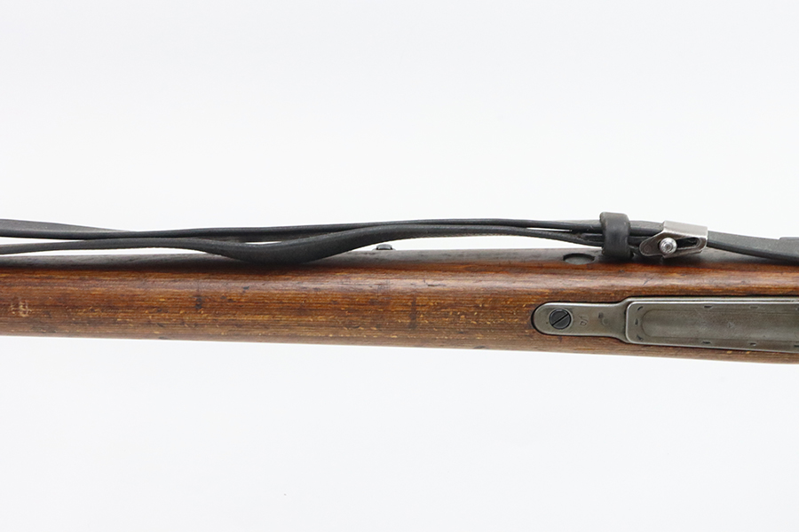 4/8/24 – This is an excellent example of an end-of-war Steyr BNZ 45 Kriegsmodell rifle issued to the Nazi military in 1945. It is all matching and has the proper characteristics for this variation: “Waffen 623” proofs throughout, mixture of phosphate and blued parts, no bayonet lug, screw-fastened barrel bands, Mauser-made floor plate and trigger assembly. One waffen proof on the right side of the butt stock. The metal parts have retained about 93-95% of their original finish. Most of the wear is on the rear barrel band. Excellent wood furniture. Stone-mint bore. Comes with a period-correct leather sling.