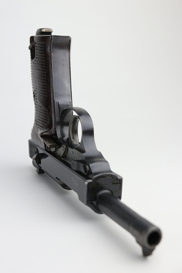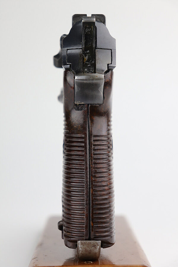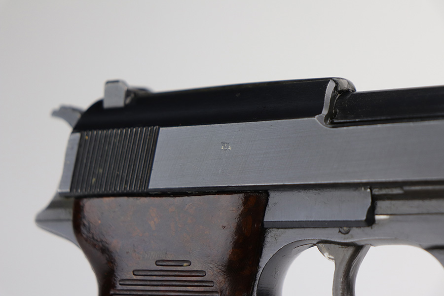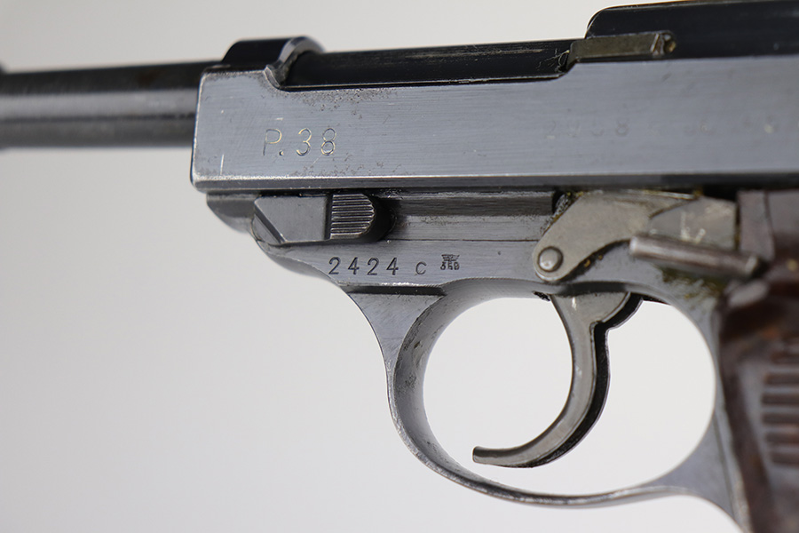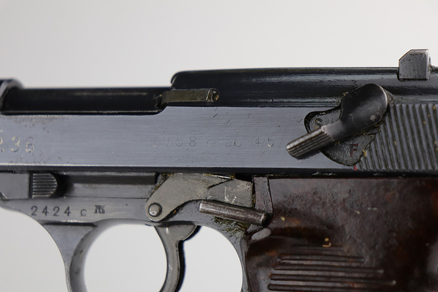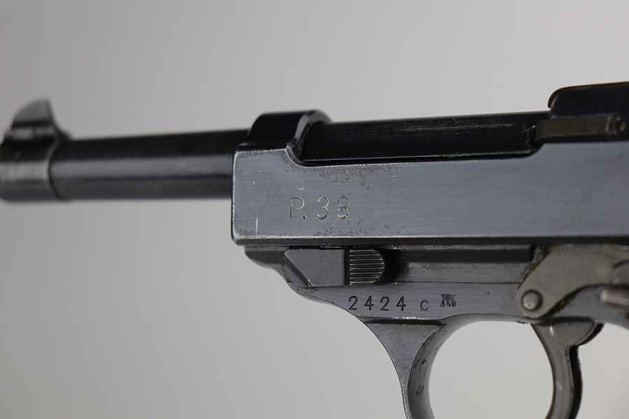 9/14/21 – This is an excellent example of a Walther P.38 made at the very end of WW2, in 1945. This is a GI-mismatched gun in the proper “C” serial block. It only has one “Eagle 359” military proof on the right side of the slide, indicating it was never actually issued to the Nazi military. It has proper end-of-war features such as phosphate small parts and a cog-style hammer. Both the barrel and locking block are un-numbered. It has retained about 96% of its original finish. There is minor wear on the high edges of the slide and around the muzzle. Some light spotty wear on the barrel. Just a hint of thinning and freckling on the front strap. Comes with excellent grips and a period-correct jvd magazine. Stone-mint bore. De-cocker is functional.